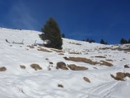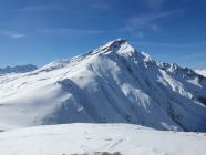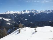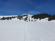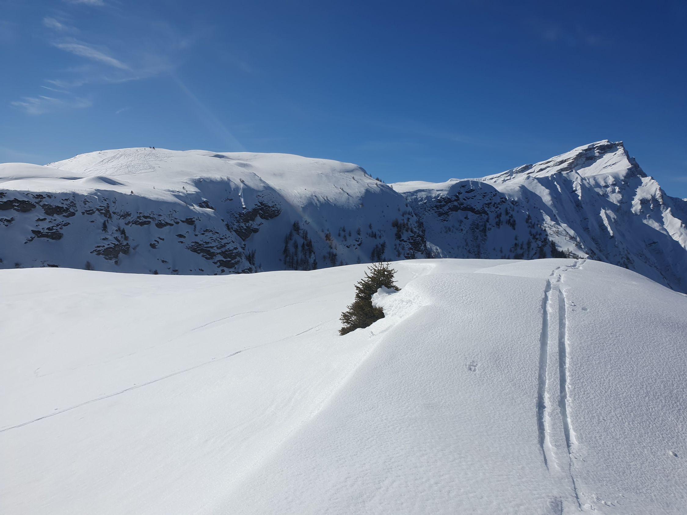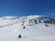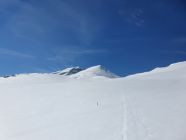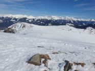 Beim Aufstieg tragender Sulz, somit komme ich schnell und ohne nennenswerte Probleme seelenalleine mit einer ganz kleinen Fellabfahrt und zuletzt unverspurt zum Scherakopf. Da eine Gruppe bei der Ankunft noch immer auf dem Rappakopf war, entscheide ich mich den ebenfalls unverspurten Crapschalvakopf noch mitzunehmen. Mit einem kleinen Umweg, der Wildruhezone zuliebe, fahre ich mit den Fellen noch kurz zum Crapschalvakopf hinab.