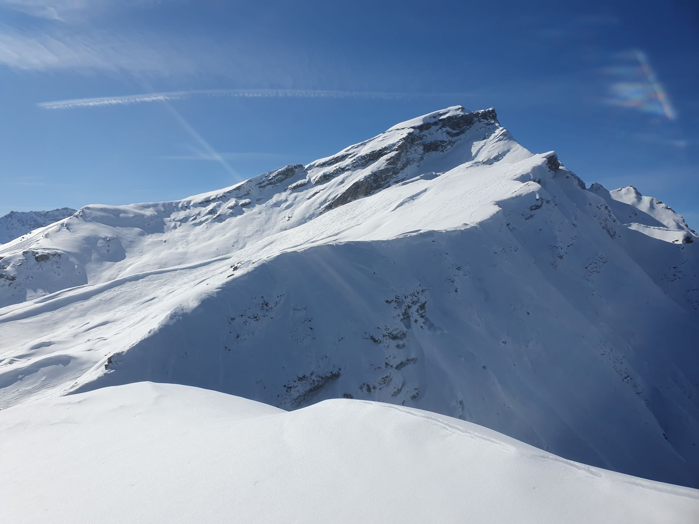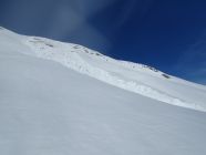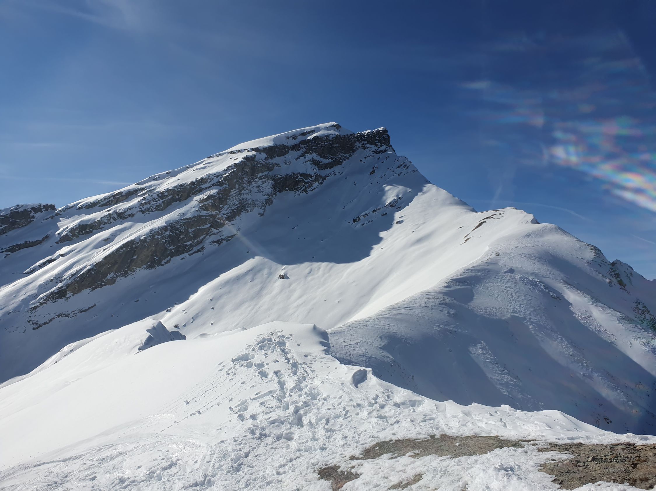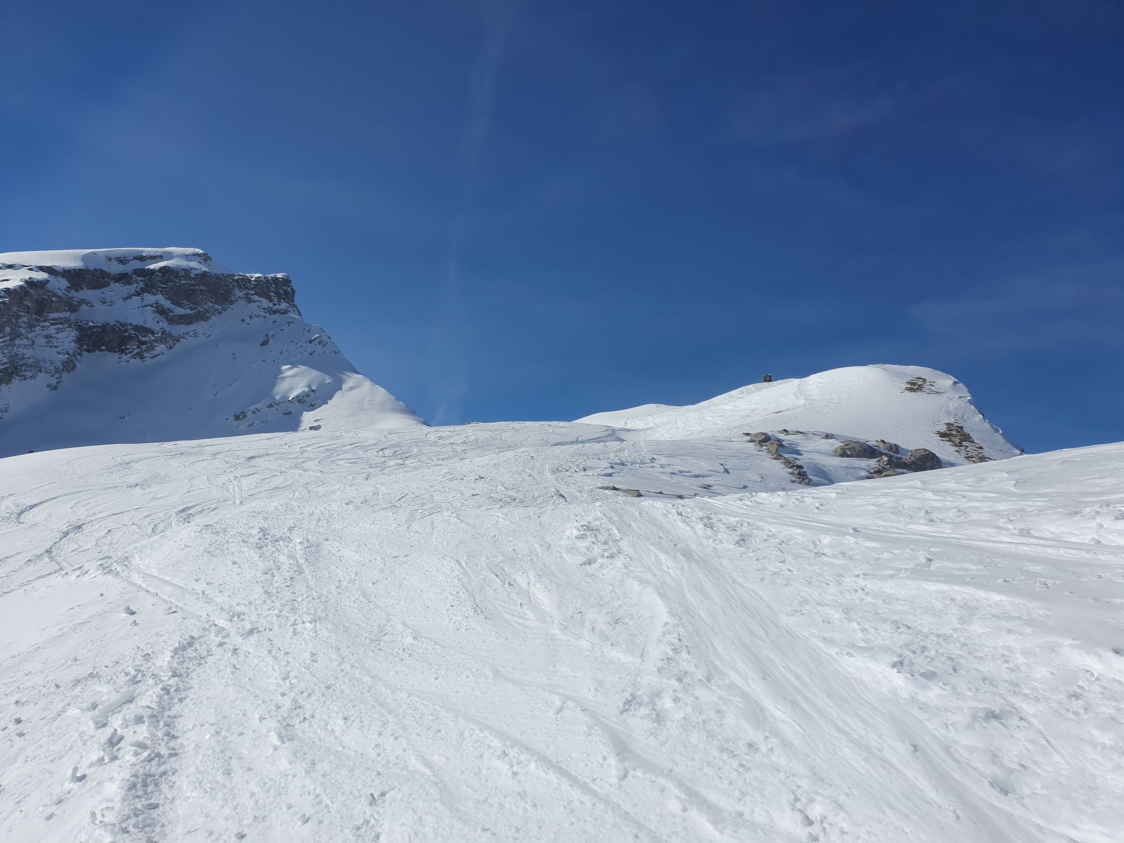 Eine Wechte versperrt mir hier die Nordsicht. Der weitete Gratverlauf nach E sieht vielversprechend aus, wäre da nicht eine kurze steile Passage zu meistern. Mein Bauchgefühl sagt nein, doch die Verlockung Zeit zu sparen war grösser. Doch nach nur 3 Meter Fellabstieg löse ich unter mir einen 10 Meter langen Rutsch aus. Ich habe schon viele Rutsche ausgelöst, aber dieser hier war doch viel zu einfach ausgelöst worden, ja, schon fast unerwartet.