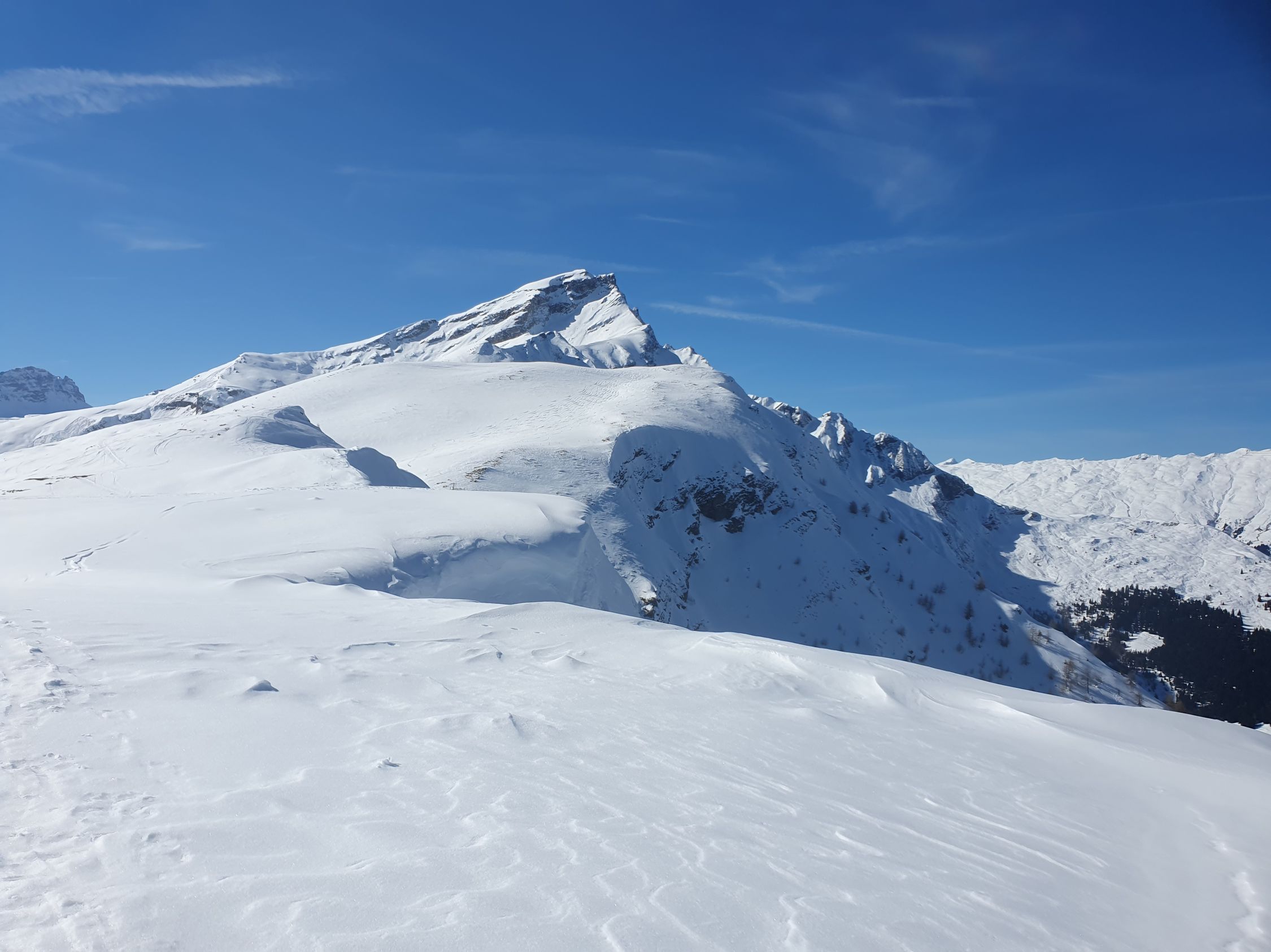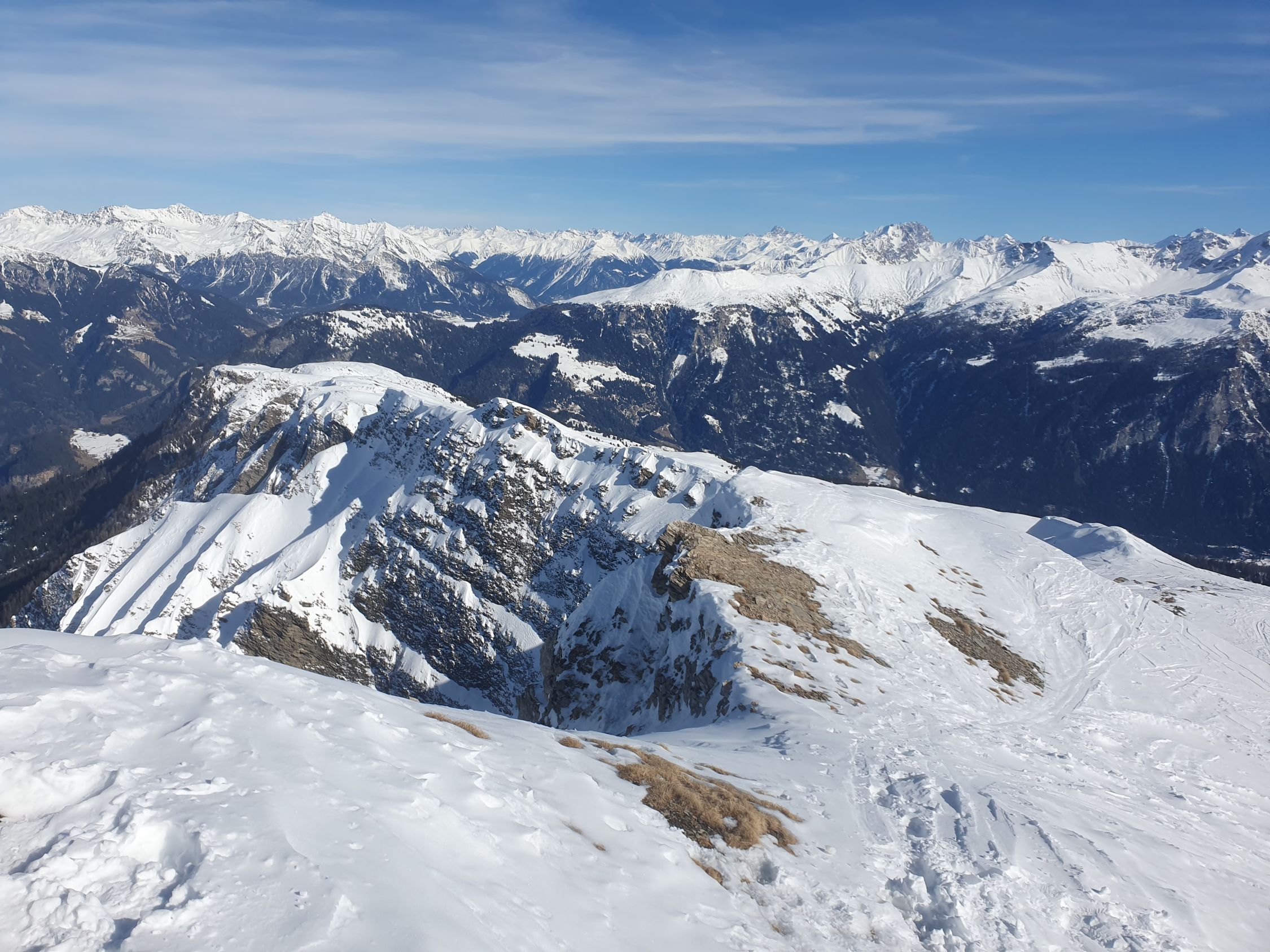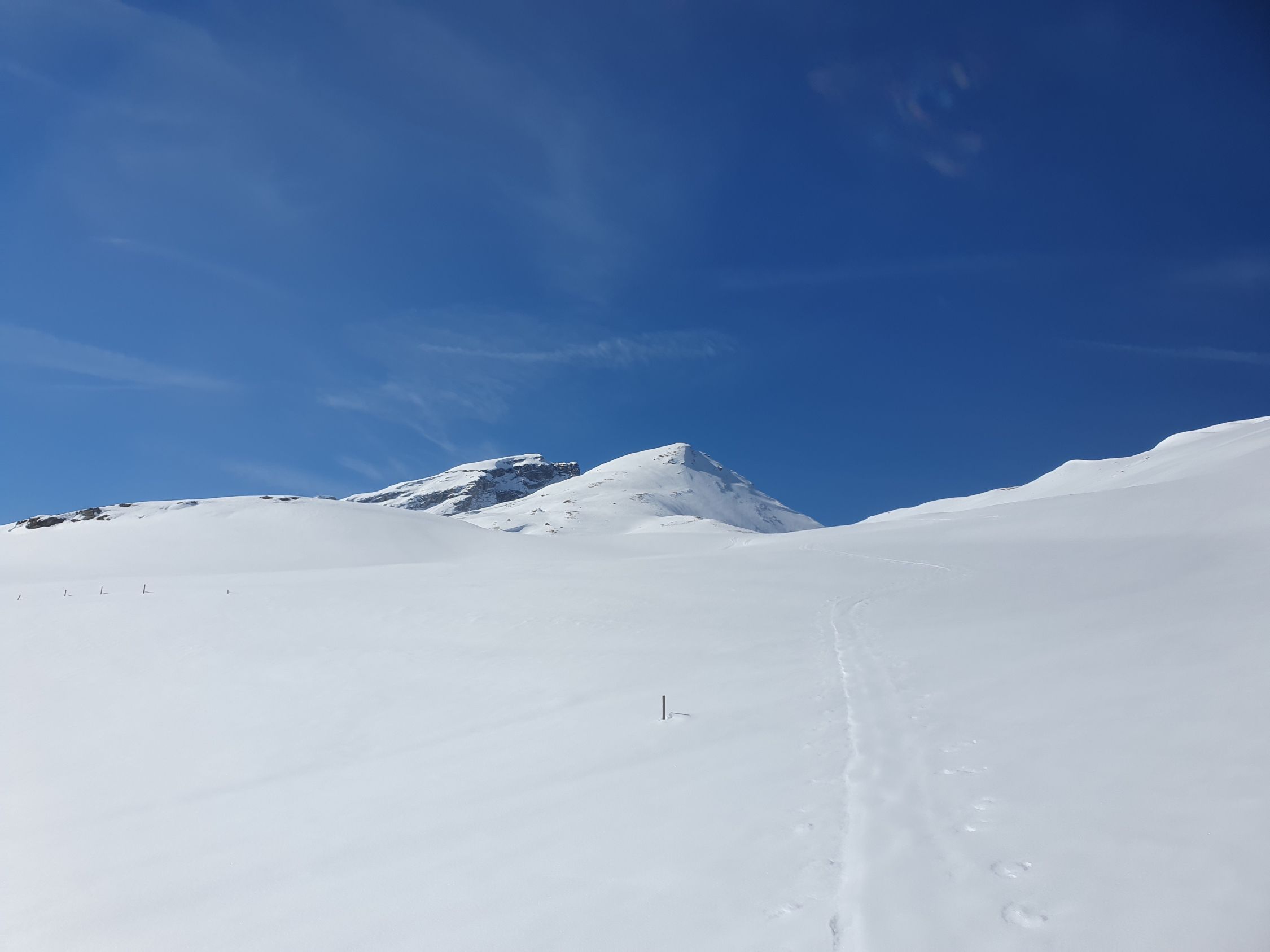 Eine Wechte versperrt mir hier die Nordsicht. Der weitete Gratverlauf nach E sieht vielversprechend aus, wäre da nicht eine kurze steile Passage zu meistern. Mein Bauchgefühl sagt nein, doch die Verlockung Zeit zu sparen war grösser. Doch nach nur 3 Meter Fellabstieg löse ich unter mir einen 10 Meter langen Rutsch aus. Ich habe schon viele Rutsche ausgelöst, aber dieser hier war doch viel zu einfach ausgelöst worden, ja, schon fast unerwartet.