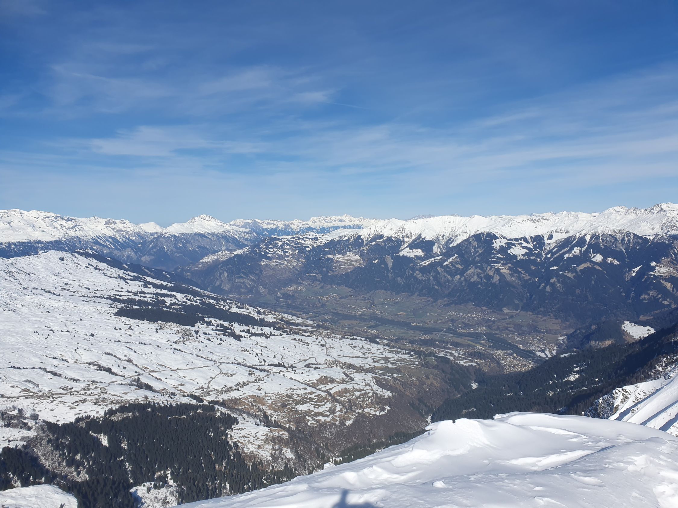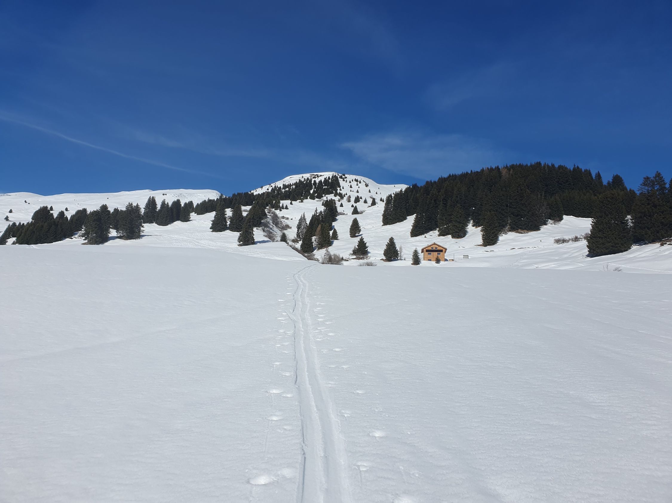 Auf gutem Sulz mit wenig Pulver fahre ich in nur 20 Minuten nach Mathon Dorf hinab, wo die Hänge etwas mehr Schnee aufweisen wie die oberhalb von Lohn Dorf.