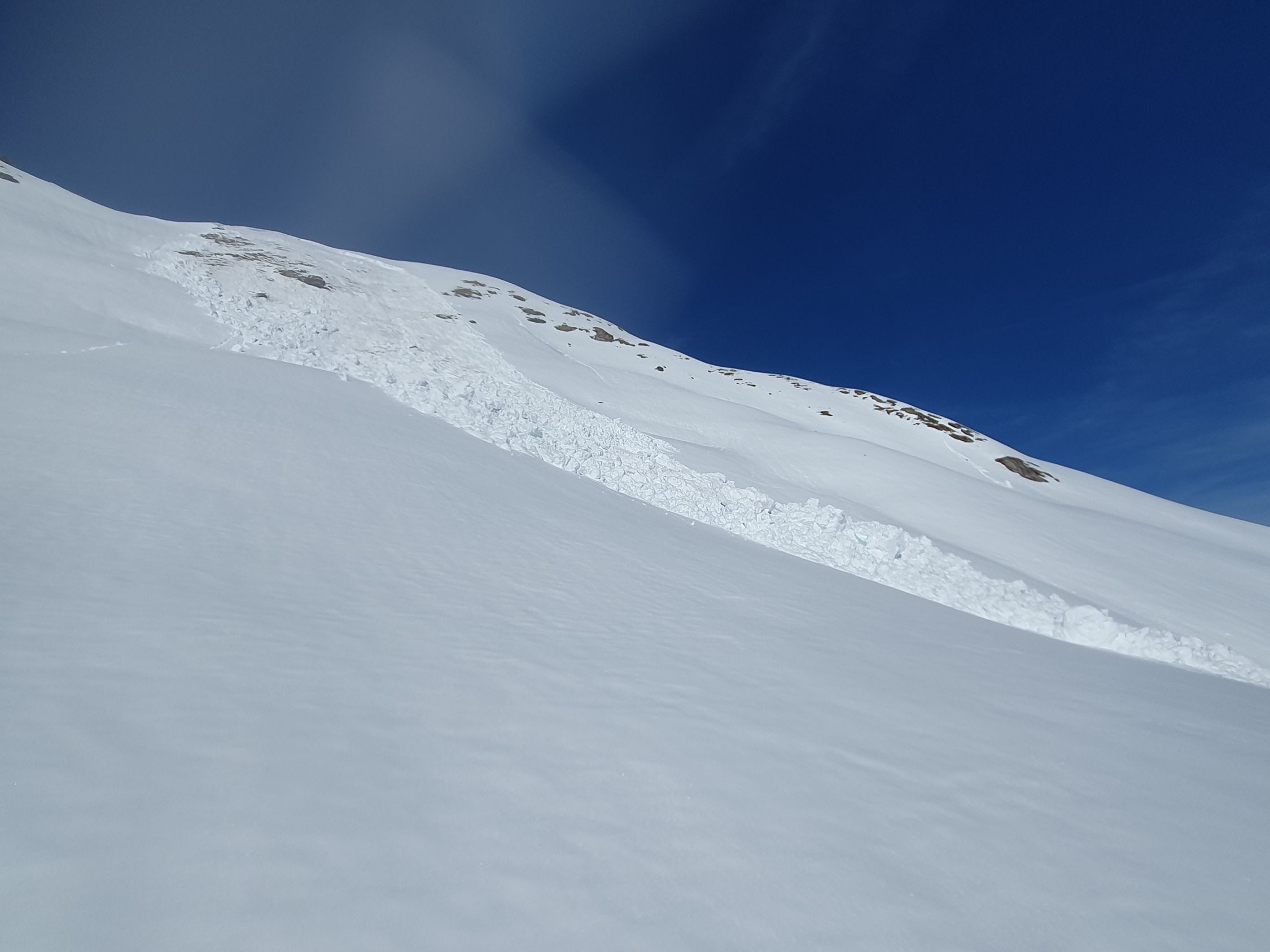 Das Risiko ist dafür zu hoch. Ich steige gerne wieder zurück zum Einshorn und laufe mit den Ski mühsam seitwärts auf meiner Aufstiegsspur hinab. Nach einer weiteren Fellabfahrt traversiere ich den Hang und inspiziere mein ausgelöster Rutsch von unten und bestätige die aktuelle Lawinen Stufe 3+.