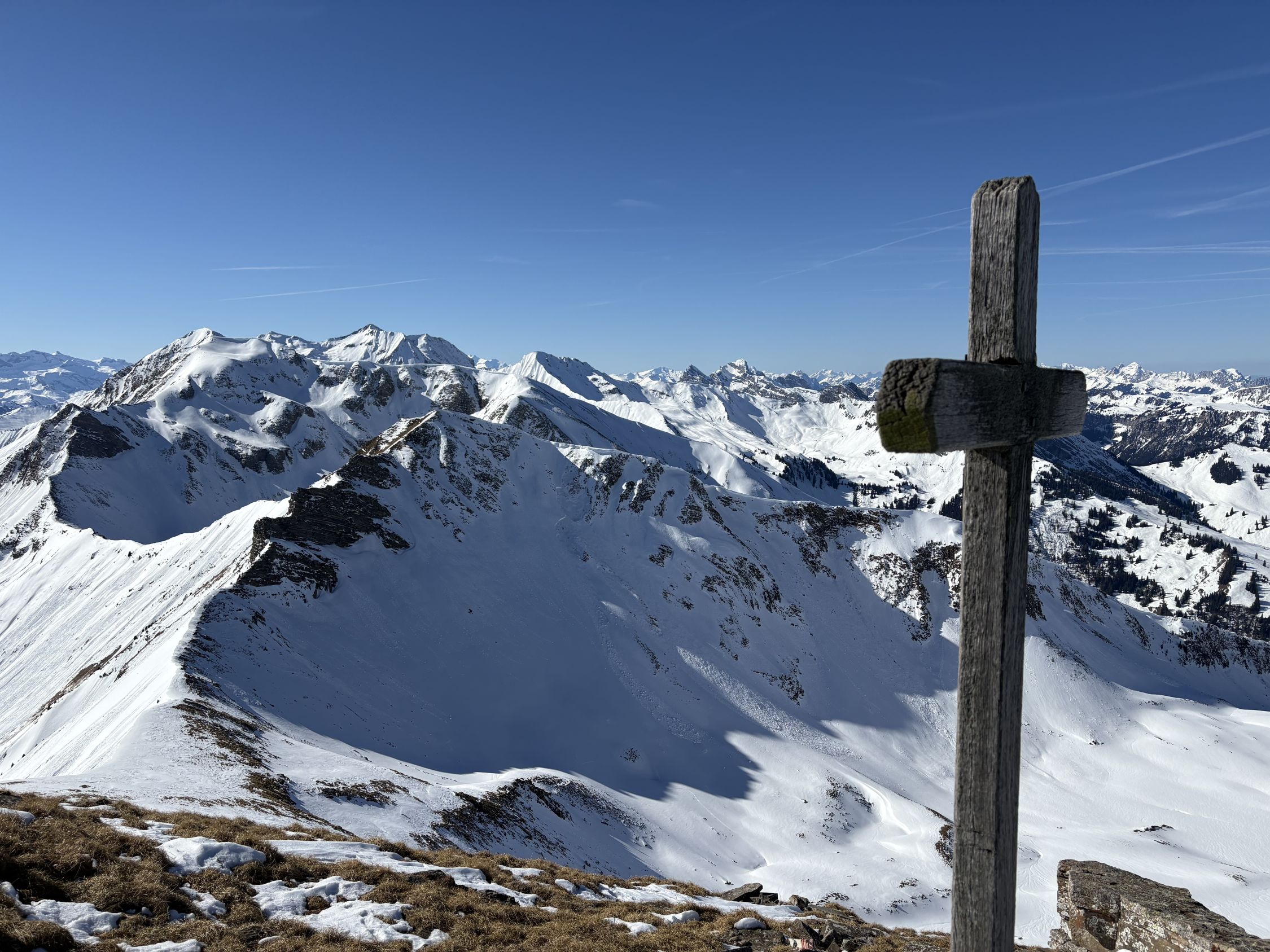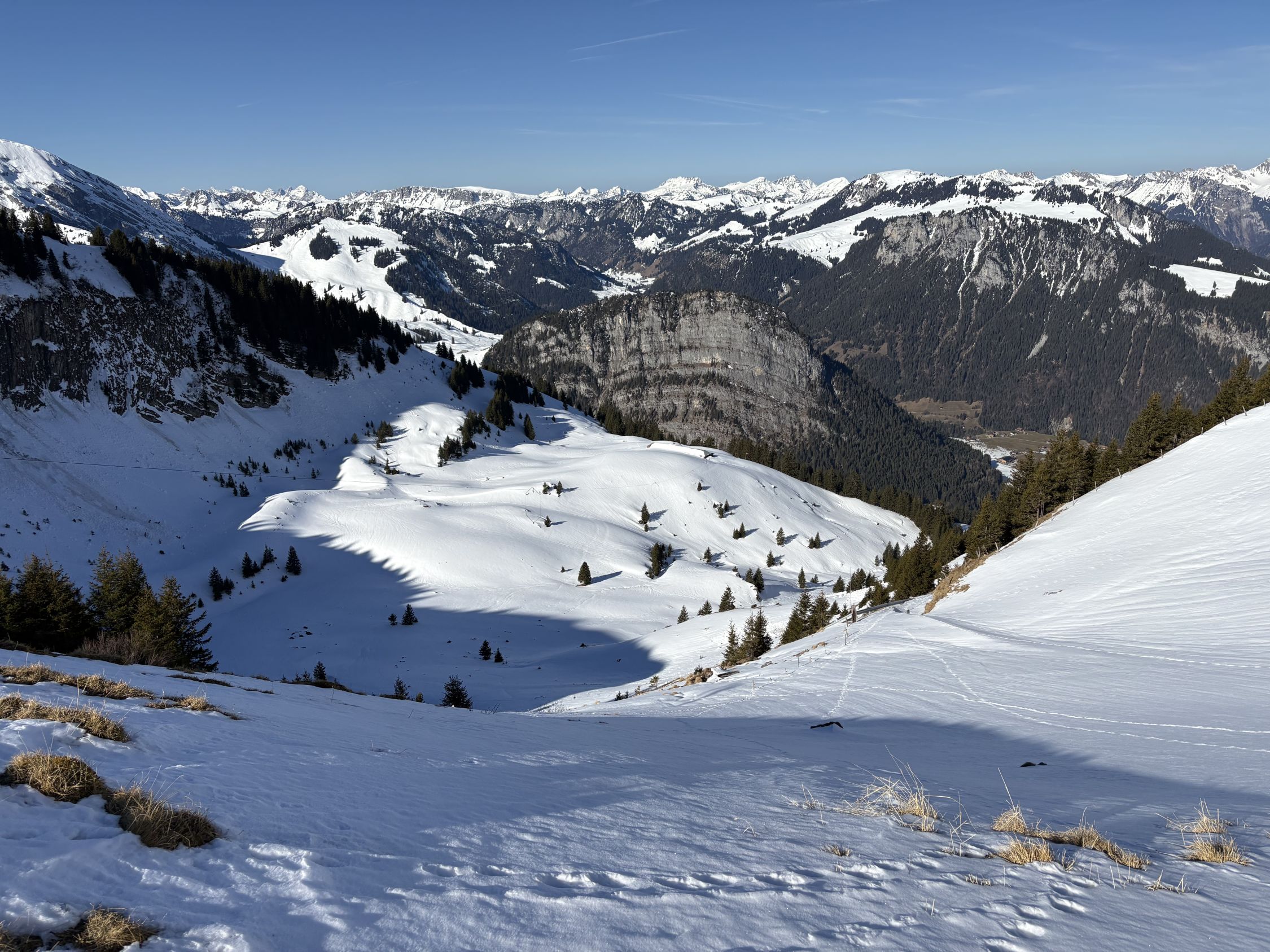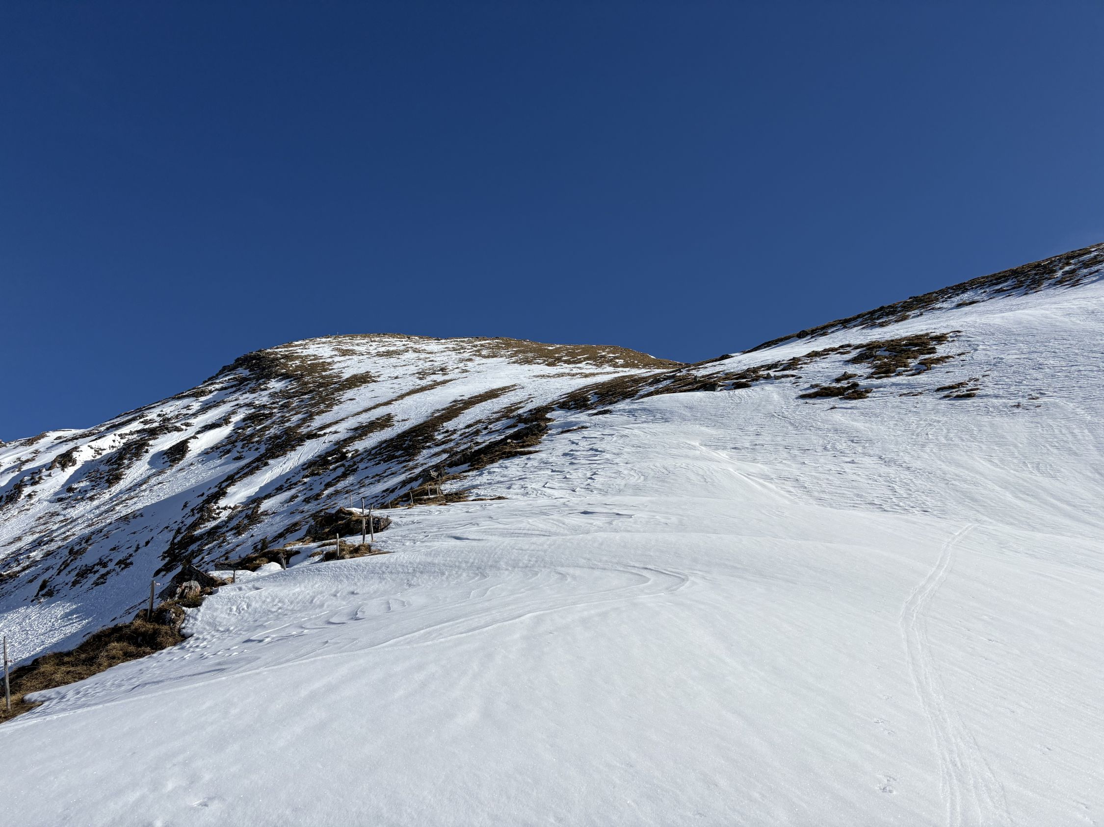 Für die Abfahrt bin ich auf dem Nordwestgrat kurz abgestiegen und dann nach Norden in die Tschipparälle. Anfangs nicht immer tragender Schnee (Pulver sucht man vergeblich), 200 m weiter unten kann man dann in Sulzhänge ausweichen, wobei immer mal wieder ein Rutsch nach unten zwingt. Im Wald auf 1700 m einmal kurz Ski abgezogen, dann über Chüeweid zum Ausgangspunkt.
