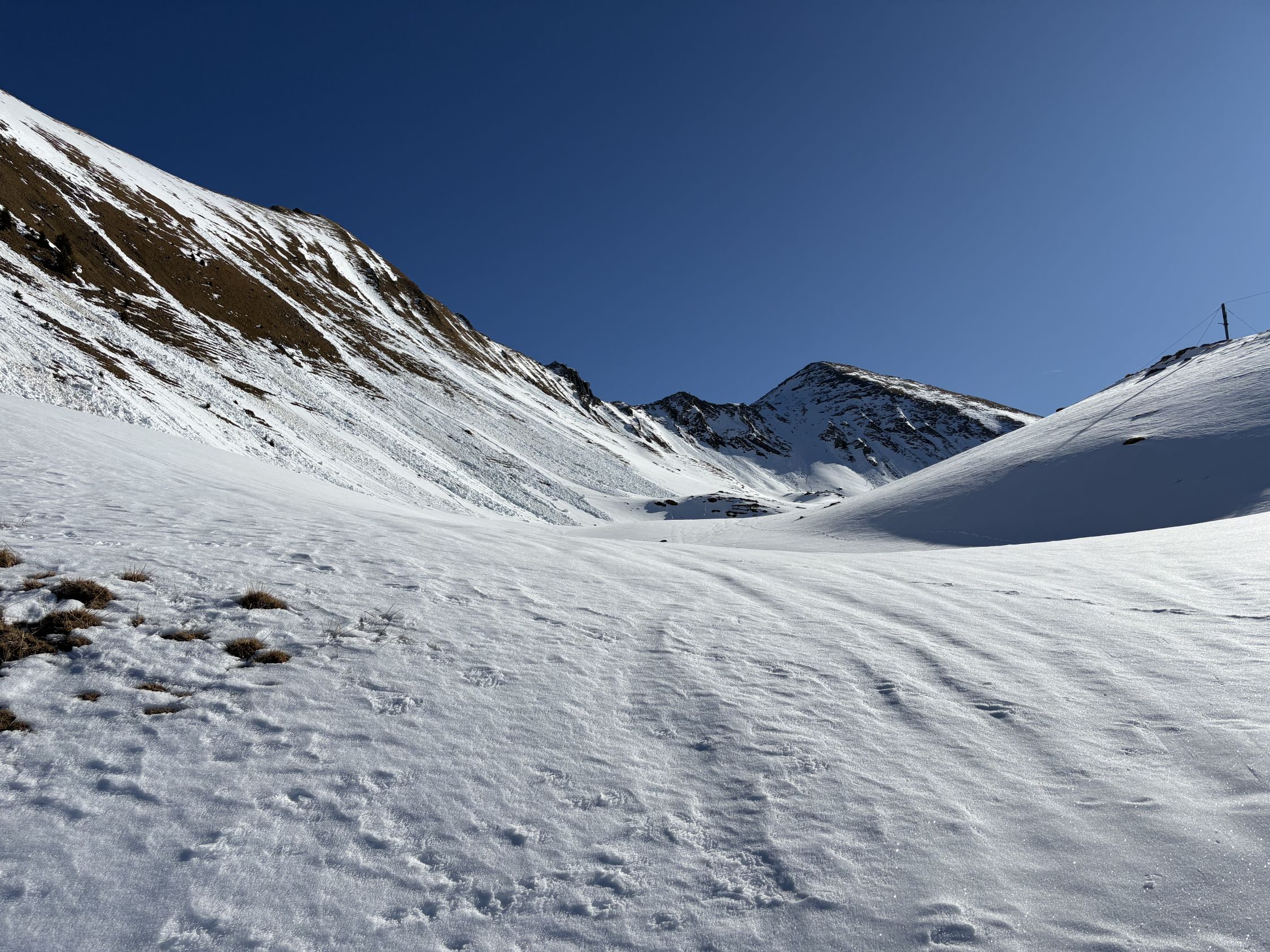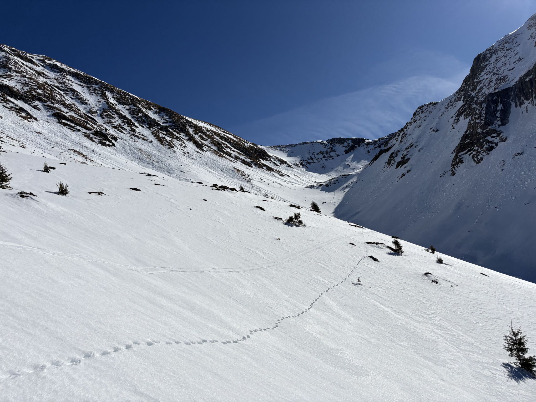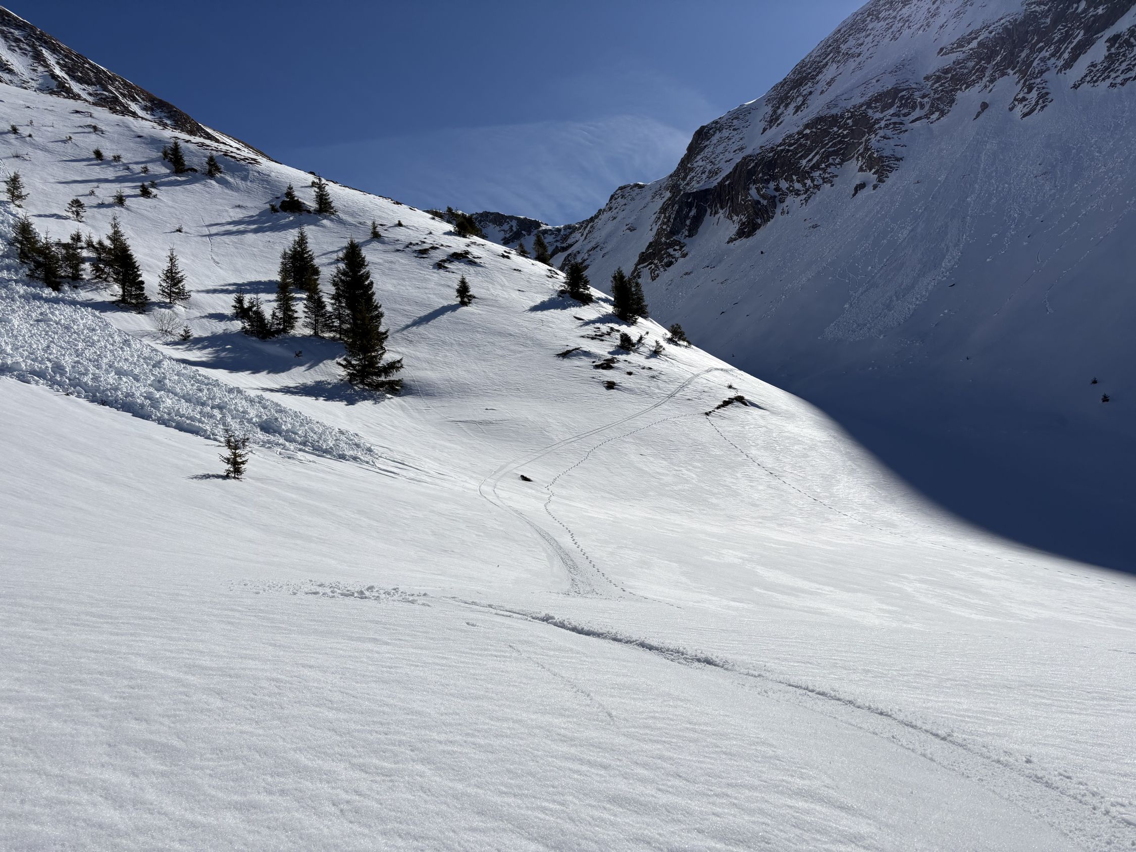 Für die Abfahrt bin ich auf dem Nordwestgrat kurz abgestiegen und dann nach Norden in die Tschipparälle. Anfangs nicht immer tragender Schnee (Pulver sucht man vergeblich), 200 m weiter unten kann man dann in Sulzhänge ausweichen, wobei immer mal wieder ein Rutsch nach unten zwingt. Im Wald auf 1700 m einmal kurz Ski abgezogen, dann über Chüeweid zum Ausgangspunkt.
