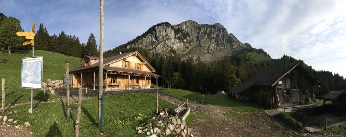 Um 7 Uhr Start auf der Haggenegg, 1 Stunde Wanderung durch tropfnasse Wiesen und auf schlammigen Wegen bis zum Zwyschetmythen, hinten vorbei am Haggenspitz und am Kleinen Mythen.