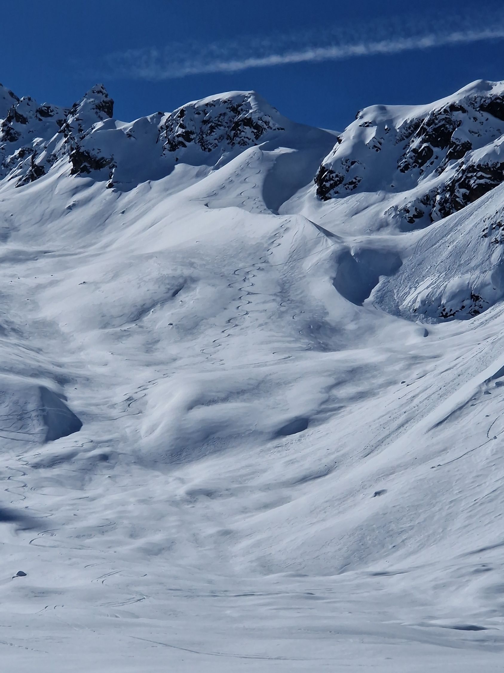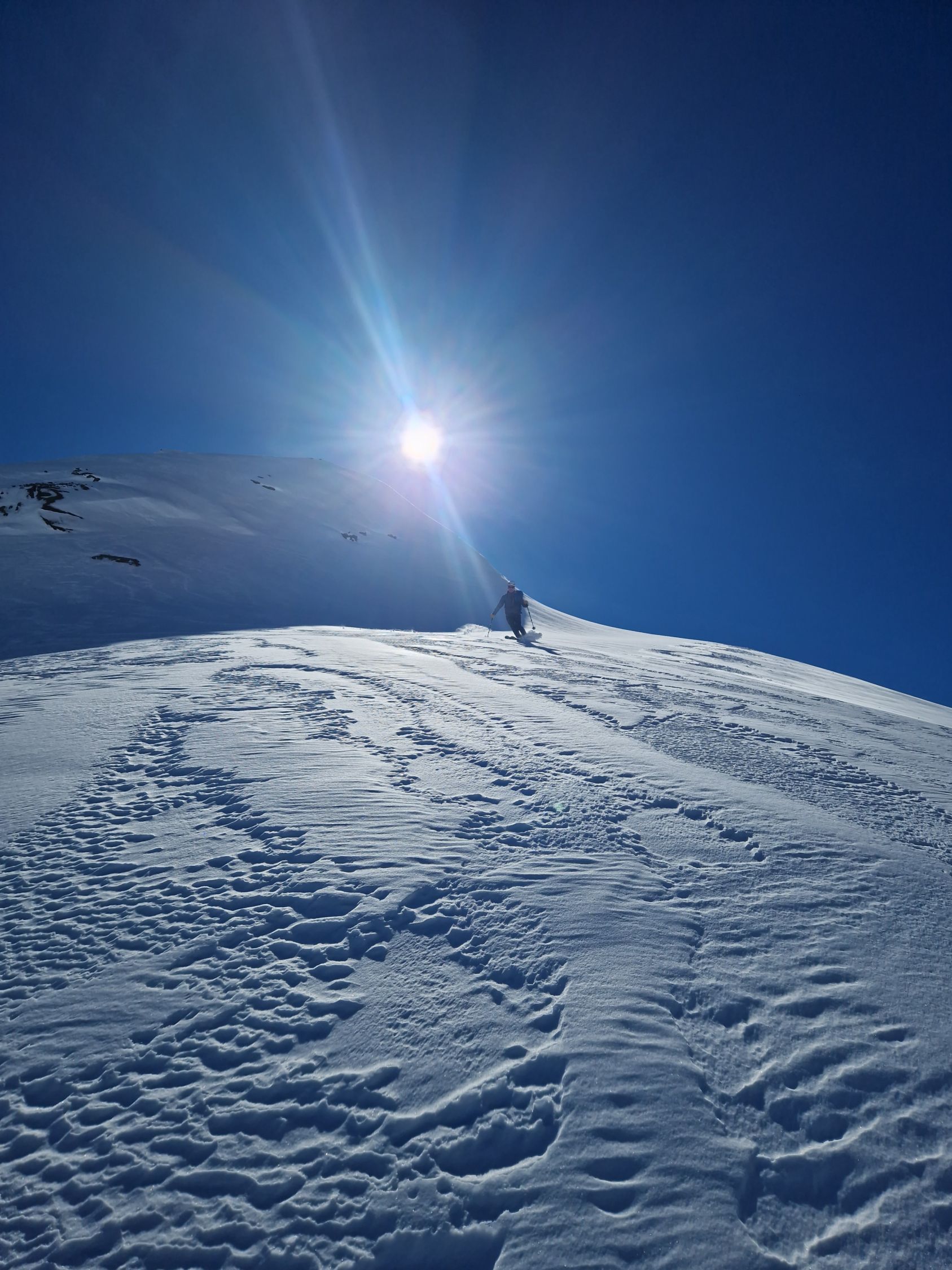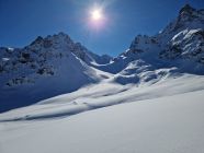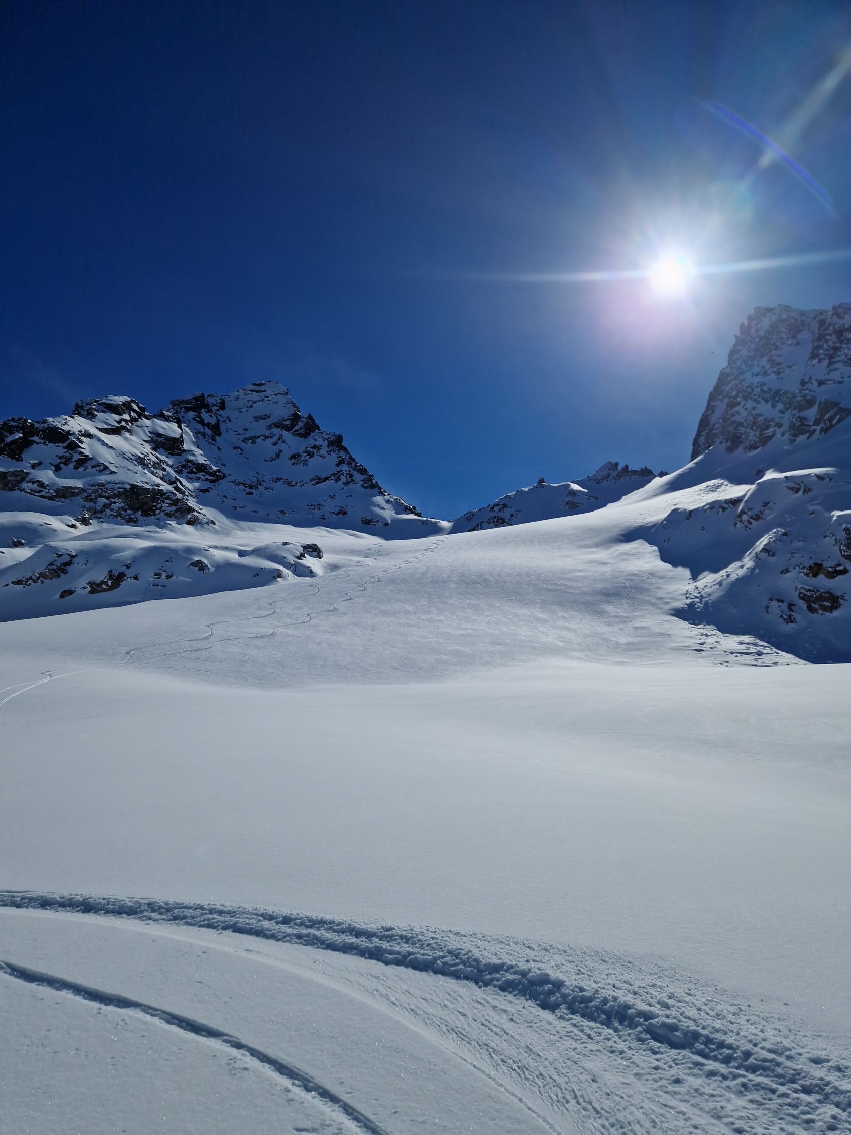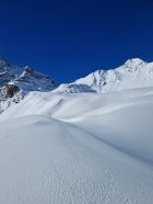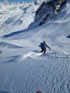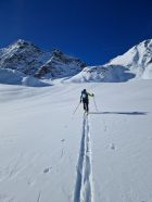 Bis zur Zollwachhütte war gespurt. Oberhalb der Saarbrücker Hütte muss angesichts der plötzlich auftauchenden und bald wieder endenden Spuren, wie wir vermuteten, jemand vom Lawinenwarndienst per Hubschrauber abgesetzt worden sein, der dann ein wenig höher an geeigneter Stelle ein Schneeprofil gegraben hat. Danke für euren Einsatz! Den letzten Hang vor der Seelücke sind wir dann in Abständen gegangen. Der Schnee hatte sich aber schon sehr gut gesetzt und war entsprechend kompakt. Generell haben wir auf der ganzen Runde keine Setzungsgeräusche wahrgenommen. Der massive Schneefall hat sehr gut getan. In jeder Hinsicht. Wir sind trotzdem nicht bis zur Seehornscharte, hier schien uns der letzte Hang windbearbeitet. Andererseits konnten wir es ohnehin nicht erwarten, die Felle von den Skiern zu nehmen und abzufahren... Ein weiteres Argument war, dass wir bis zum Aufstieg zur Schweizerlücke nicht zu viel Zeit verstreichen lassen wollten. Dieser erwies sich dann allerdings lawinentechnisch für uns als unbedenklich. Während der letzten großen Niederschlagsperiode entlud sich der Hang bereits bis auf den Altschnee und war nurmehr mit den 10 cm Neuschnee vom letzten Wochenende bedeckt. Auch bei der Abfahrt bis ans Ende des Kromergletschers fanden wir ausgezeichnete (eigentlich Traum-)Verhältnisse vor. Nachdem es jedoch tatsächlich bis 2.300m geregnet haben muss, geriet das letzte Teilstück bis zum Seespitz angesichts des daraus resultierenden Bruchharschs de luxe nurmehr zu einer Pflichtübung. Zum Glück liegt jetzt soviel Schnee, dass man zumindest nicht noch zusätzlich durch die Steine lavieren muss.
