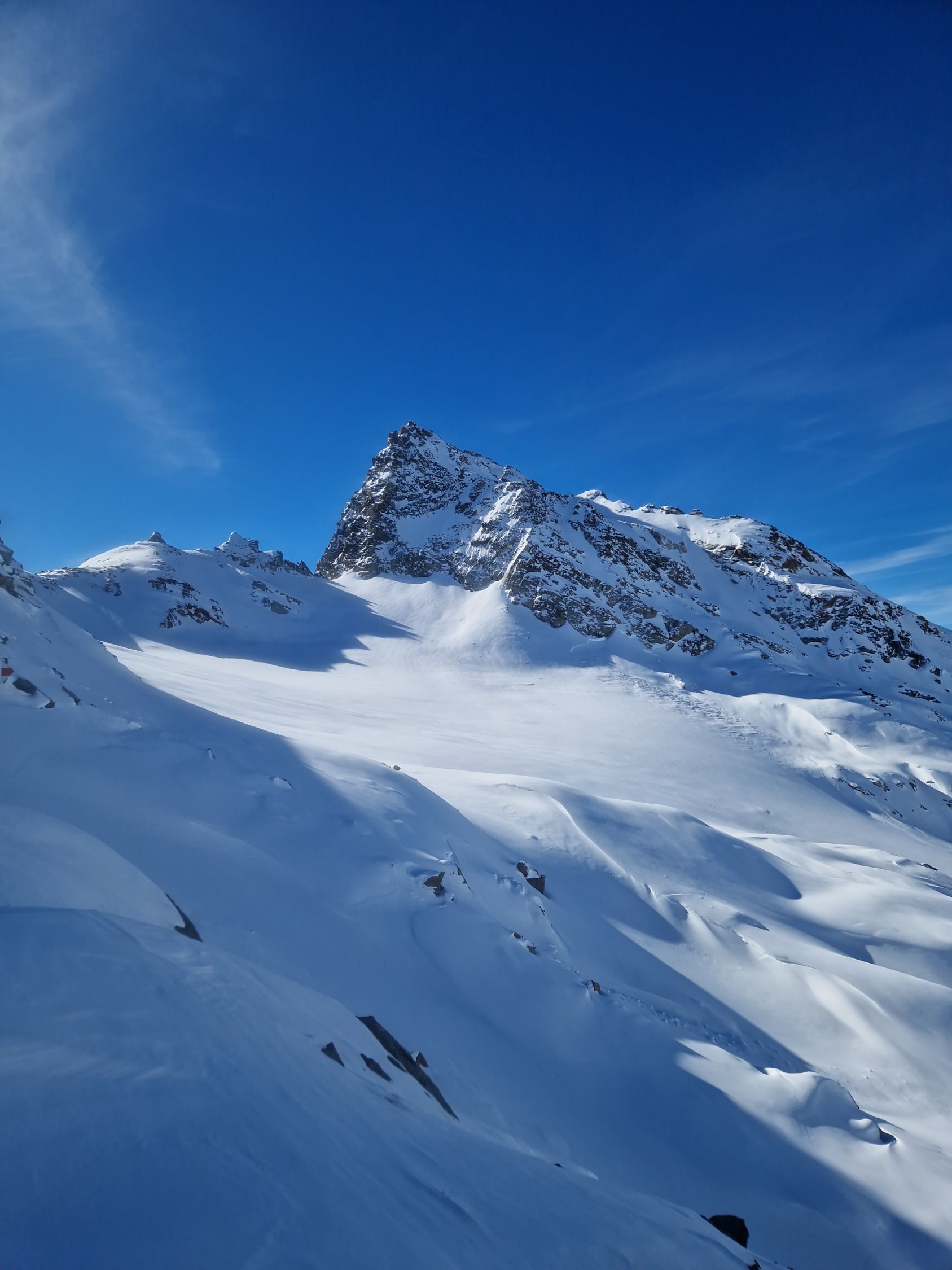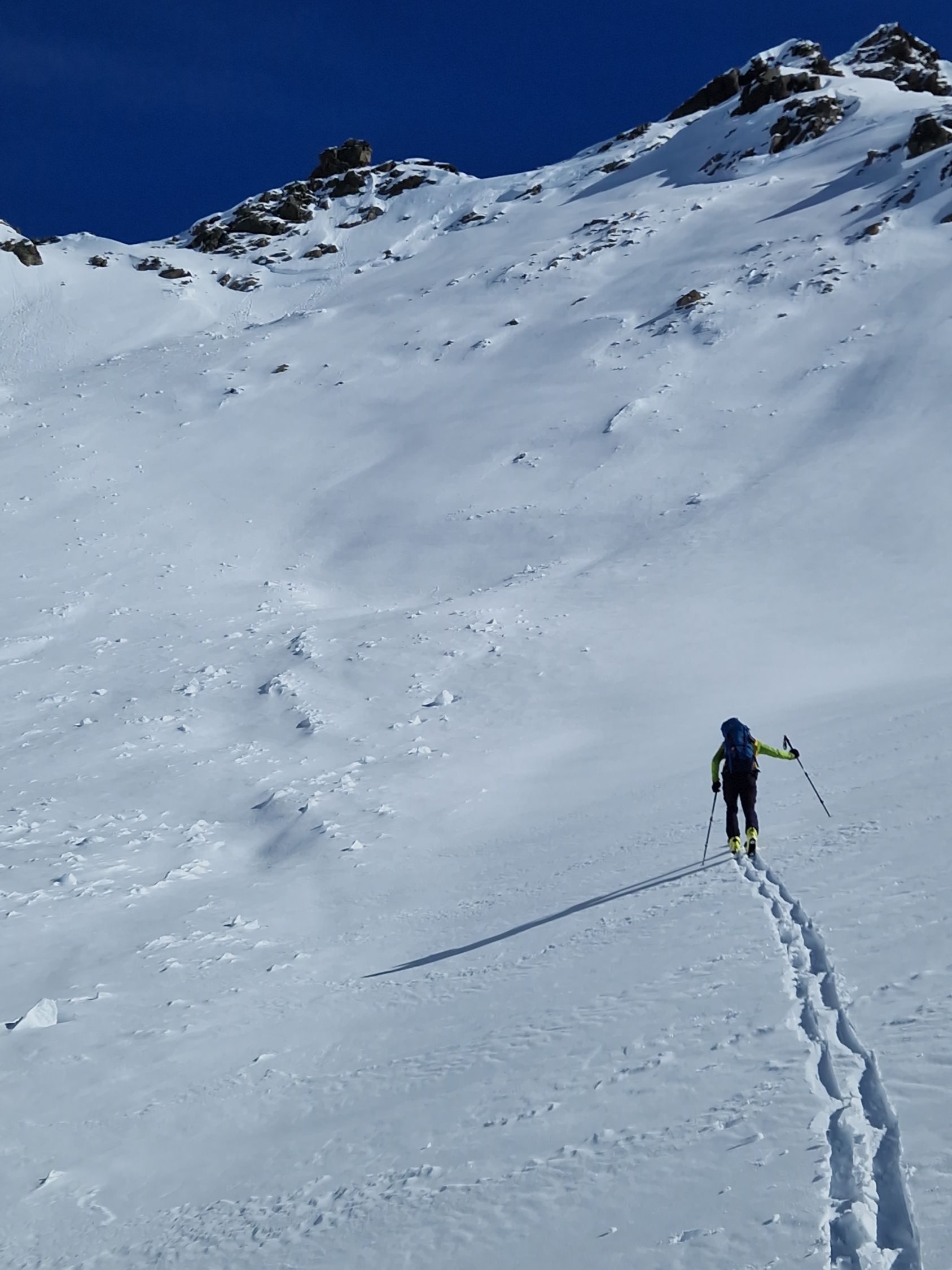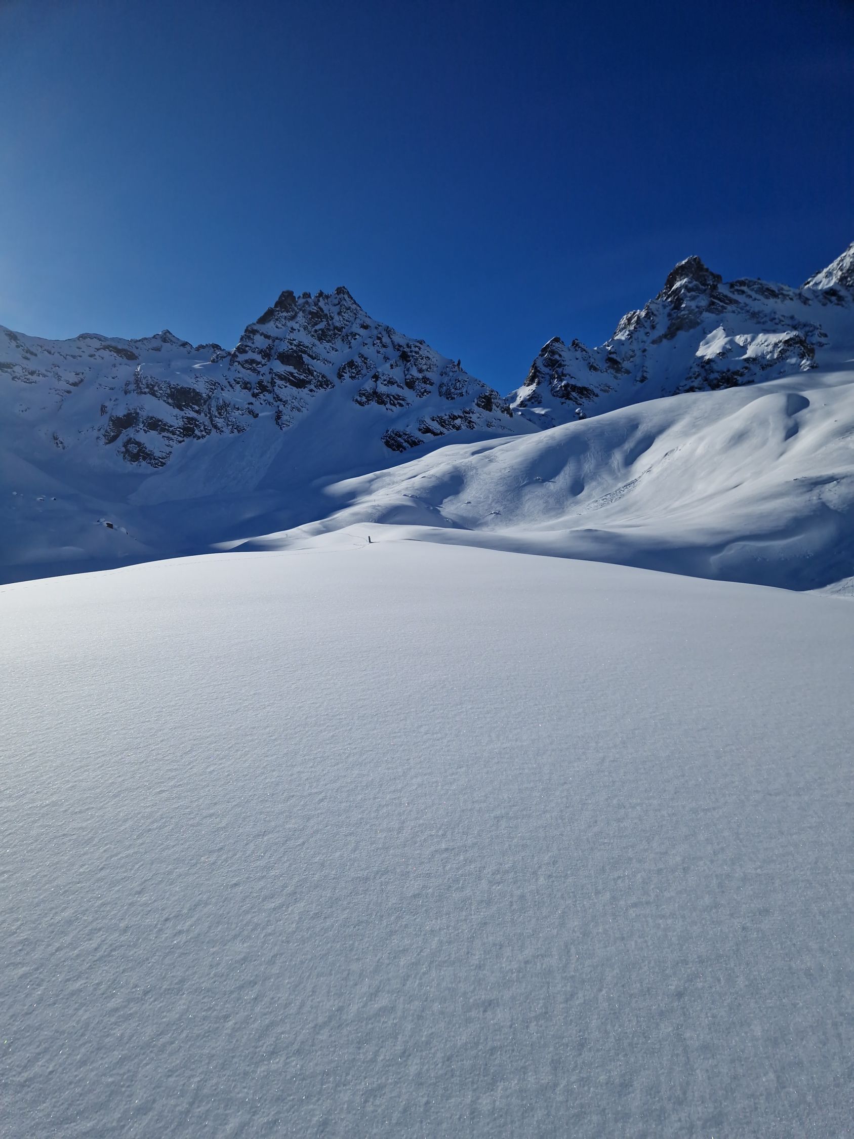 Bis zur Zollwachhütte war gespurt. Oberhalb der Saarbrücker Hütte muss angesichts der plötzlich auftauchenden und bald wieder endenden Spuren, wie wir vermuteten, jemand vom Lawinenwarndienst per Hubschrauber abgesetzt worden sein, der dann ein wenig höher an geeigneter Stelle ein Schneeprofil gegraben hat. Danke für euren Einsatz! Den letzten Hang vor der Seelücke sind wir dann in Abständen gegangen. Der Schnee hatte sich aber schon sehr gut gesetzt und war entsprechend kompakt. Generell haben wir auf der ganzen Runde keine Setzungsgeräusche wahrgenommen. Der massive Schneefall hat sehr gut getan. In jeder Hinsicht. Wir sind trotzdem nicht bis zur Seehornscharte, hier schien uns der letzte Hang windbearbeitet. Andererseits konnten wir es ohnehin nicht erwarten, die Felle von den Skiern zu nehmen und abzufahren... Ein weiteres Argument war, dass wir bis zum Aufstieg zur Schweizerlücke nicht zu viel Zeit verstreichen lassen wollten. Dieser erwies sich dann allerdings lawinentechnisch für uns als unbedenklich. Während der letzten großen Niederschlagsperiode entlud sich der Hang bereits bis auf den Altschnee und war nurmehr mit den 10 cm Neuschnee vom letzten Wochenende bedeckt. Auch bei der Abfahrt bis ans Ende des Kromergletschers fanden wir ausgezeichnete (eigentlich Traum-)Verhältnisse vor. Nachdem es jedoch tatsächlich bis 2.300m geregnet haben muss, geriet das letzte Teilstück bis zum Seespitz angesichts des daraus resultierenden Bruchharschs de luxe nurmehr zu einer Pflichtübung. Zum Glück liegt jetzt soviel Schnee, dass man zumindest nicht noch zusätzlich durch die Steine lavieren muss.