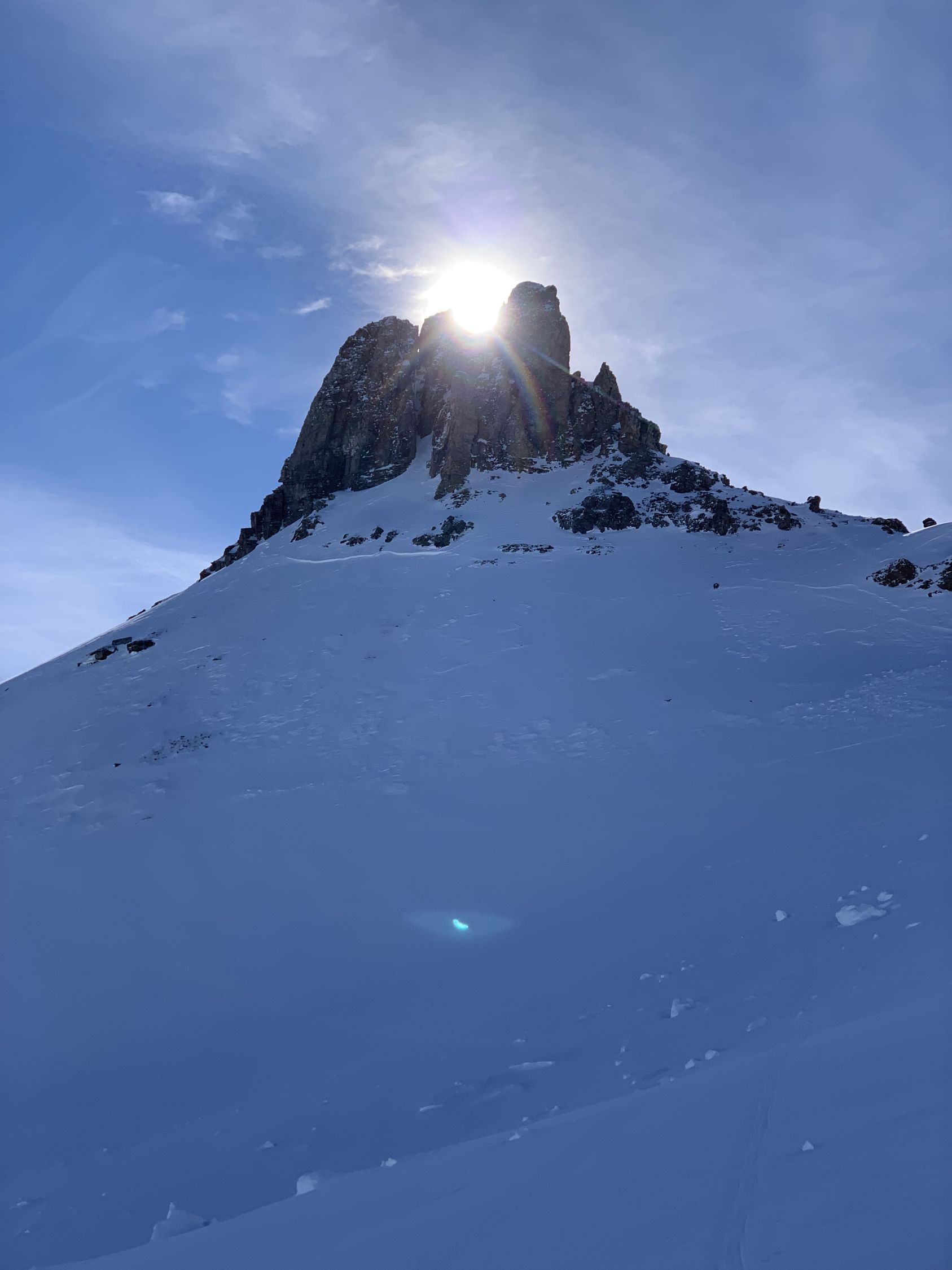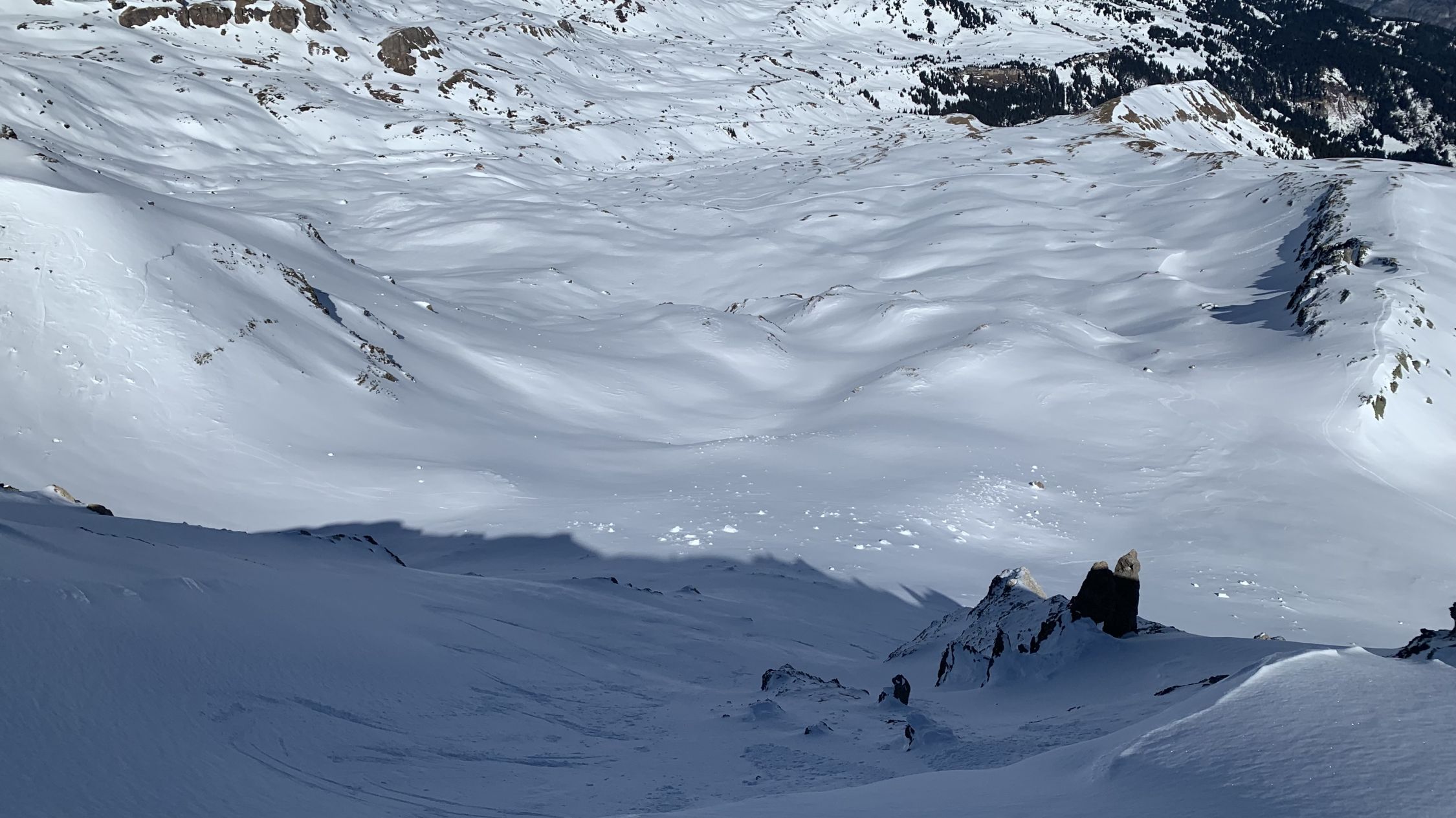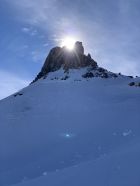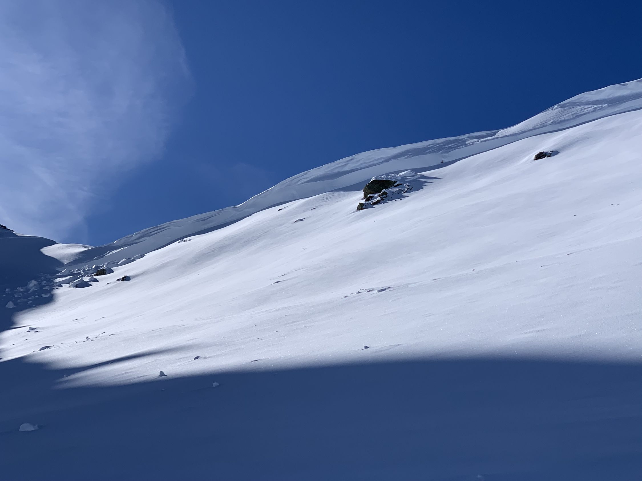 Der Wismeilen hat eine rechte Wächte am Kamm, der Aufstieg am Schlußhang verlangt nach Harscheisen. Die Direktabfahrt nach Norden ging heute - auch die allerdings bockelhart.