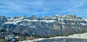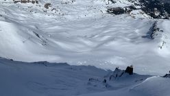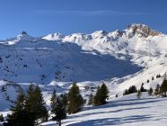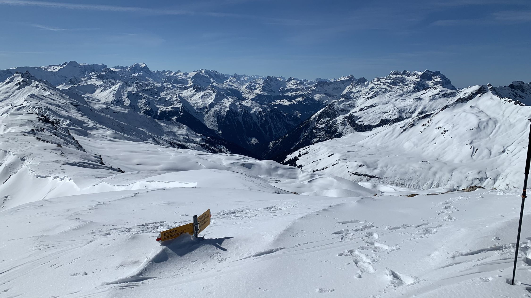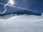 Es hat gut Schnee im Gebiet, der allerdings ein wenig gelitten hat - es hat wohl bis weit rauf geregnet. Entsprechend hart ist es selbst nach Stunden ungetrübten Sonnenscheins. Trotzdem gut zu fahren, ein prächtiger Tag heute mit toller Sicht, an der Alpe Fursch Stimmung wie Ende April.