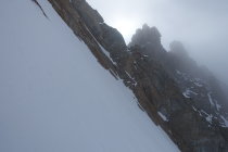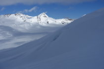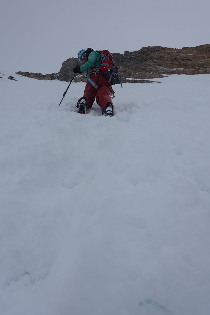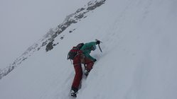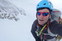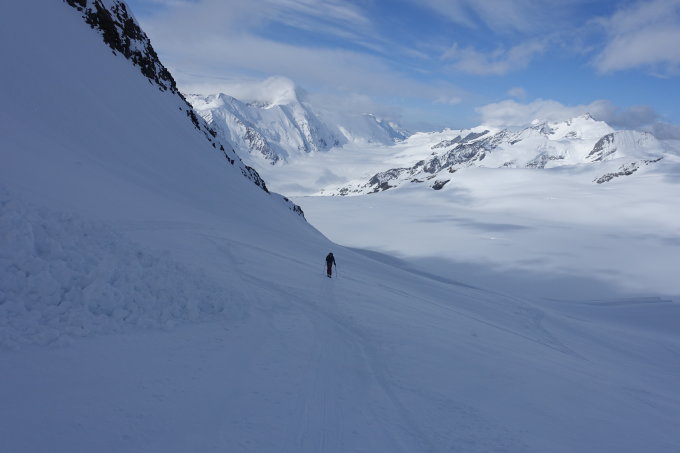 Start bei bestem Wetter um 05:20 an der Hollandiahütte. Der Wetterbericht meldete Schneefall ab 13:00 Uhr. Wir hofften vorher noch unser Ziel zu erreichen. Da es in der Nacht leicht geschneit hatte, brauchten wir doch 35 min für die Abfahrt zum Konkordiaplatz. Auf den Flachstücken musste ein wenig angeschoben werden. Auf Grund des gut eingeschneiten Gletschers konnten wir links von der Standardroute leicht ansteigend auf das das Ewigschneefäld aufsteigen. Vor uns waren mehrere Gruppen zum Grünegghorn und zum kleinen Grünhorn unterwegs. Beim Aufstieg in Richtung Fiescherhörner erkannten wir auch, dass auch auf unserer Route 2 Tourengänger bereits im Couloir in Richtung Fieschersattel unterwegs waren. Sie waren bereits am Bergschrund und hatten etwa 1h Vorsprung. Skidepot etwa auf 3750m. Im Aufsteig zum Fieschersattel sehr gute Trittspur. Ist schon steil, aber bei den Bedingungen gut machbar. Im Auf- sowie im Abstieg noch komplett durchgefroren. Bei der Ankunft am Fieschersattel waren wir bereits komplett in den Wolken. Hier trafen wir auf die andere Zweierseilschaft, die auf dem Hinteren Fiescherhorn war und nun zum Abstieg in das Couloir einstieg. Wir folgten in den Wolken den Spuren der Zweierseilschaft zum Gipfel. Dort hatte es leider nur eine Sichtweite von etwa 20m. Schade, aber immerhin den Gipfel erreicht.