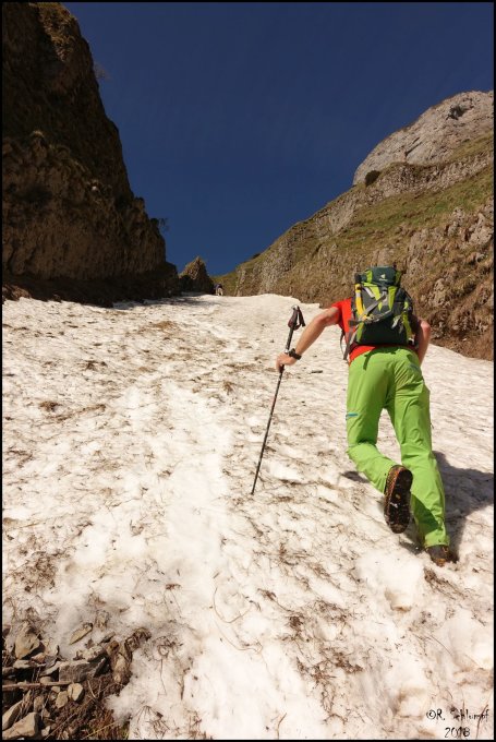 Hundstein: Untere Schlucht schneefrei, tip top. Ab Mitte bis zum Ausstieg nach links liegt Schnee mit einer Eisschicht darunter. Dieses Schneefeld kann man grösstenteils rechts in den gestuften Felsen umgehen. Dort wo man gezwungenermassen Schneeberührung hat, geht es gut ohne Ausrüstung. Ein Pickel ist nicht zwingend notwendig, gibt jedoch zusätzliche Sicherheit. Keine Steigeisen notwendig.