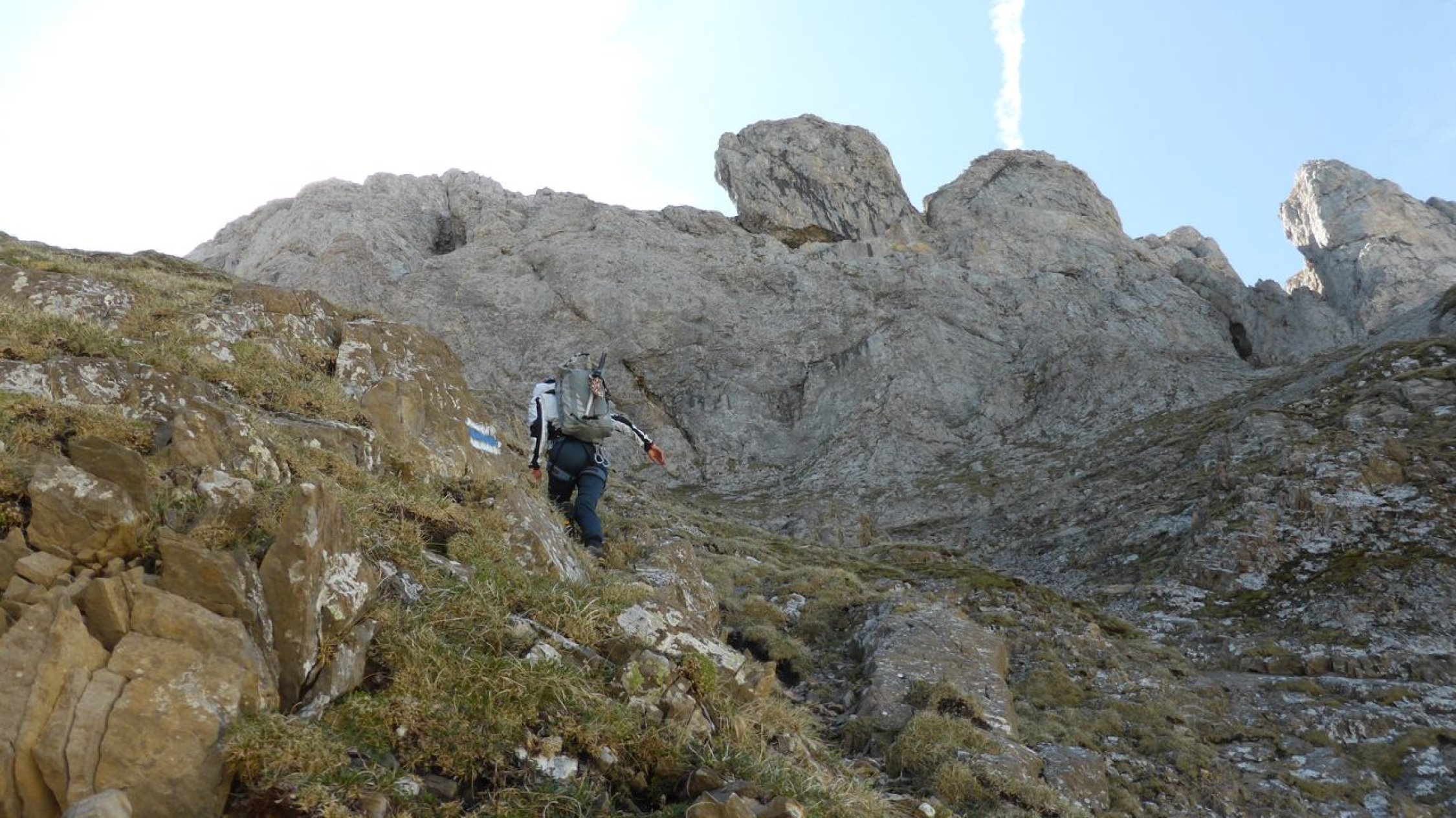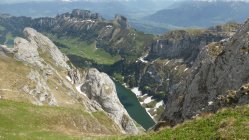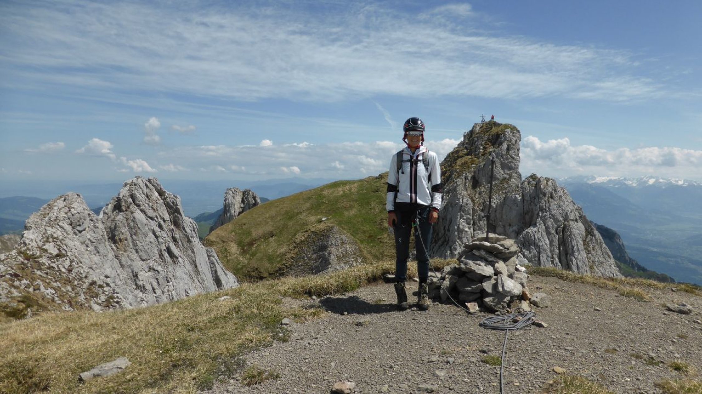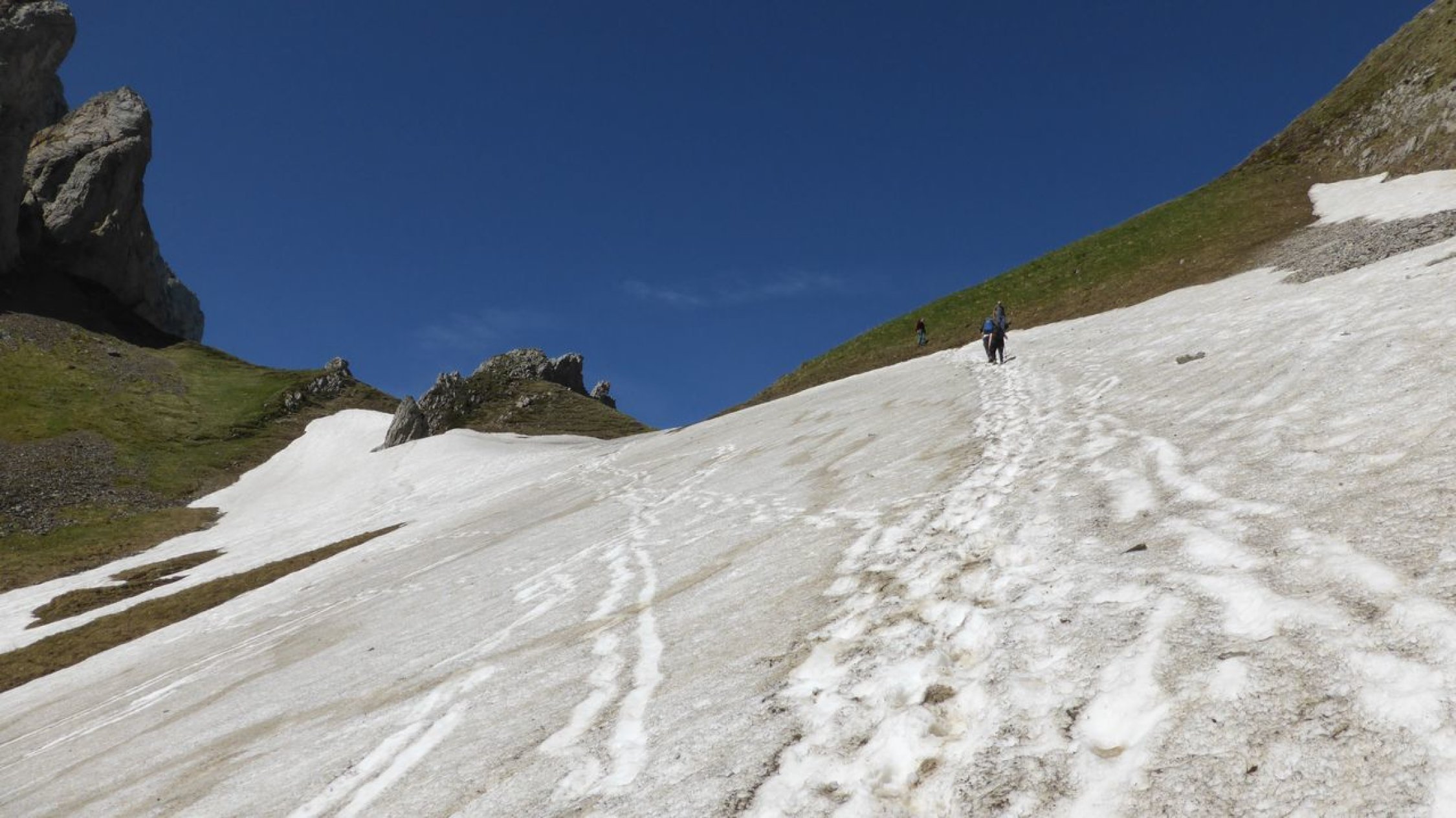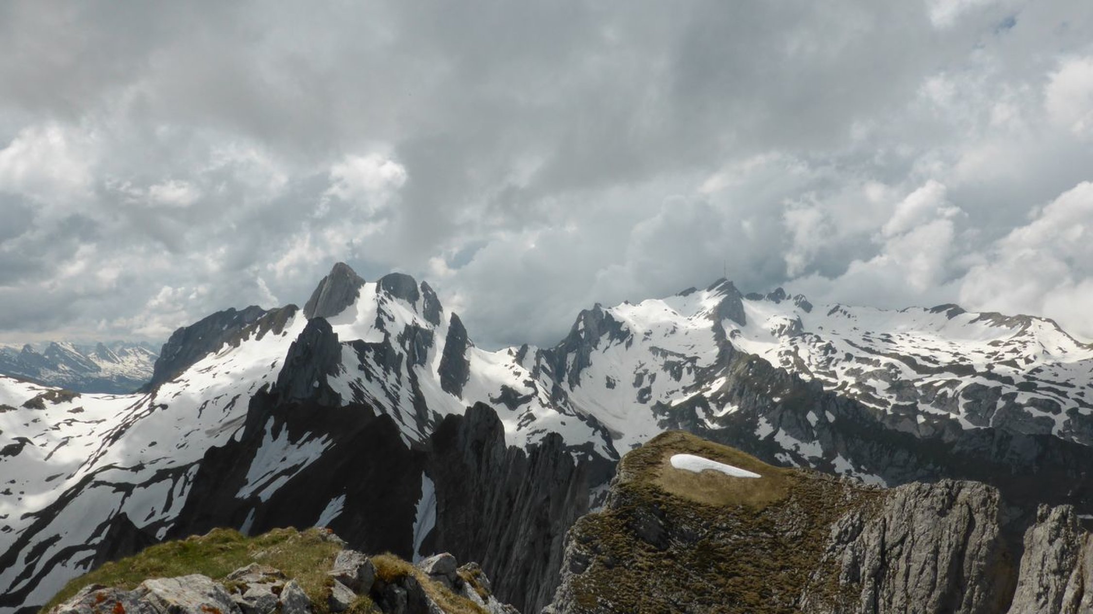 Es war ein prächtiger Pfingstmontag. Der herrliche Sonnenschein wurde erst am früheren Nachmittag mit den wachsenden Quellwolken weniger. Fast schwarz war es später am Nachmittag um den Säntis. Im Kamin zw. Freiheit und Hundstein ging es gut über Stapfschnee. Die Kletterpassagen waren reizvoll – ab dem Grat sicherten wir uns am laufenden 20m-Seil. Die untere Abseilstelle erleichterte den Abstieg in die Scharte. Ein lästig steiles Schneefeld im Abstieg vom Hundstein konnte oberhalb und links umgangen werden. Das alte, trockene Gras war manchmal heikel zu begehen.