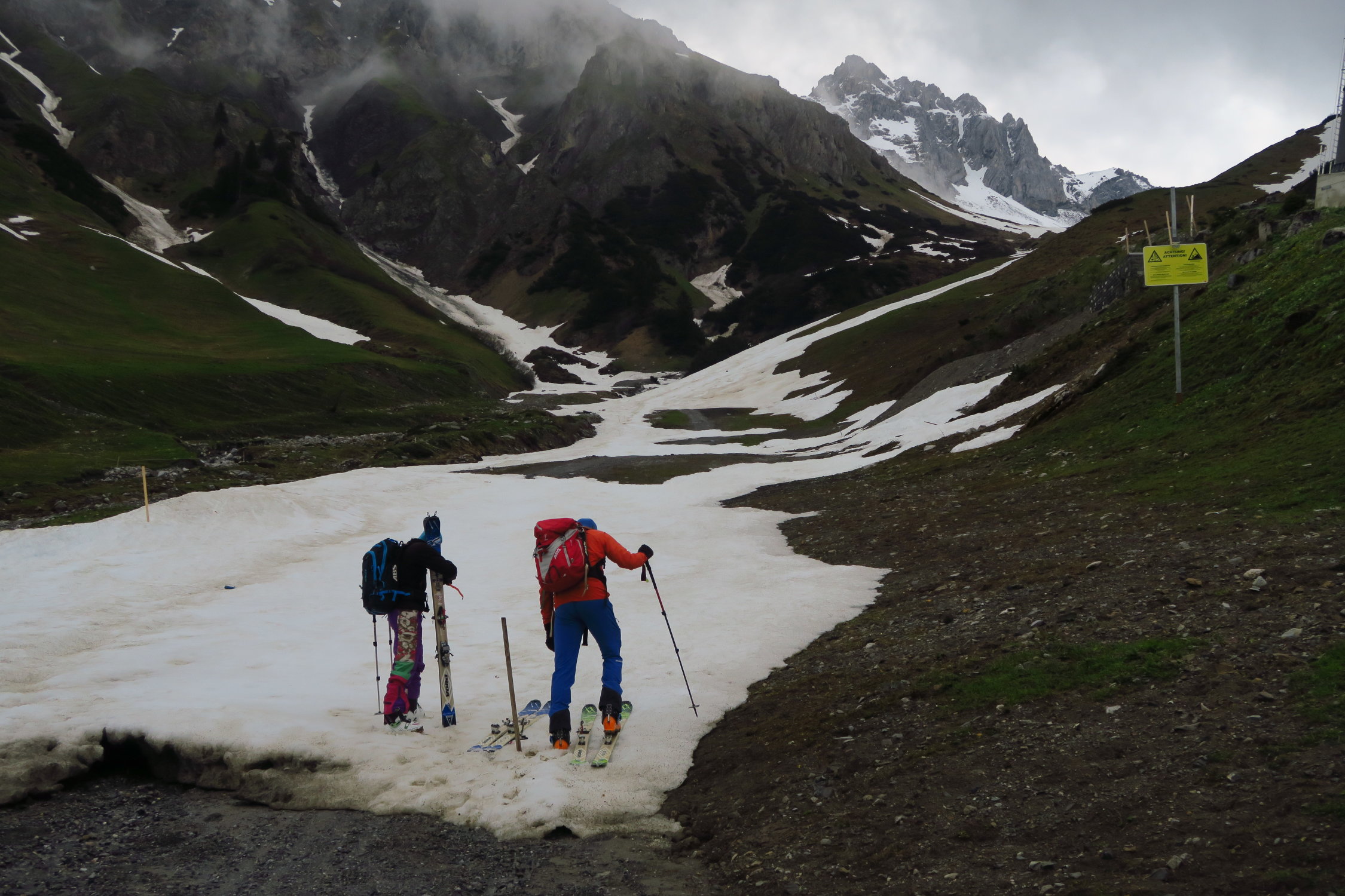 Beste Frühjahrsbedingungen. Schi müssen ab Talstation Valfagehrbahn nur wenige Minuten bis ums Eck zum Valfagehrbach getragen werden, dann durchgängig Schnee bis zum Gipfel. Weitere Details und Fotos auf www.geiselstein.weebly.com
