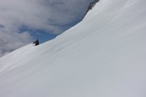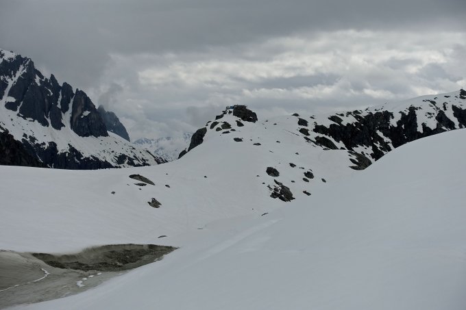 War es am frühen Morgen über dem Furkagebiet noch wolkenlos, zogen aber bereits um 08:00 Uhr fast ringsum wieder düstere Wolken auf. Deshalb kurz unterhalb des Grates bei der dritten Sicherungsstange (im tiefen Nasschnee) umgekehrt.