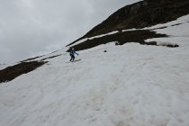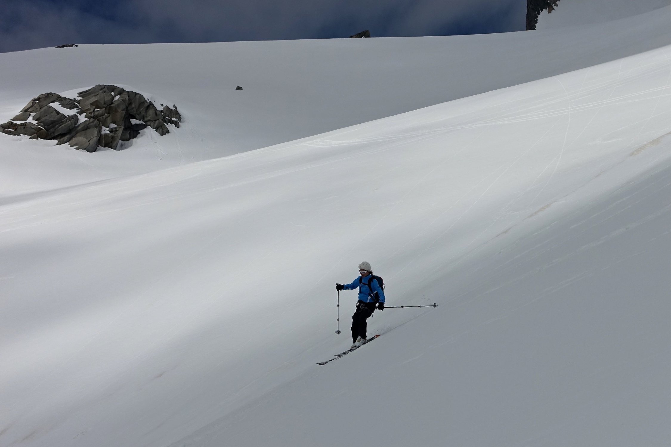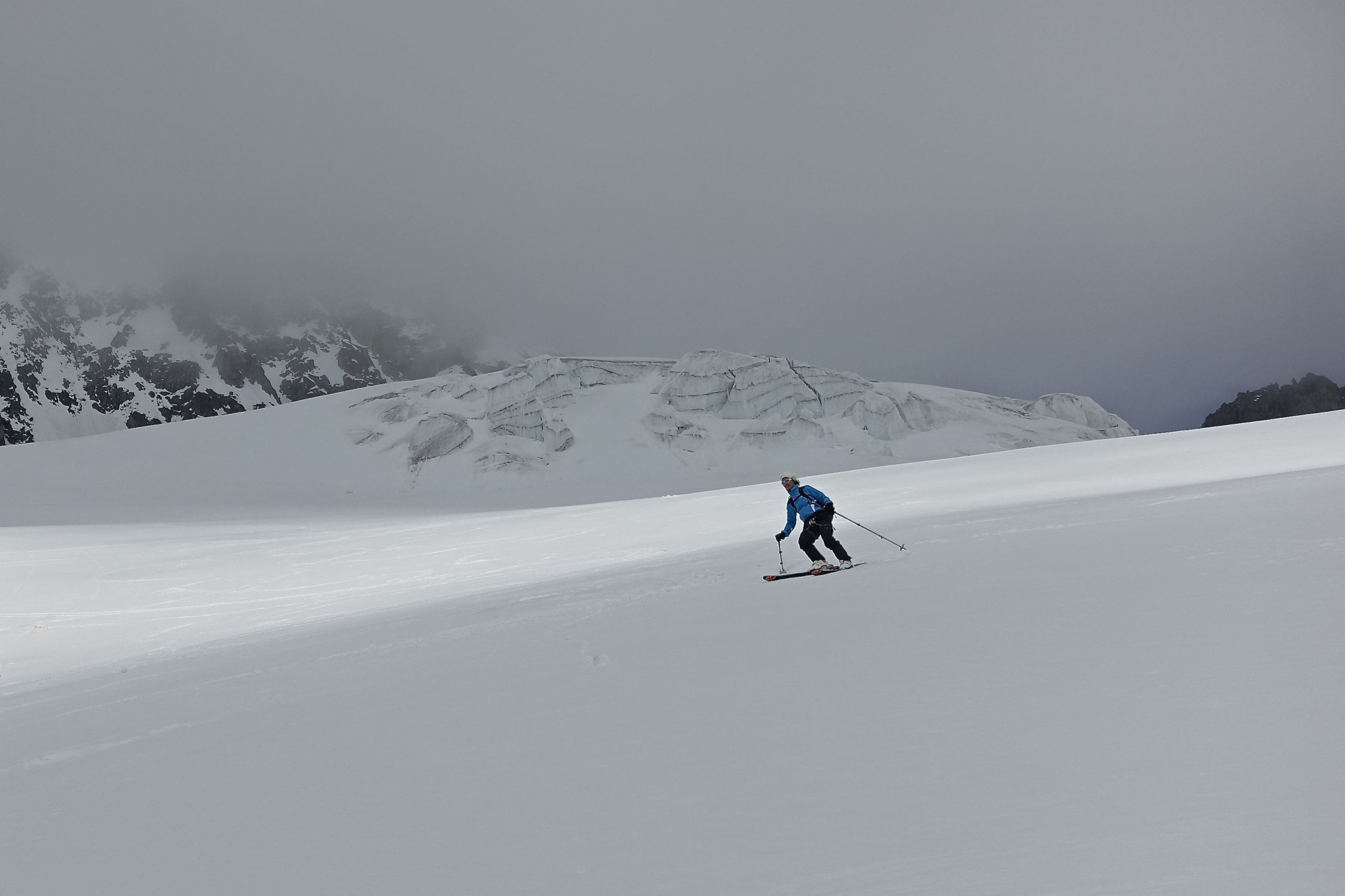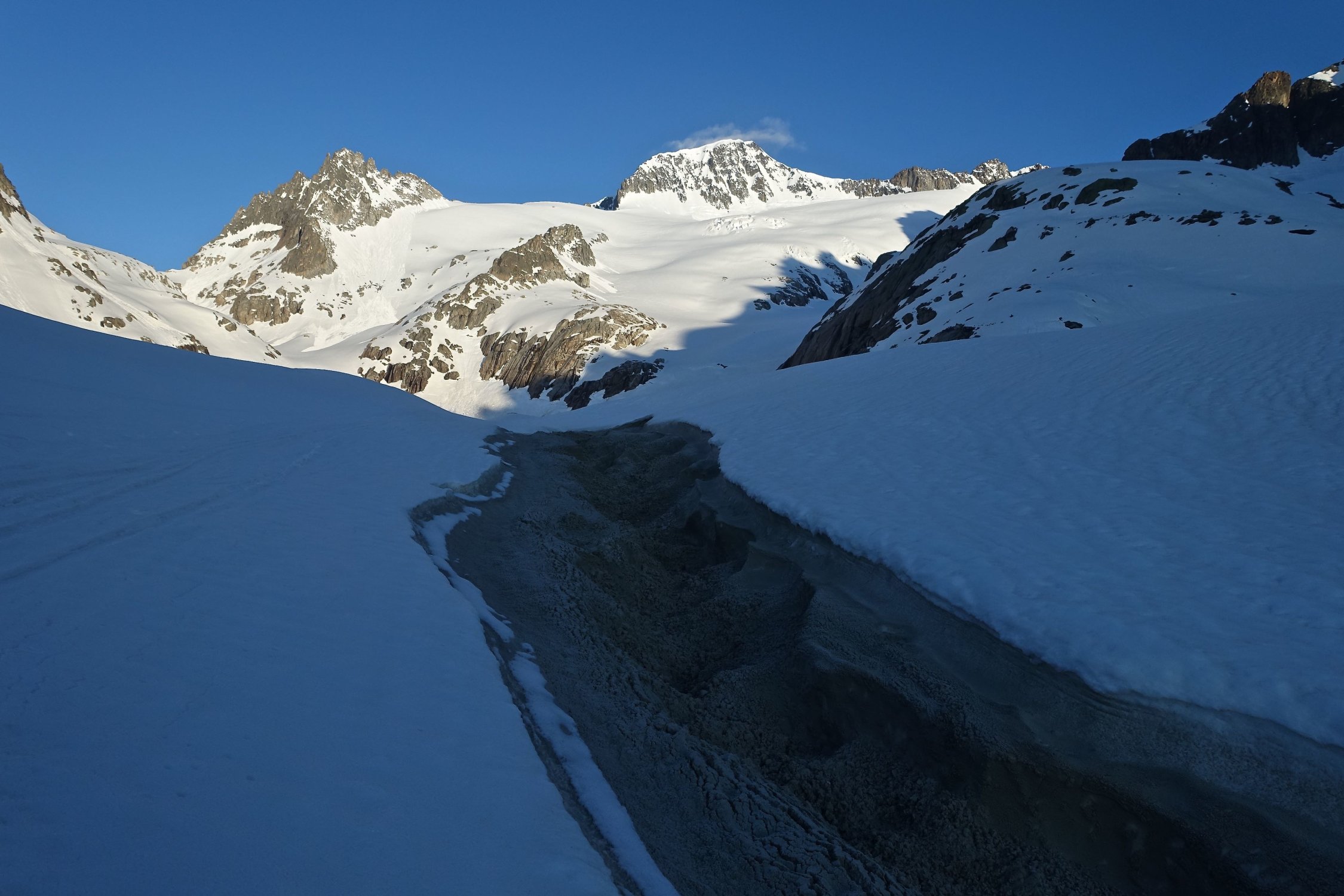Auf dem steilen unteren Teil des Tiefengletschers waren dann Harscheisen dienlich. Sobald die Sonne die Hänge beschien, sofort wieder (viel zu-) warm und aufgesulzt.