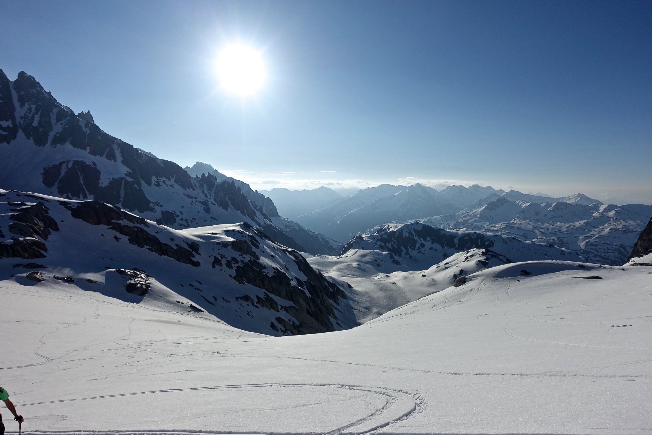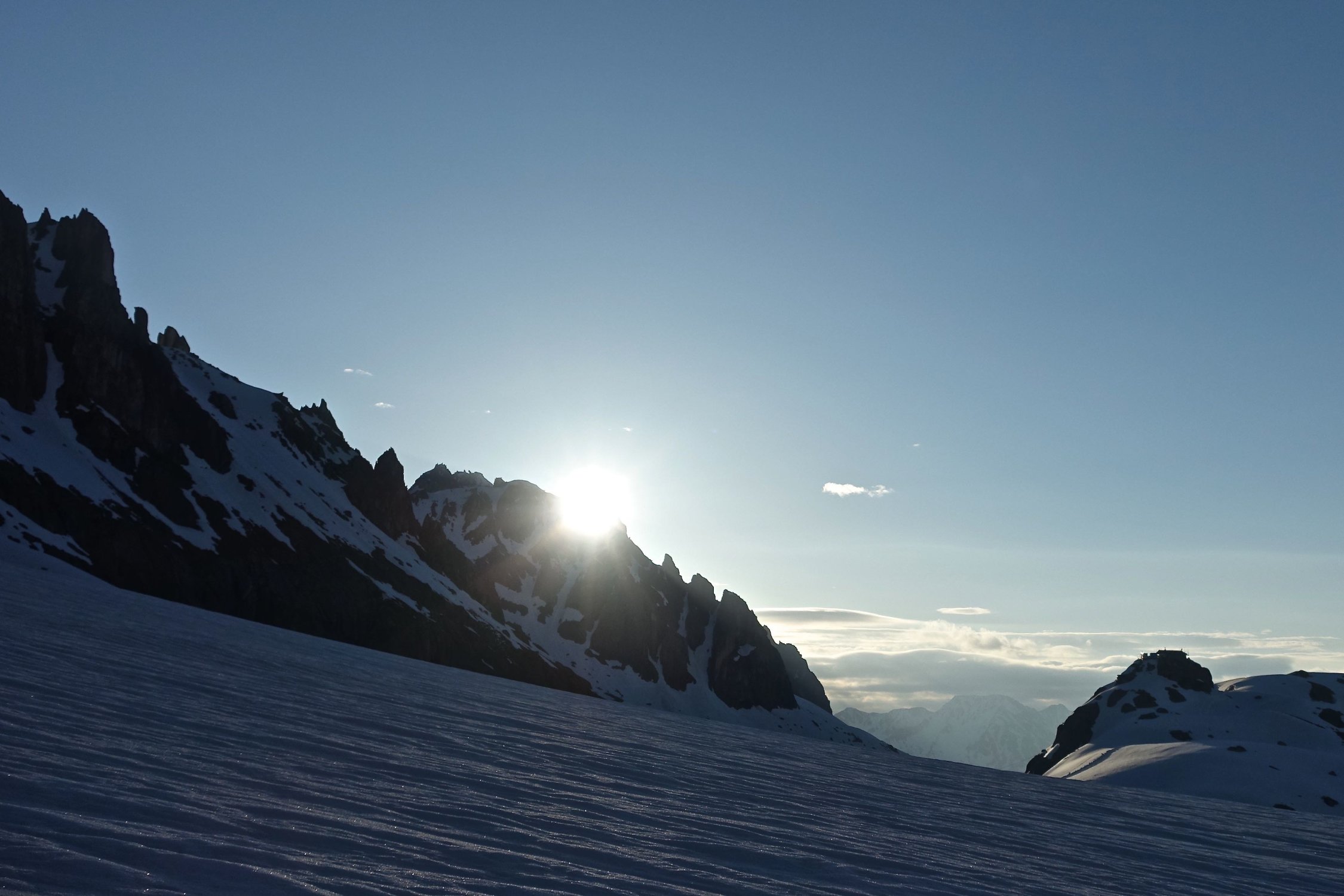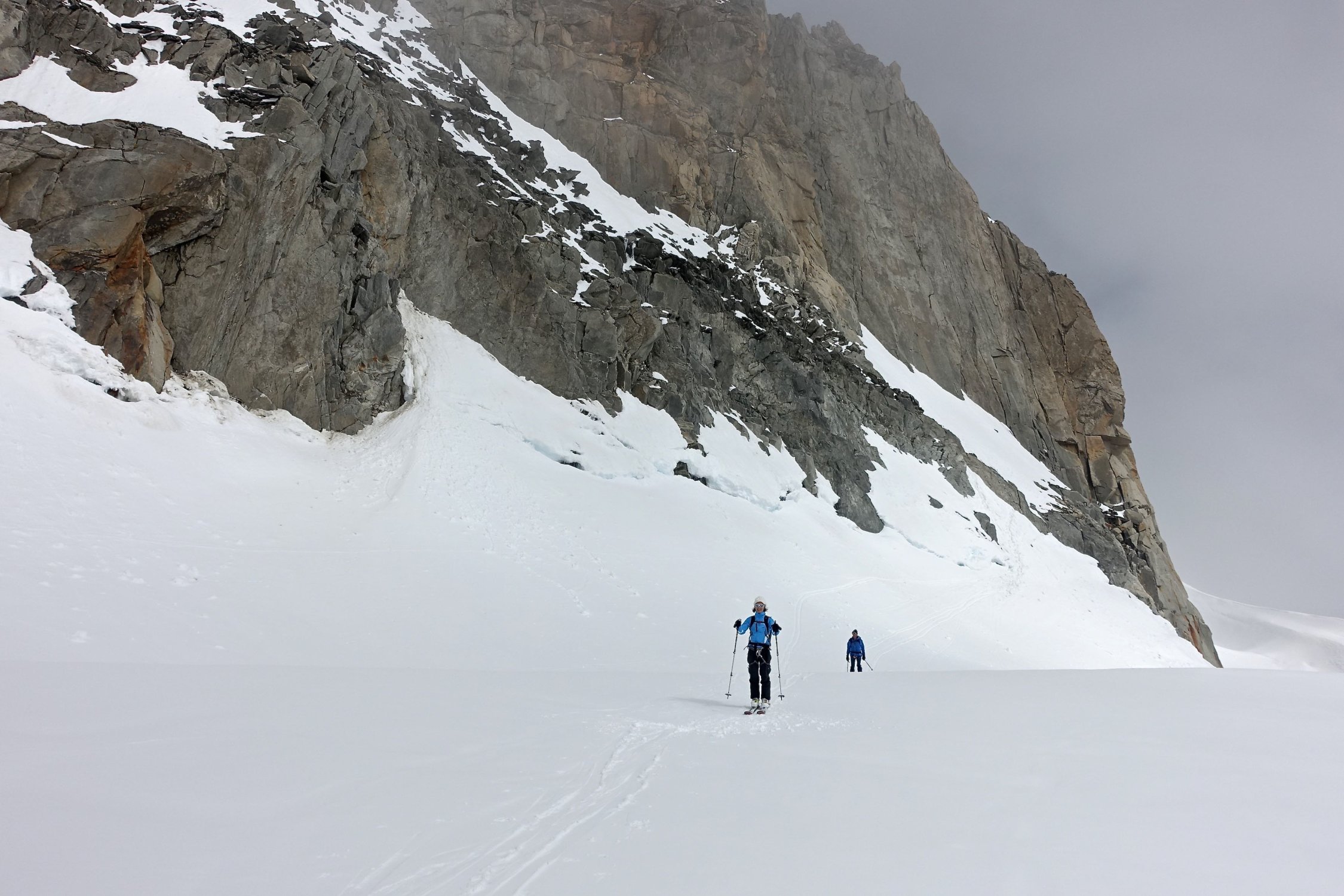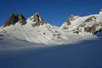 Auf dem steilen unteren Teil des Tiefengletschers waren dann Harscheisen dienlich. Sobald die Sonne die Hänge beschien, sofort wieder (viel zu-) warm und aufgesulzt.