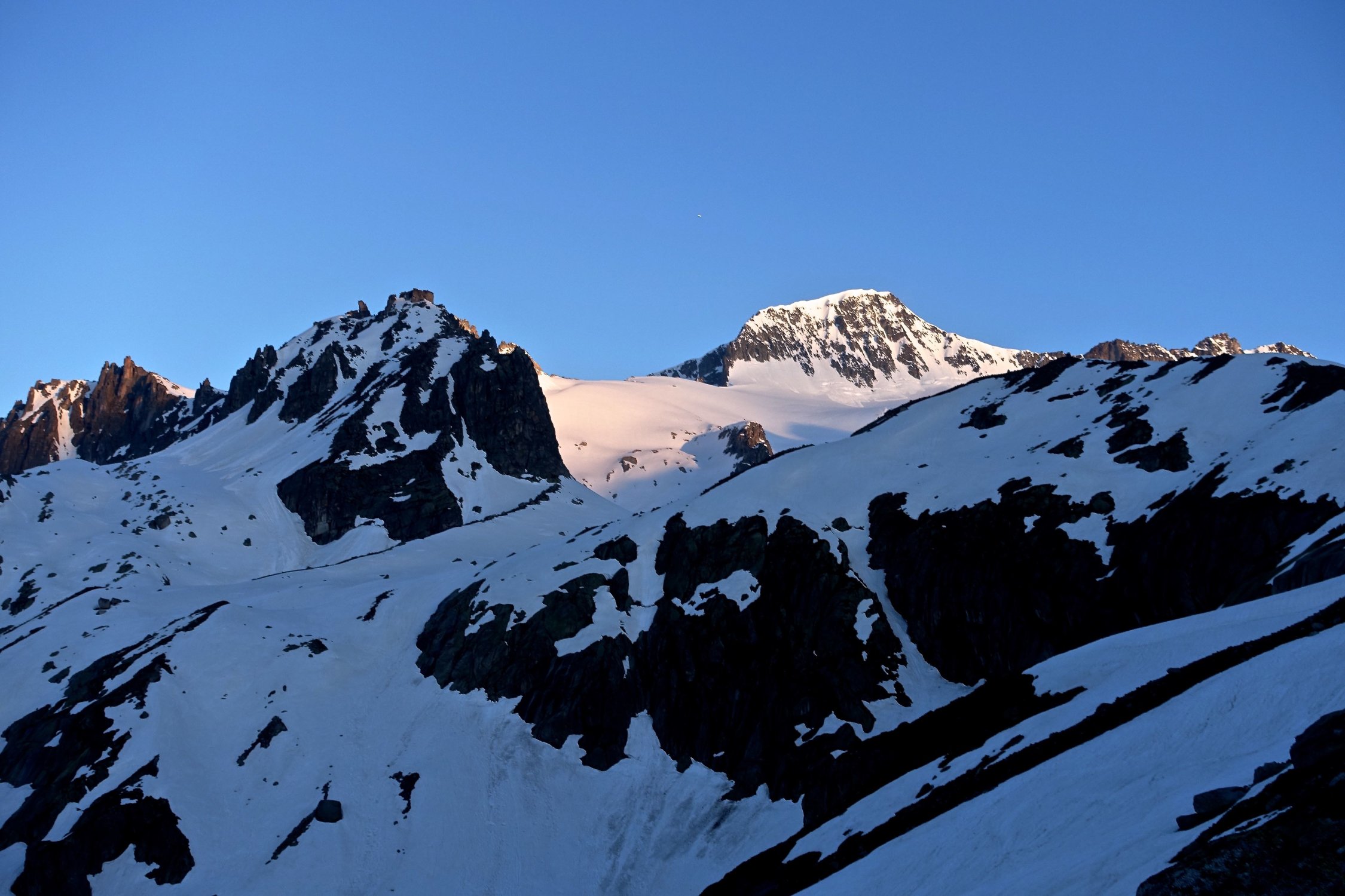 Man weiss es ja, aber es ist derzeit einfach zu warm. Beim Start im Tiefenbach um 05:15 Uhr plus 7 Grad. Trotz Aufklaren am frühen Morgen nur spärliche Abstrahlung und erst auf etwa 2400 m leicht gefrorene und tragende Schneedecke.