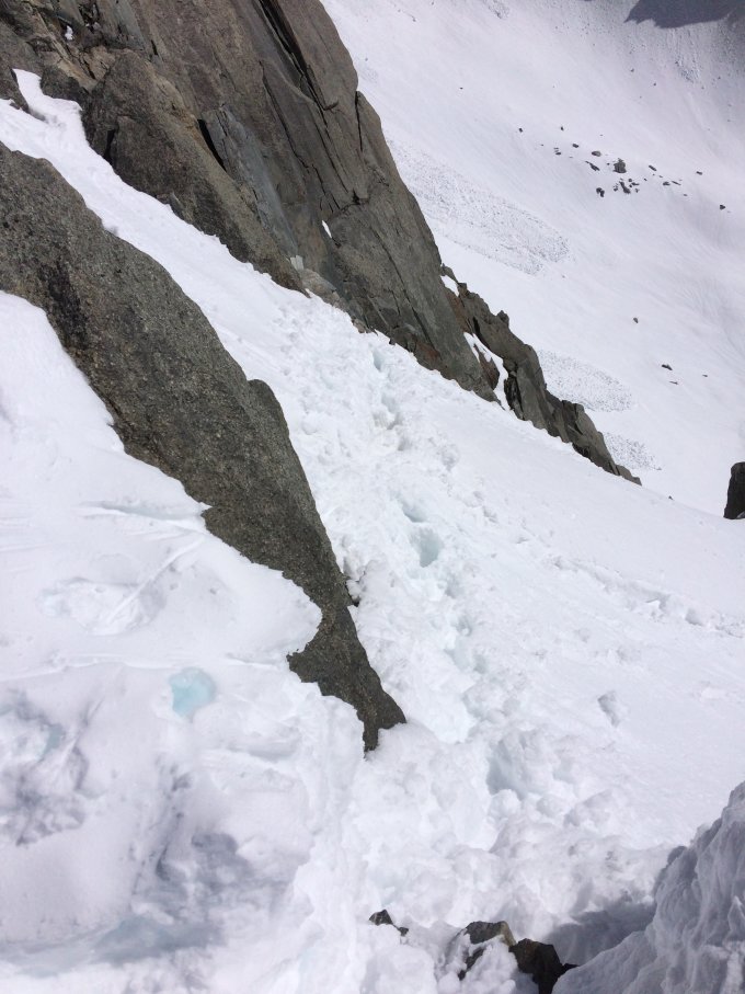 Wenn es so warm bleib und kein neuer Schnee dazu kommt, wird das Couloir bald schneefrei sein.