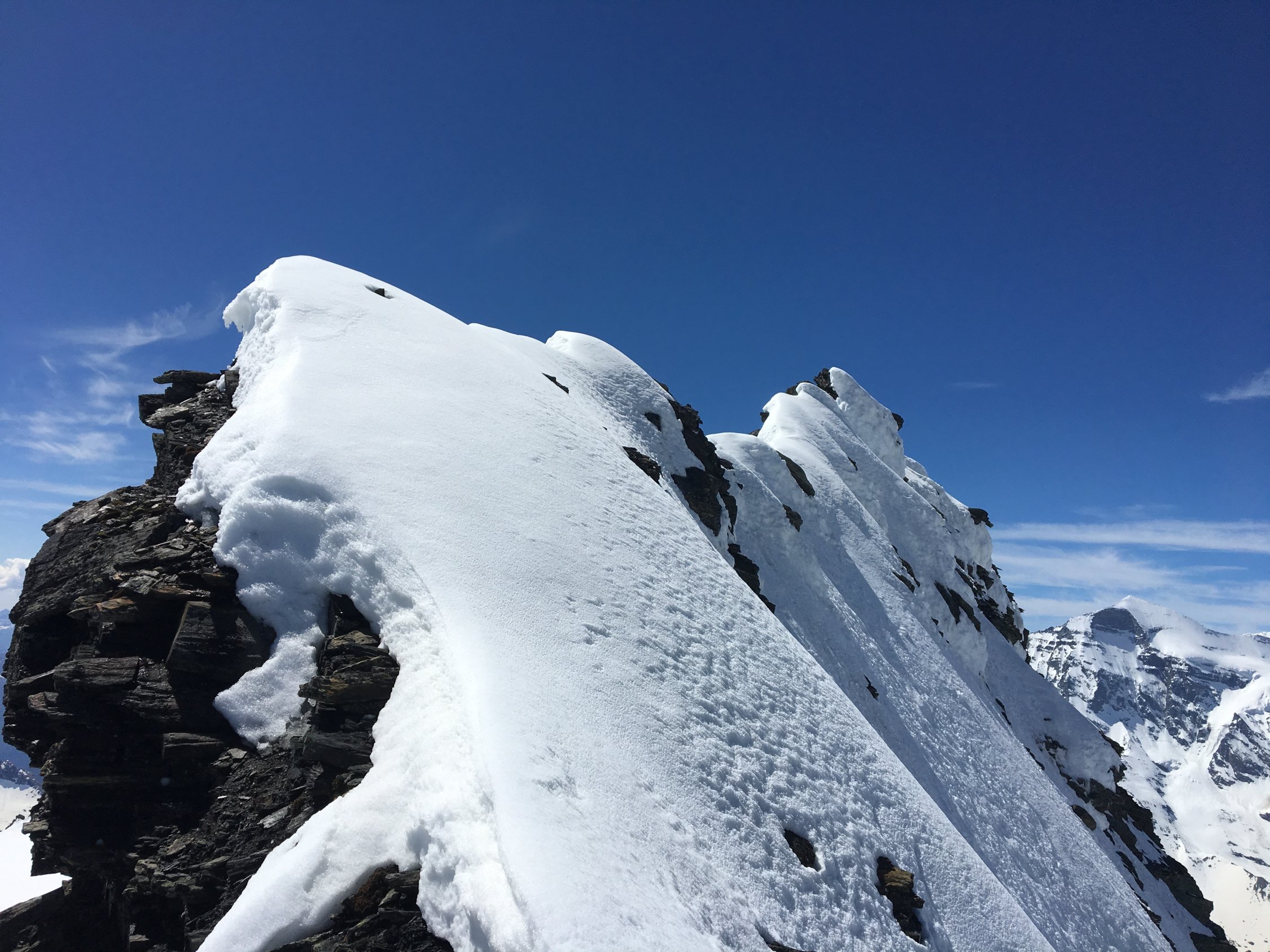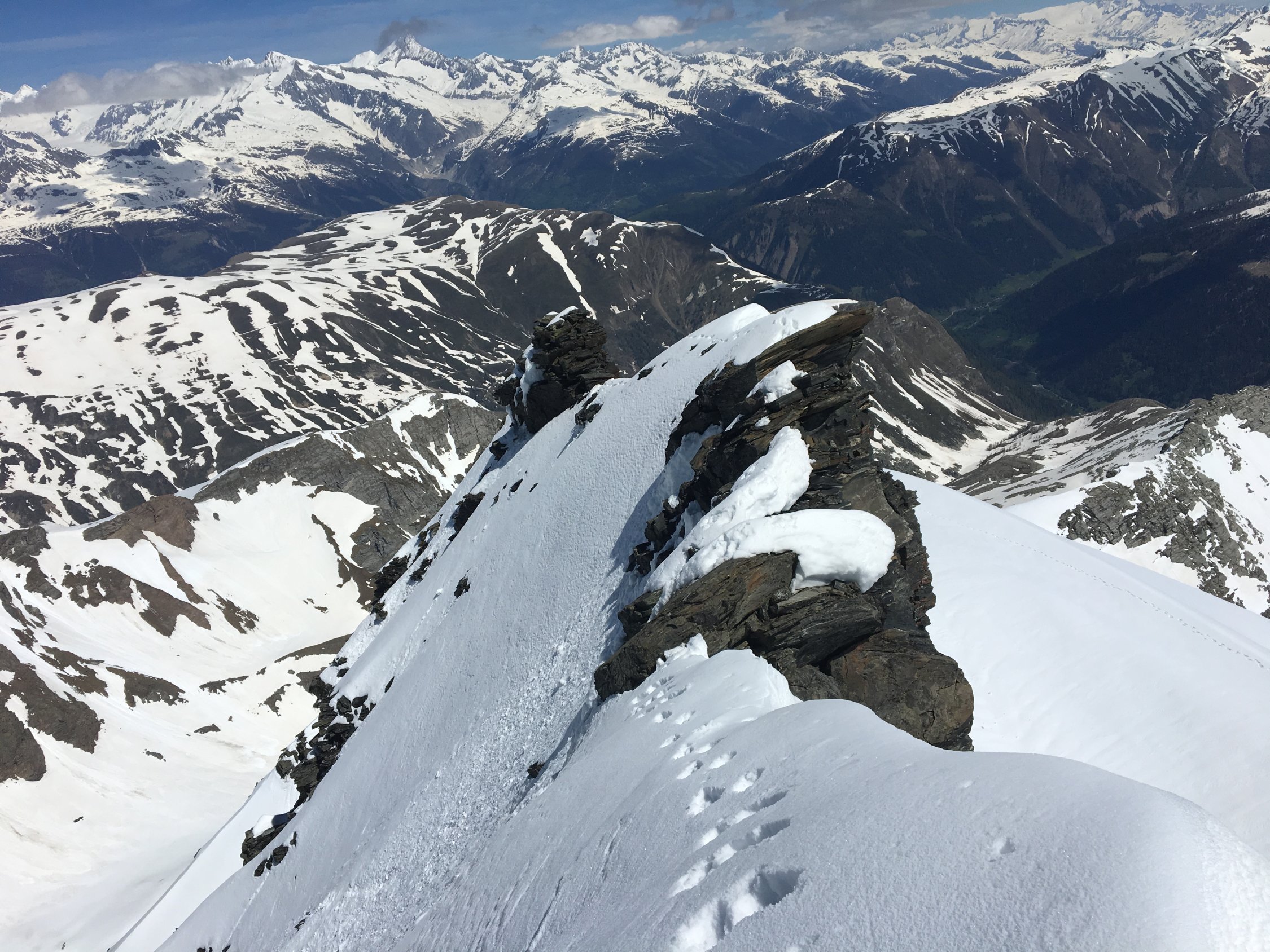 Tolle Tour (kann eigentlich nicht anders sein), anspruchsvolles Gipfelziel, das erarbeitet werden muss. Tolles Ambiente in absoluter Abgeschiedenheit. Mai ist für diese Tour wohl der beste Monat, wenn die Wächten am Gipfelgrat gerade abgebrochen sind, aber noch genug firn vorhanden ist, der ein sicheres vorankommen ermöglicht. Entgegen vieler anderer Berichte ist der Grat nicht so schrecklich, es bieten sich zumindest ausreichend sicherungsmöglichkeiten. Kletterstelken max 2ter Grat, Aufgrund Ausgesetztheit und einiger delikater Stellen nicht zu unterschätzen.