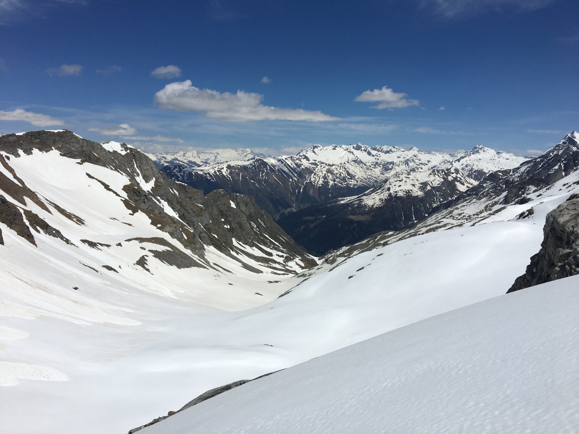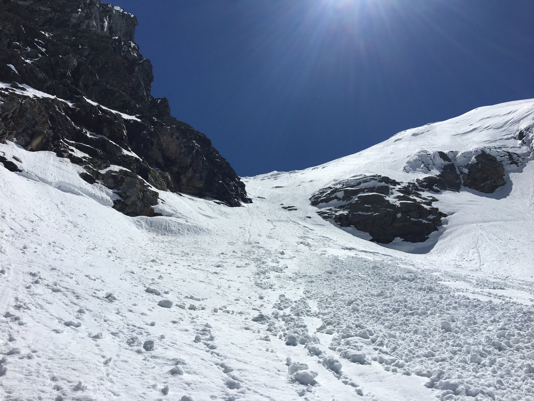Start 5:15 heiligkreuz, bei 5 Grad nach klarer Nacht. Sommerweg bis 2000 m aper, letzte 100 Hm Skiportage (Trittschnee) bis Chummibort. Ab Chummibort fest gefroren. Für Ostcouli wäre Start gegen 4:00 besser gewesen, hier Pflotsch und tropische Temperaturen (die Sonne scheint ab 7:00 ins Couli, die Tücken der Ostexpo...). Mit Ski bis 2600 m, letzte 350 m zu Fuss, vielfach knietiefes Einsinken, Steigeisen nicht notwendig. Ausstieg Bonacossa Couli 9:30. Traverse Vllt heikelster Teil, da steil und sehr weich. Gipfelgrat ostseitig aper, westseitig noch hart gefroren, dadurch einige heikle Traversen um Gendarme gut zu verantworten. Ab Hillejoch Skiabfahrt, griffige Unterlage im Westcouloir. Steinugletscher nicht traversiert sondern in direkter Linie nach Norden abgefahren. In übliche Skiroute gen Mättital etwas unterhalb (nordseitig) Steinejoch eingeschnitten. Bis hier feinster Sulz (13:00 / 2600 m, Expo Nord). Bis zum Vereinigungspunkt mit Aufstiegsroute Bremsschnee, aber gut fahrbar.