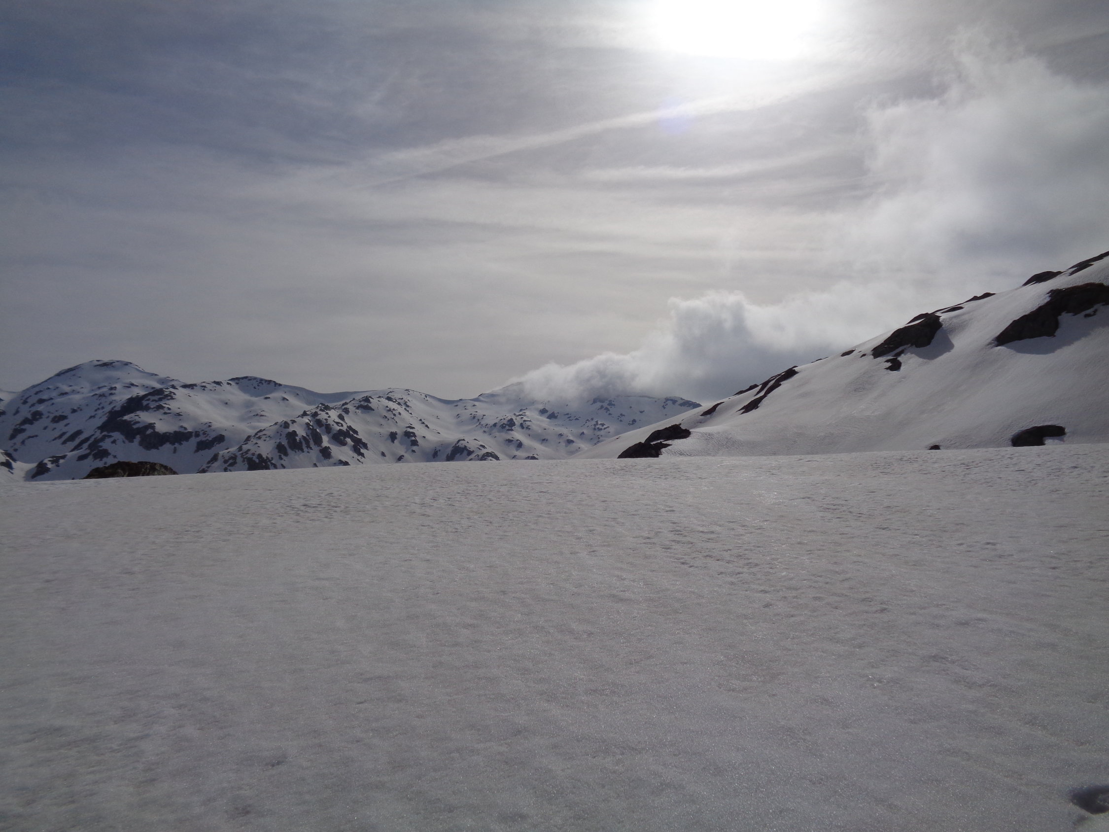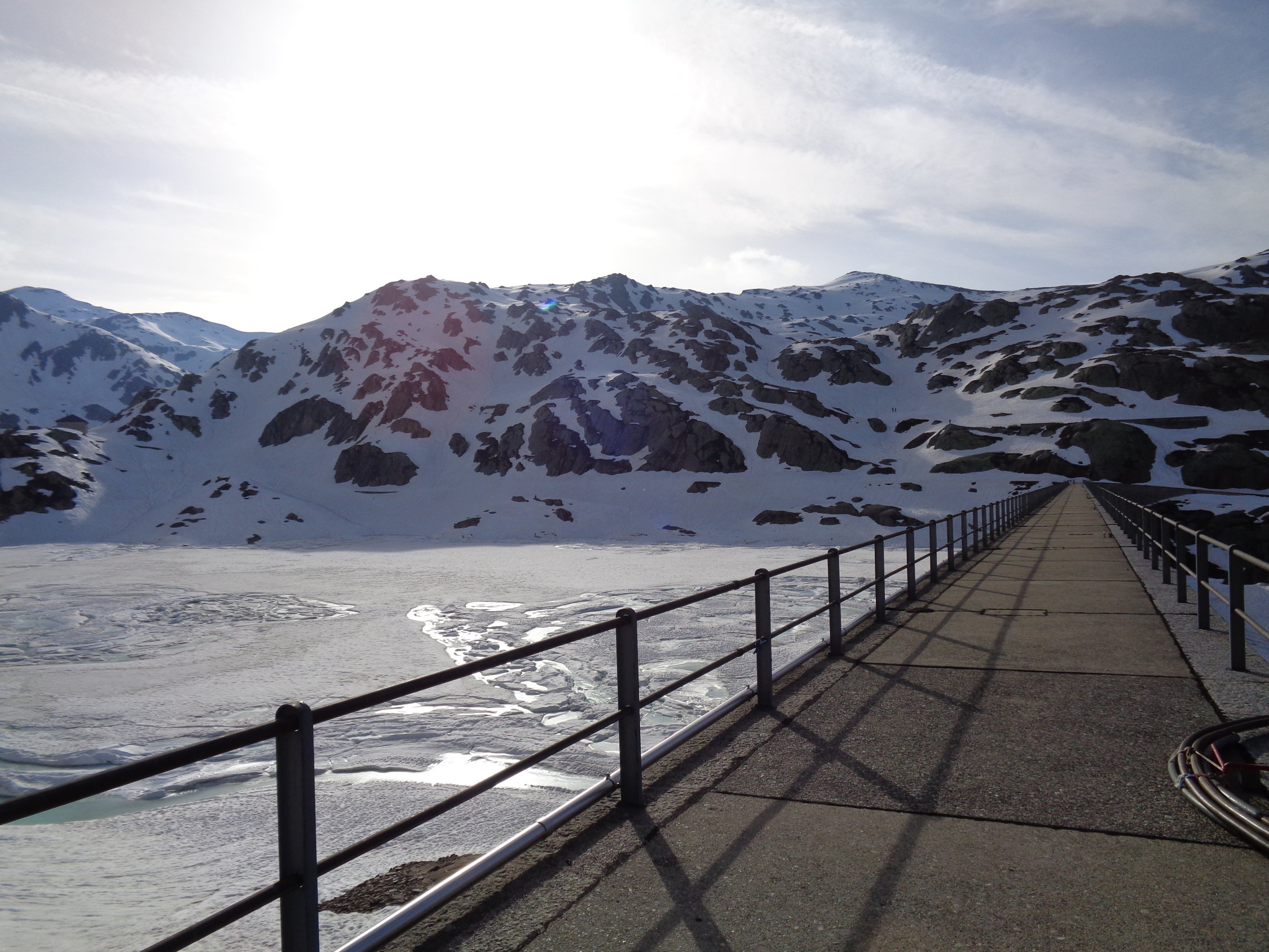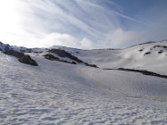 Die Strecke vom Gotthard-Hospiz zur Staumauer ist ein langer Latscher, für den ich ca. 1 Std. brauchte, die Skis meistens an den Füssen, 2-3 Tragestrecken. Von der Staumauer zum Gipfel meistens gut tragender Altschnee. Den eigentlichen Gipfel habe ich nicht erreicht, sondern einen kleinen Vorgipfel, da die immer mehr Wolken die ganze Gegend einhüllten. Das war auch der Grund warum ich nicht den eigentlich geplanten Giübin angepeilt habe, sondern den kürzeren Posmeda. Kaum war ich gegen 9.30 abgefahren hellte sich der Himmel aber wieder auf...Parkplätze für Touren zu Fibbia/Lucendro kurz vor 7.00 schon alle belegt, viele Leute unterwegs