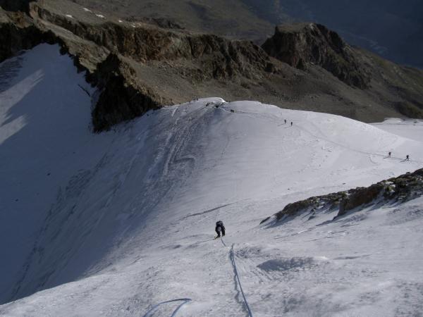 Von der Bovalhütte in die Fuorcla da Boval. Von dort sind wir das Eiswändchen hoch, und über denn Nordgrat zum Gipfel! Ist auch nicht schwierig, dafür keine Leute und ein wenig mehr "Action". Für das Eiswändchen jedoch Eisschrauben notwendig! Über Normalweg zurück zur Bovalhütte! sehr einfache Hochtour, mit einfachen schönen Kletterstellen.