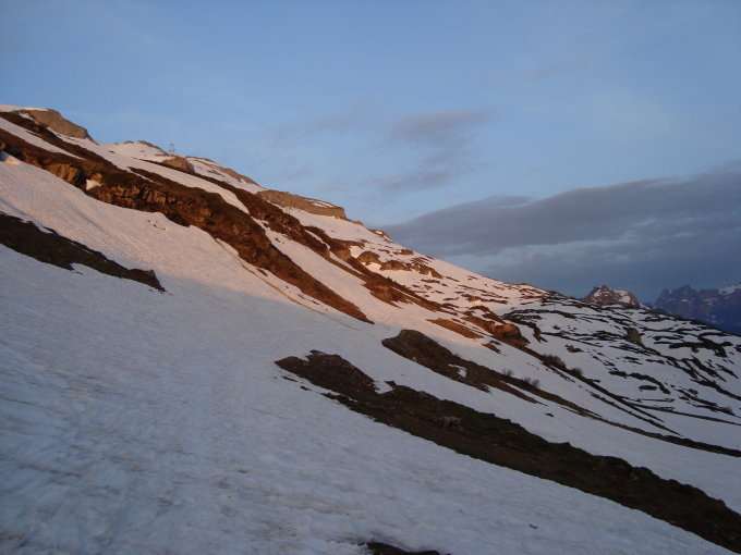 Start der Tour ca. 5.30Uhr bei 10°C und noch klarem Himmel mit leichter Bewölkung. Die Schneedecke war ab Klausenpass bis etwas unterhalb Chammlilücke nicht gefroren, jedoch gut tragend. Ab da bis Skidepot fest und oberflächig gefroren. Ich bin, wie einige andere auch, durch die markante Rinne am Fusse der Westflanke des Chammlibergs aufgestiegen. Dies ging ganz gut, man muss aber mit Spitzkehren einige Lawinenrunsen queren.
