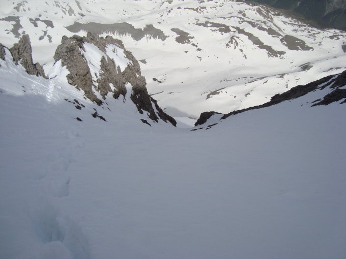 Es ist schon einiges aus der SW-Flanke runtergekommen, so dass man bis zum Skidepot über einen Lawinenhang traversieren muss. Dies ist aber kein Problem. Nach dem Skidepot wartet gleich die Schlüsselstelle der Tour, in Form einer kurzen Wandstufe auf. Auch die nächsten 10m ist die Schneedecke schon relativ dünn, was besondere Aufmerksamkeit, besonders im Abstieg erfordert. Danach ging es in gutem Trittschnee die doch recht steile Flanke bis zur Lücke und weiter zum Gipfel. Auch die aufsteilenden Meter vor der Lücke sind noch(!) gut gedeckt.