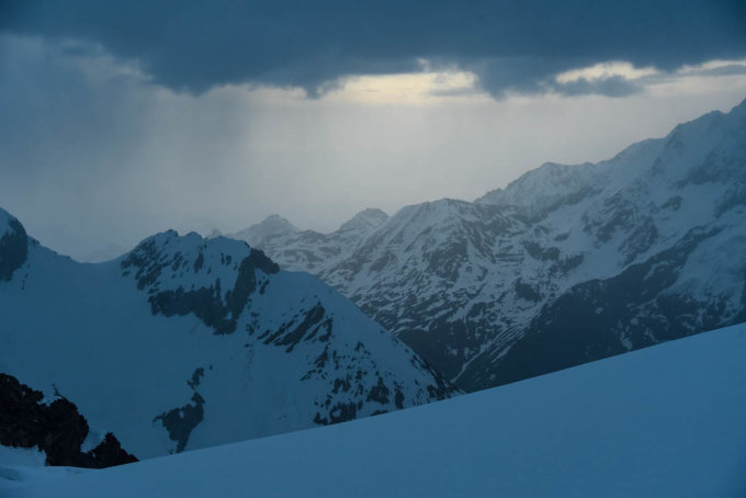 Start um 3:00 in der Rothornhütte war keinesfalls zu früh. Wegen dünnen Schleierwolken in der Nacht war Abstrahlung eher knapp. In Wolken und sogar leichtem Schneefall standen wir um 5:00 auf dem Gipfel des Ober Äschhorn. Kurze Abfahrt. Hohlichtgletscher sehr gut eingeschneit, Aufstieg Südflanke Schalihorn guter Trittschnee. Gipfelgrat sehr ausgesetzt, um 8:20 erreichten wir den Gipfel des Schalihorns.