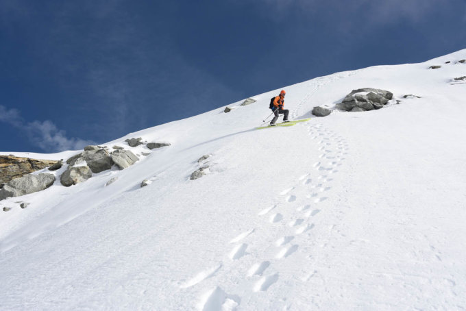 Abfahrt bis unterhalb Col de Moming. Aufstieg zum Col de Moming um 9:30 in bereits SEHR nassem Schnee. Abfahrt in der über 45 Grad steilen Westflanke. Durchgang durch Gletscherabbruch auf ca. 3500 schwierig zu finden. Direktabfahrt Richtung Norden (>45 Grad) auf den unteren Glacier de Moming und durch sehr nassen Schnee durch diverse Gräben bis auf ca. 2200m. Ab dort zu Fuss nach Zinal.