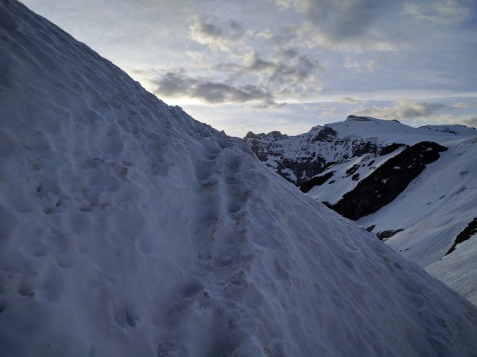 Nach den Gewittern war der Schnee eher feucht, nur auf den obersten 200Hm tragend gefroren. Zu Beginn kurze Tragepassage bis Brücke oberhalb des Hotels Steingletscher. Wird wohl bald länger. Die Strasse ist freigegeben bis Steinsee und geräumt bis Umpol, aber warum hochfahren wenn der Schnee noch für Aufstieg und Abfahrt reicht?