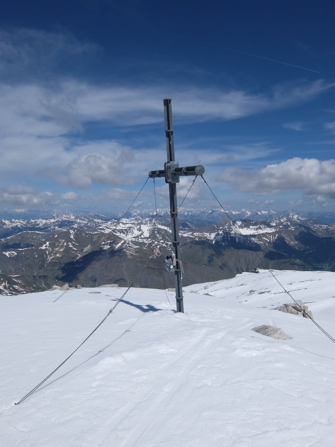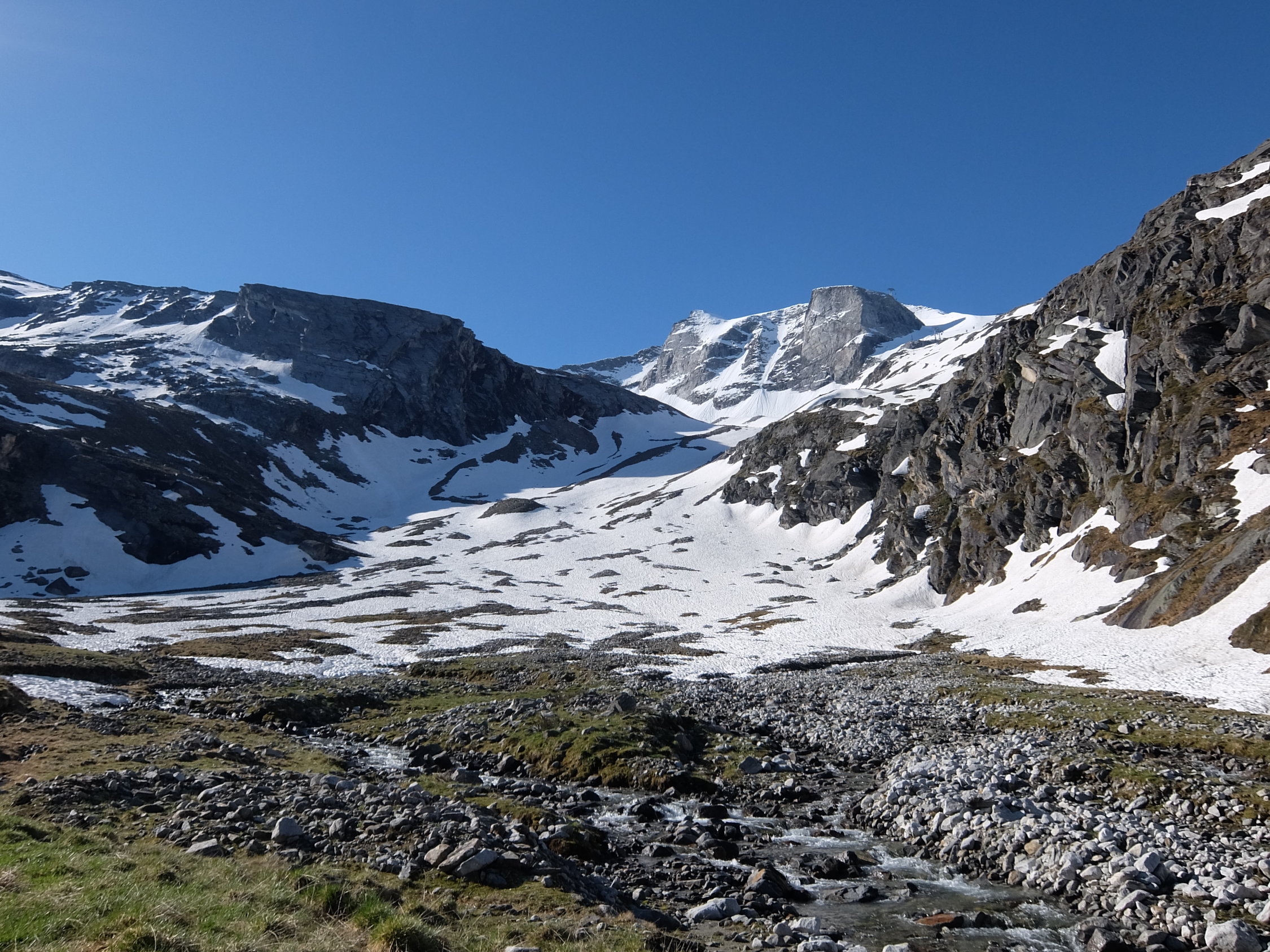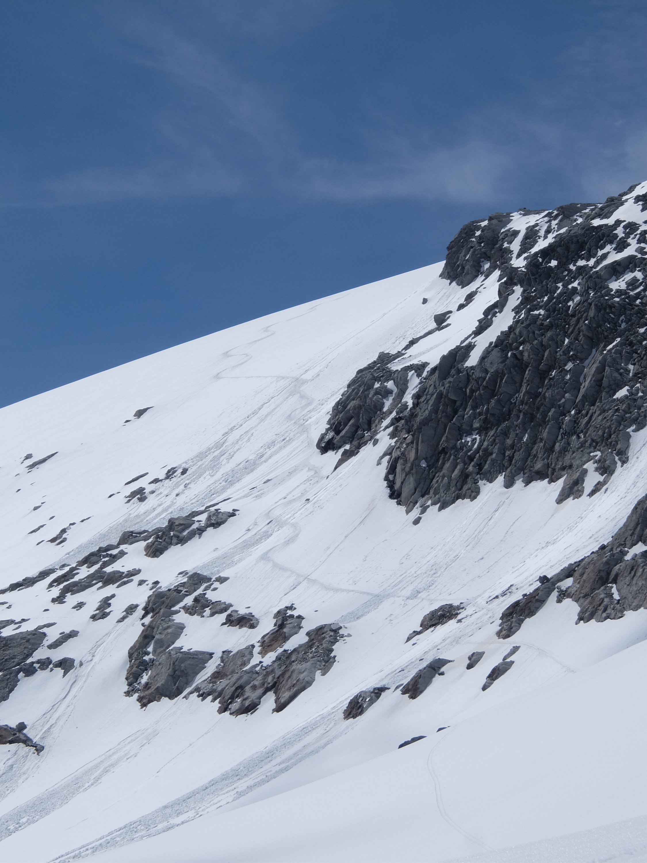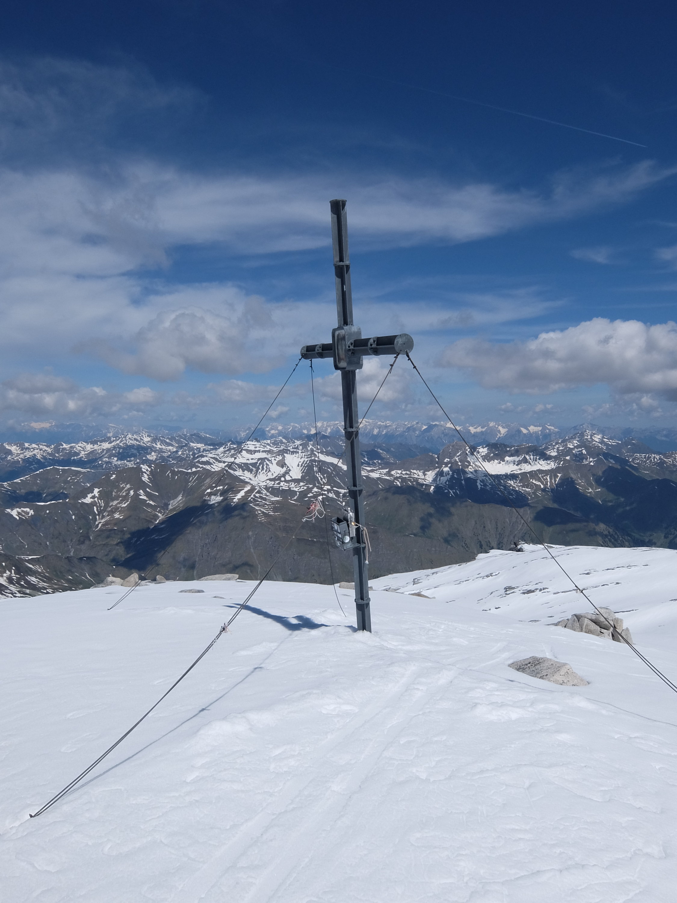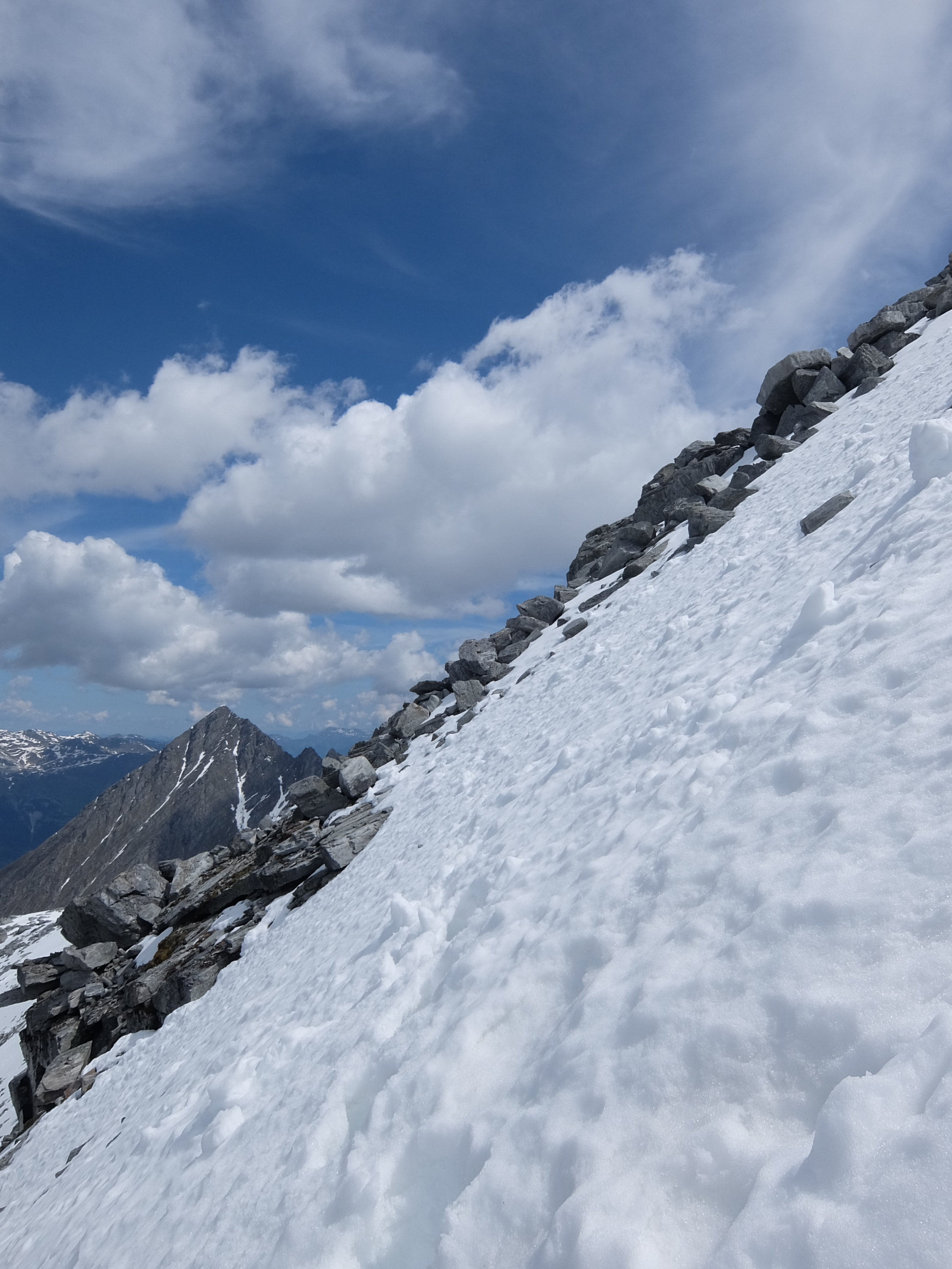 Von Mayrhofen mit dem ersten Bus nach Hintertux (1500 m), hier um ca. 6.40 Uhr gestartet. Bis ca. 2000 m ohne Schneekontakt, die zahlreichen Bachquerungen sind mit Teva-Sandalen kein Problem. Erste ernsthafte Schneefelder auf über 2000 m, wodurch ich auf Skischuhe umsteige. Auf dem Plateau erst auf ca. 2300 m weiter mit Skis. Positiv überraschend ist, dass der Schnee gleich durchgefroren ist. Da die Neigung moderat ist geht es ohne Harscheisen gut, vorbei am Tuxer Haus (bleibt rechts, etwas höher) dann links vorbei an der Friesenbergscharte. Erst bei der Querung unter dem Hohen Riffler lege ich Harscheisen an (ungemütlich wegen Lawinen). Die Rinne zur Scharte geht auch mit Harscheisen und weiter so zum Gipfel. Die letzten Meter sind ziemlich zäh, obwohl eigentlich flach, ich bin wohl die Höhe nicht gewohnt... das und die Hoffnung es noch auf den 12.30 Bus zu schaffen lenken mich vom ursprünglichen Plan ab (Abfahrt über Griererkar nach Juns, siehe Abfahrtsvariante 3 in der Routenbeschreibung), im Nachhinein wohl der bessere Plan (oder zumindest nicht schlechter). Zur Entscheidung trägt auch die Tatsache dass der Gipfelhang der Realspitze schon aper ist (zum Plan gehörte ev. auch noch die Abfahrt vom Gipfel in die Westrinne). So oder so, ich fahre zur Oberen Rifflerscharte über östliche Hänge (Federbettkees) ab. Das geht oben ziemlich gut aber sobald es steiler wird ist der Schnee schon deutlich zu weich (es ist ja auch schon 11 Uhr). Die Querung zur Scharte löst zahlreiche Nassrutschen ab (ich halte mich deswegen direkt unter den Felsen). Die Ernüchterung kommt als ich auf die andere Seite der Scharte blicke... kein Schnee weit und breit! Stattdessen schlimmstes Blockgelände. Nun die sinnvolle Entscheidung wäre gewesen, Variante 3 (Griererkar) noch zu retten, da der 12.30 Bus so oder so nicht mehr zu retten war, daran denke ich aber im Augenblick nicht. Stattdessen quere ich nach links wo noch etwas Schnee ist. Das geht schon lang genug, ich kann aber dennoch, ohne viel Rücksicht auf die Skis zu nehmen, bald wieder etwas fahren, hier im NW Hang ist der Schnee eher noch decklig (etwas Neuschnee kam vor 2-3 Tagen). Nach einer weiteren Querung auf Steinblöcken und dann mit Skis über riesige Lawinenkegel (auch Neuschnee), endlich im Kesselboden angelangt, peile ich die Aufstiegsroute an. Hier sind auf Sommerschnee ein paar schöne Schwünge möglich. Dann Skitragen bis zu einem weiteren Schneefeld, im steilen Teil unten, das wohl das skifahrerische Highlight des Tages darstellt. Der Rest ist wieder eine schöne Sommerwanderung, diesmal über einen anderen Weg (Rundweg Sommerberg-Hintertux). Ein erfrischender Bach wartet in Hintertux wo ich um ca. 13.30 Uhr ankomme und auf die 14 Uhr Bus warten muss.