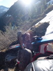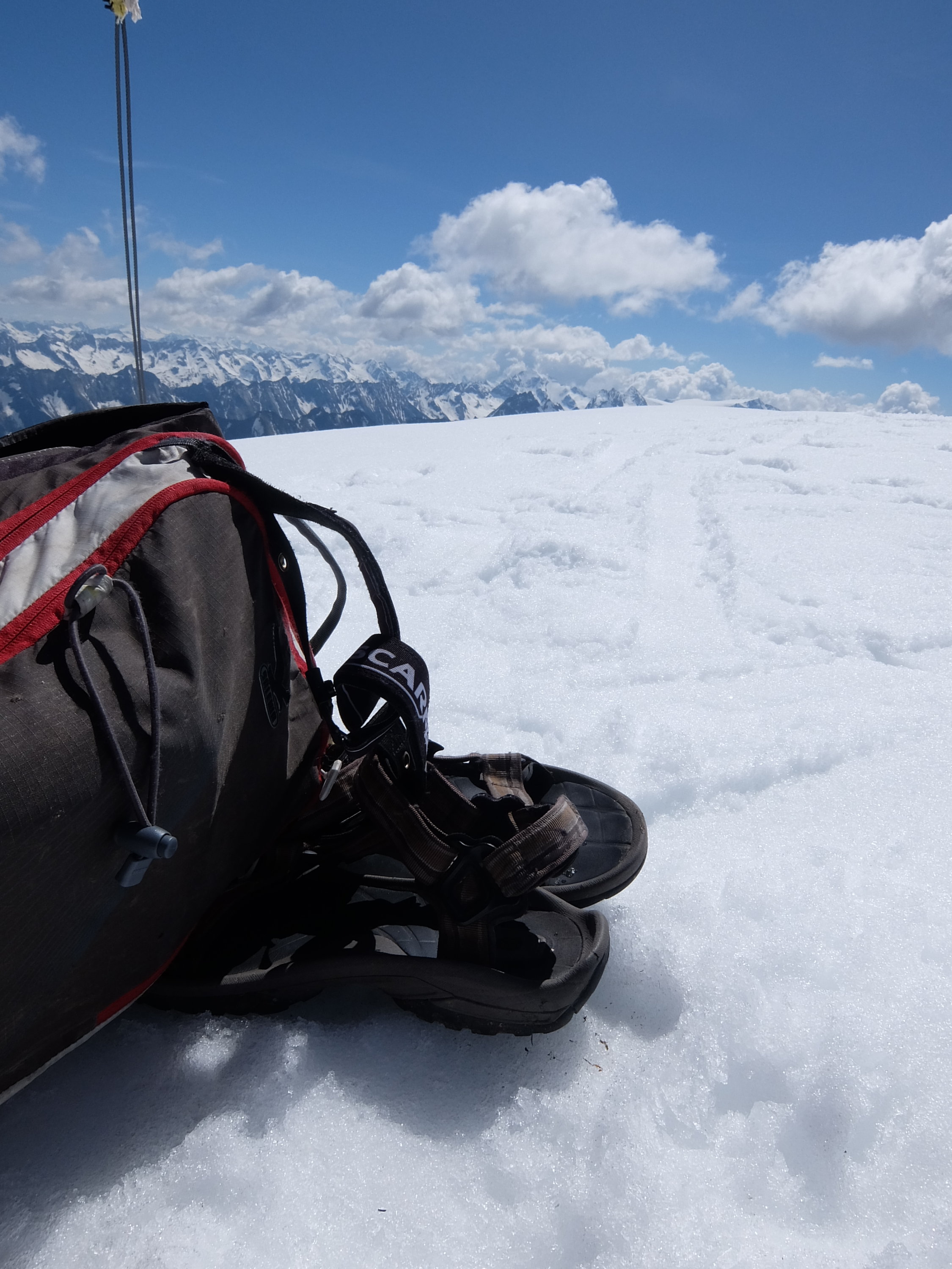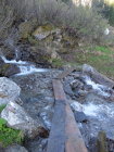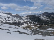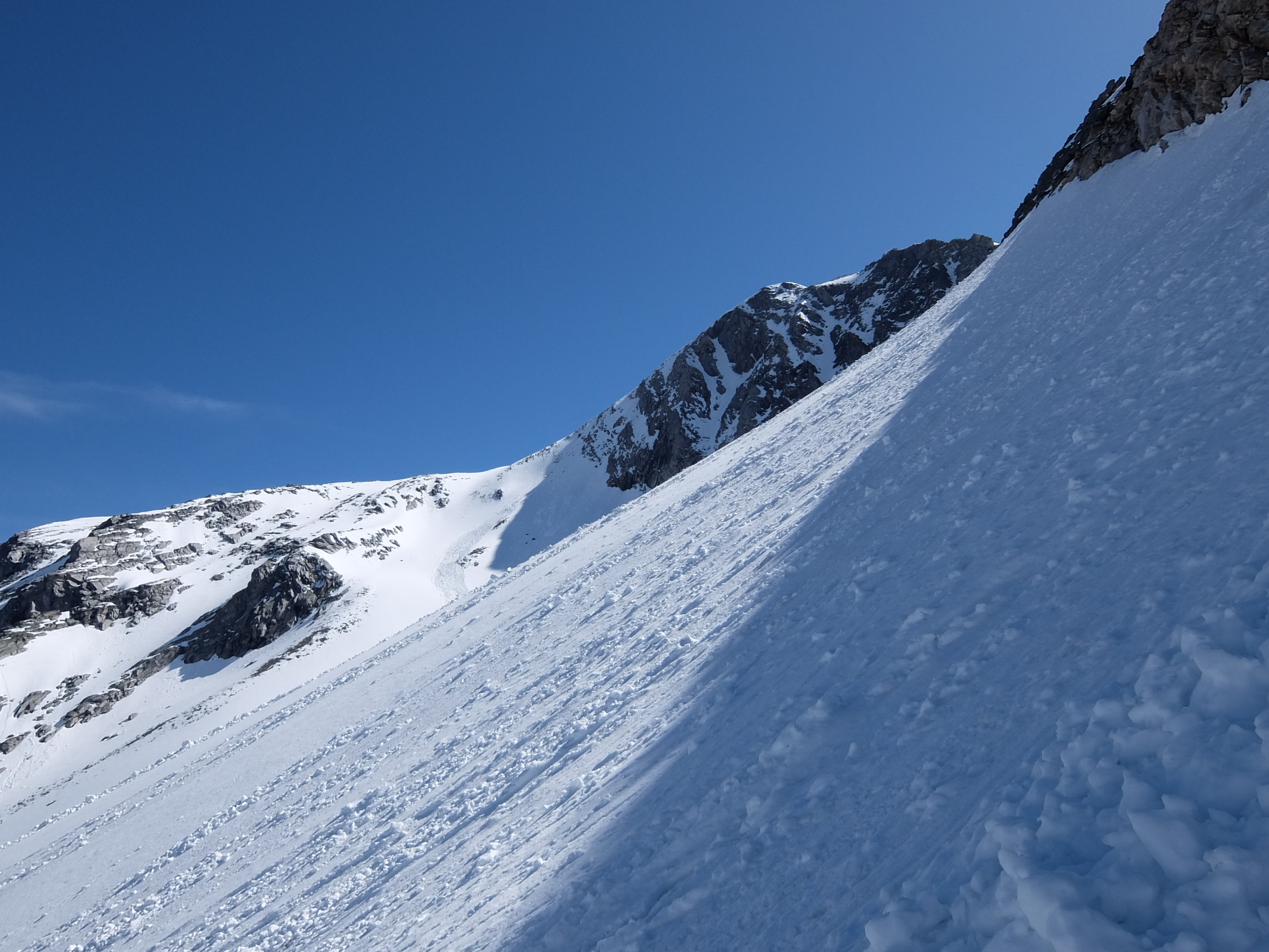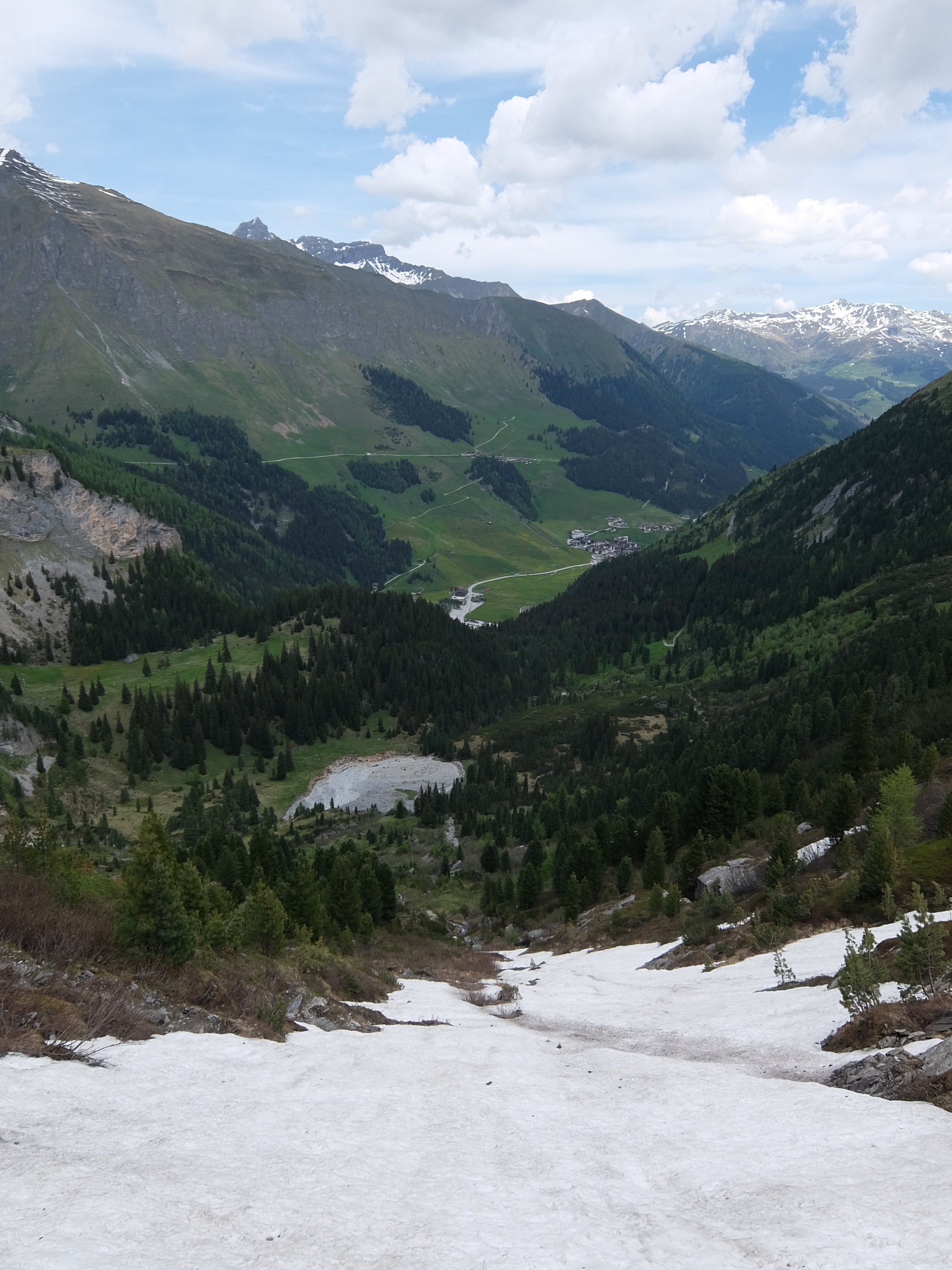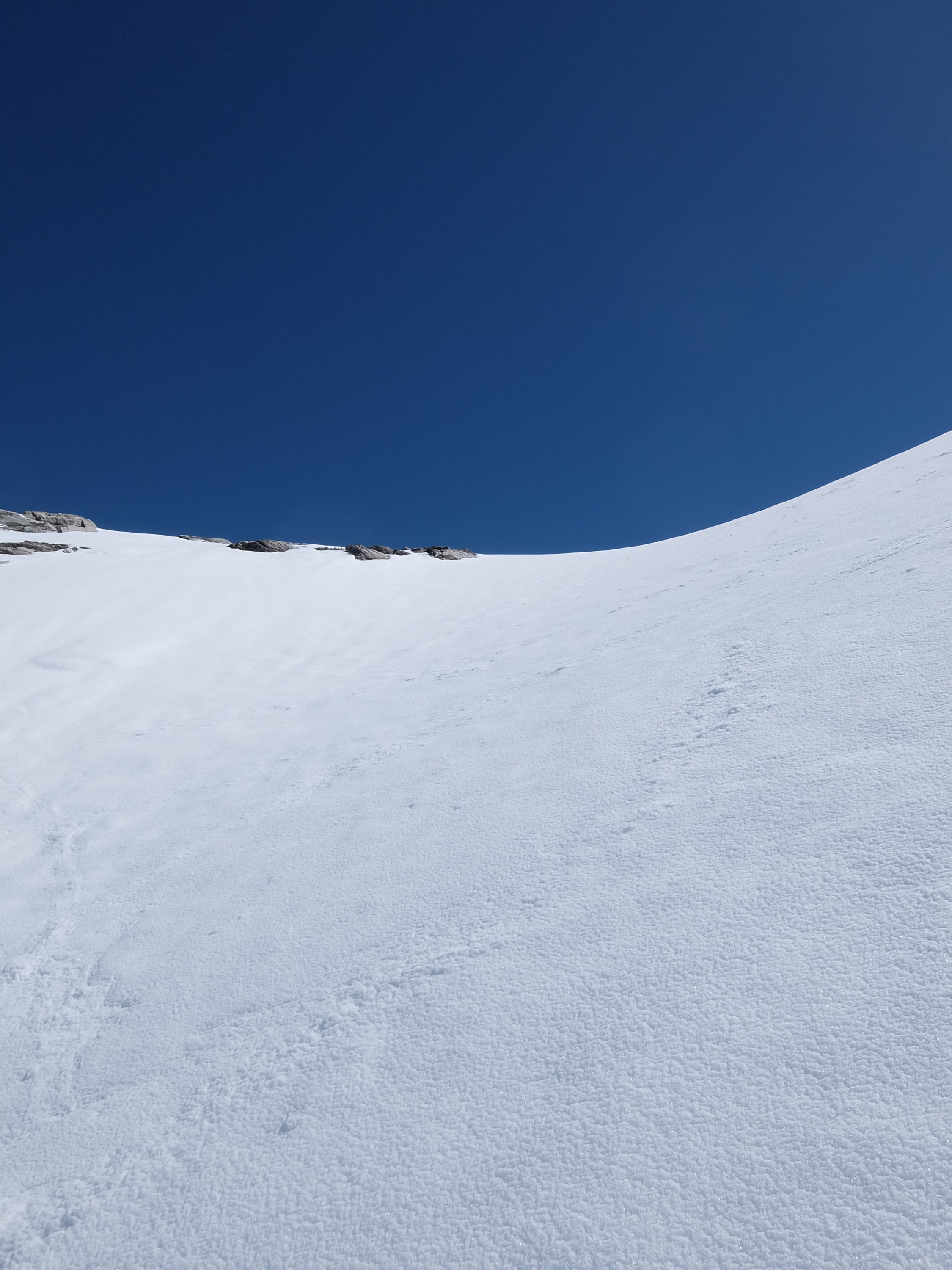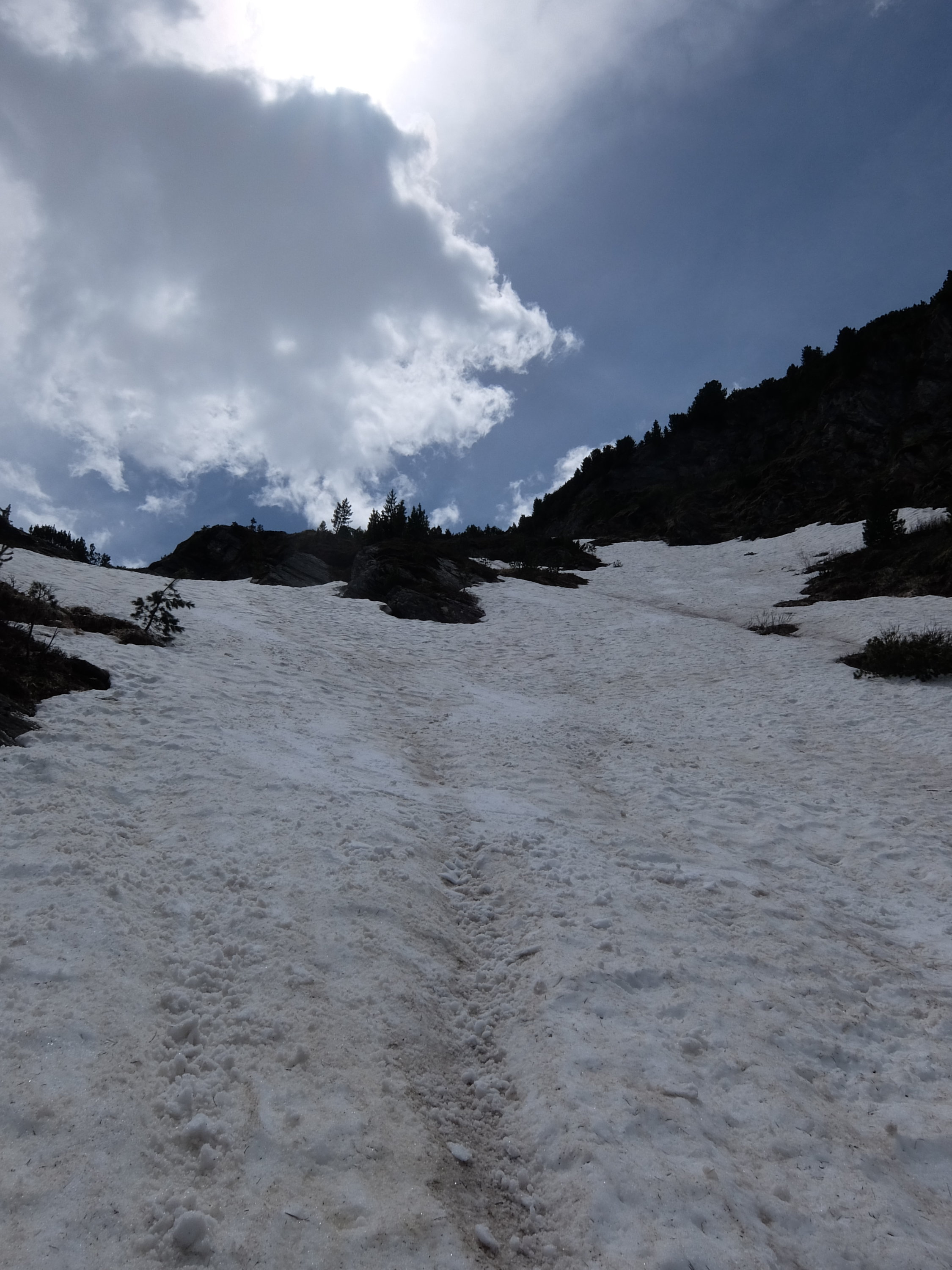 Von Mayrhofen mit dem ersten Bus nach Hintertux (1500 m), hier um ca. 6.40 Uhr gestartet. Bis ca. 2000 m ohne Schneekontakt, die zahlreichen Bachquerungen sind mit Teva-Sandalen kein Problem. Erste ernsthafte Schneefelder auf über 2000 m, wodurch ich auf Skischuhe umsteige. Auf dem Plateau erst auf ca. 2300 m weiter mit Skis. Positiv überraschend ist, dass der Schnee gleich durchgefroren ist. Da die Neigung moderat ist geht es ohne Harscheisen gut, vorbei am Tuxer Haus (bleibt rechts, etwas höher) dann links vorbei an der Friesenbergscharte. Erst bei der Querung unter dem Hohen Riffler lege ich Harscheisen an (ungemütlich wegen Lawinen). Die Rinne zur Scharte geht auch mit Harscheisen und weiter so zum Gipfel. Die letzten Meter sind ziemlich zäh, obwohl eigentlich flach, ich bin wohl die Höhe nicht gewohnt... das und die Hoffnung es noch auf den 12.30 Bus zu schaffen lenken mich vom ursprünglichen Plan ab (Abfahrt über Griererkar nach Juns, siehe Abfahrtsvariante 3 in der Routenbeschreibung), im Nachhinein wohl der bessere Plan (oder zumindest nicht schlechter). Zur Entscheidung trägt auch die Tatsache dass der Gipfelhang der Realspitze schon aper ist (zum Plan gehörte ev. auch noch die Abfahrt vom Gipfel in die Westrinne). So oder so, ich fahre zur Oberen Rifflerscharte über östliche Hänge (Federbettkees) ab. Das geht oben ziemlich gut aber sobald es steiler wird ist der Schnee schon deutlich zu weich (es ist ja auch schon 11 Uhr). Die Querung zur Scharte löst zahlreiche Nassrutschen ab (ich halte mich deswegen direkt unter den Felsen). Die Ernüchterung kommt als ich auf die andere Seite der Scharte blicke... kein Schnee weit und breit! Stattdessen schlimmstes Blockgelände. Nun die sinnvolle Entscheidung wäre gewesen, Variante 3 (Griererkar) noch zu retten, da der 12.30 Bus so oder so nicht mehr zu retten war, daran denke ich aber im Augenblick nicht. Stattdessen quere ich nach links wo noch etwas Schnee ist. Das geht schon lang genug, ich kann aber dennoch, ohne viel Rücksicht auf die Skis zu nehmen, bald wieder etwas fahren, hier im NW Hang ist der Schnee eher noch decklig (etwas Neuschnee kam vor 2-3 Tagen). Nach einer weiteren Querung auf Steinblöcken und dann mit Skis über riesige Lawinenkegel (auch Neuschnee), endlich im Kesselboden angelangt, peile ich die Aufstiegsroute an. Hier sind auf Sommerschnee ein paar schöne Schwünge möglich. Dann Skitragen bis zu einem weiteren Schneefeld, im steilen Teil unten, das wohl das skifahrerische Highlight des Tages darstellt. Der Rest ist wieder eine schöne Sommerwanderung, diesmal über einen anderen Weg (Rundweg Sommerberg-Hintertux). Ein erfrischender Bach wartet in Hintertux wo ich um ca. 13.30 Uhr ankomme und auf die 14 Uhr Bus warten muss.
