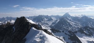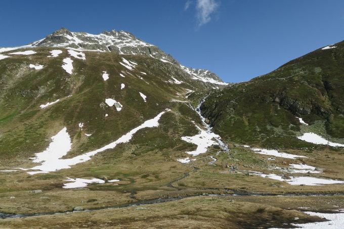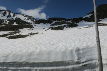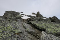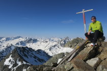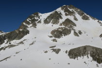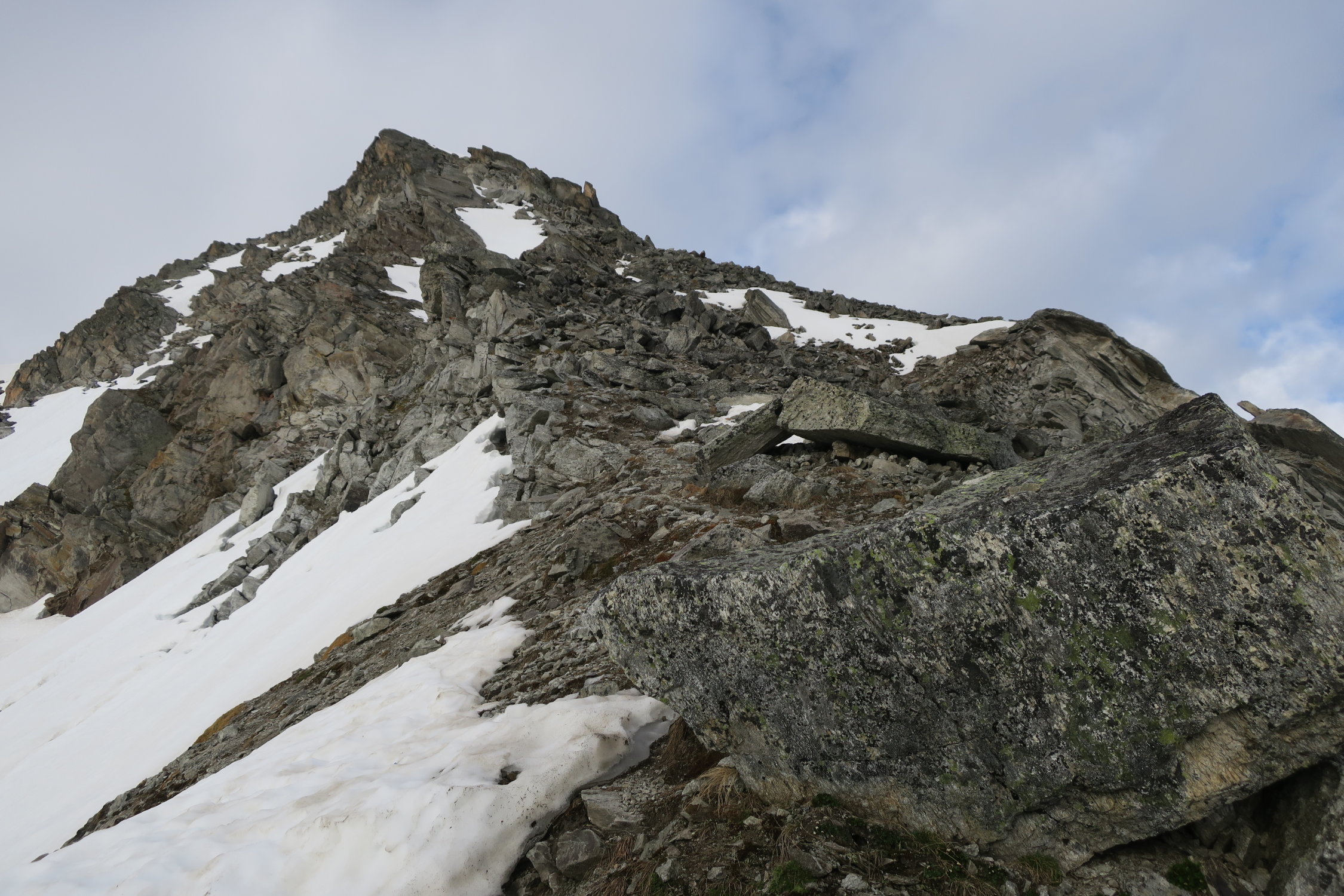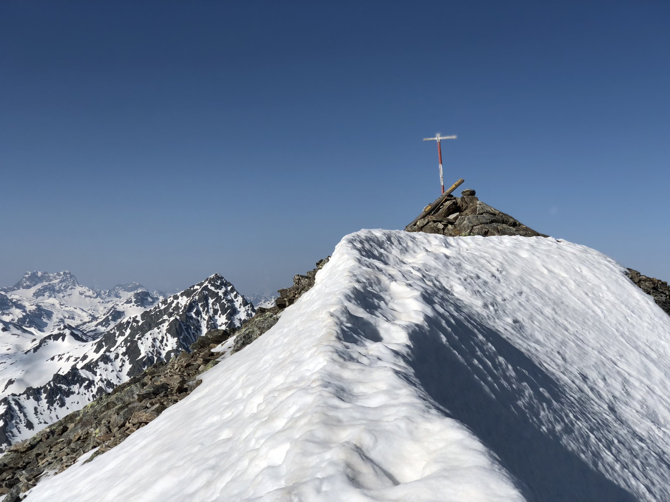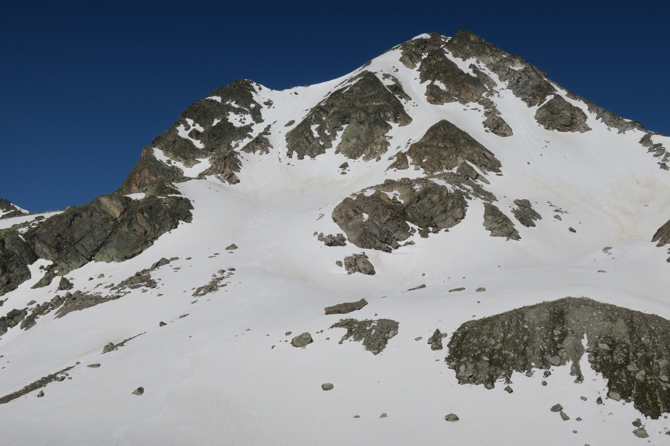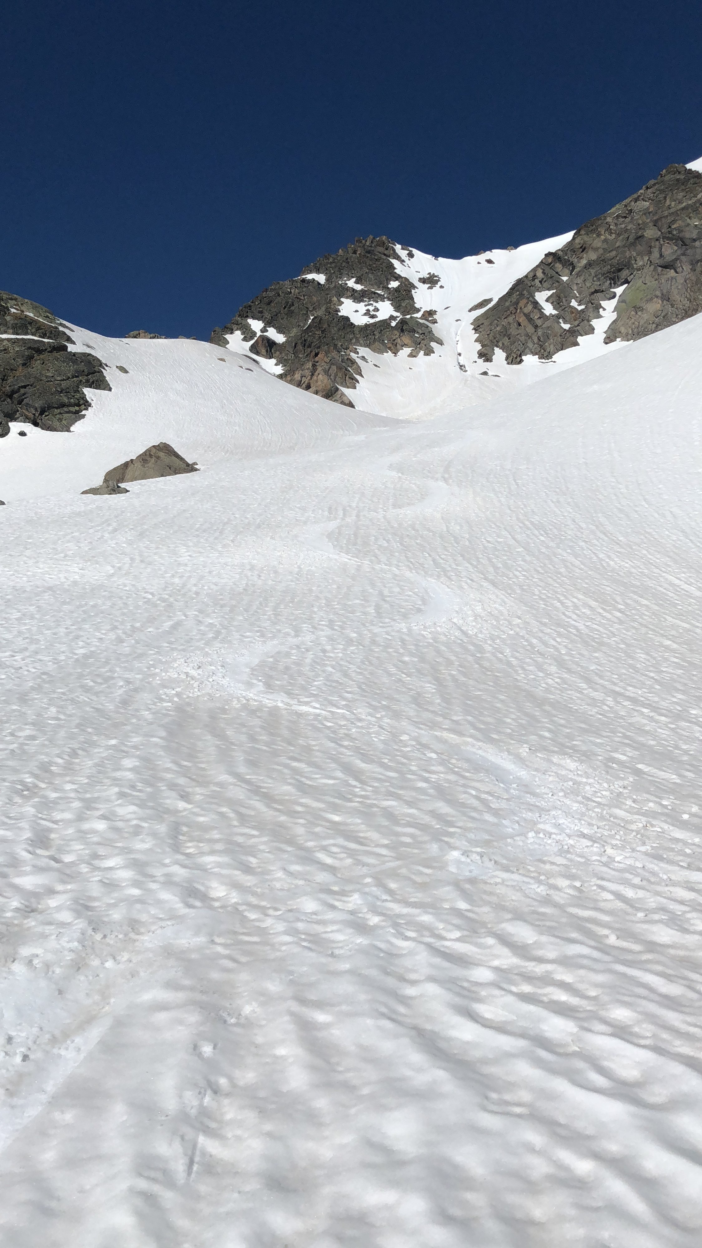 Die ersten 150 hm Ski geschultert dann durchgehend Schnee bis zum Skidepot. 3/4 des Gipfelaufbaus sind schneefrei. Oben weicher Schnee. Kletterstellen natürlich trocken. War um 8:30 am Gipfel und fuhr dann direkt südseitig ab. Oben guter Sommerschnee. Weiter unten stört das Fahrvergnügen die großen Dellen in der Schneeoberfläche.