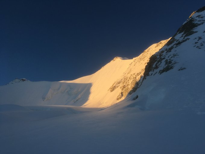 Die Wand bleibt gut. Am Wochenende dürfte es aber einige Aspiranten geben, und jeder Skifahrer nimmt natürlich einiges an Schnee mit runter. Zustieg zum Gletscher wird immer länger.