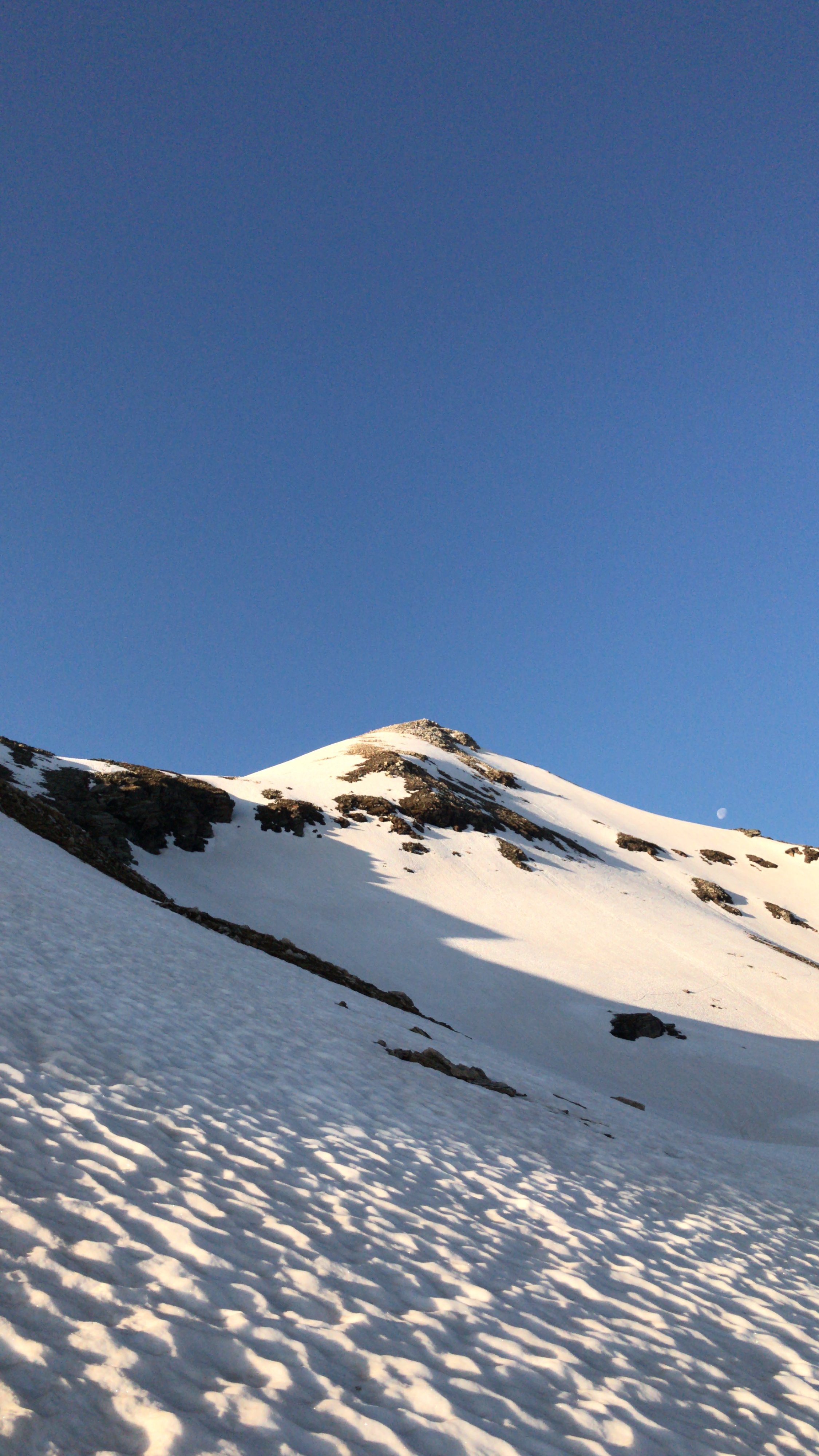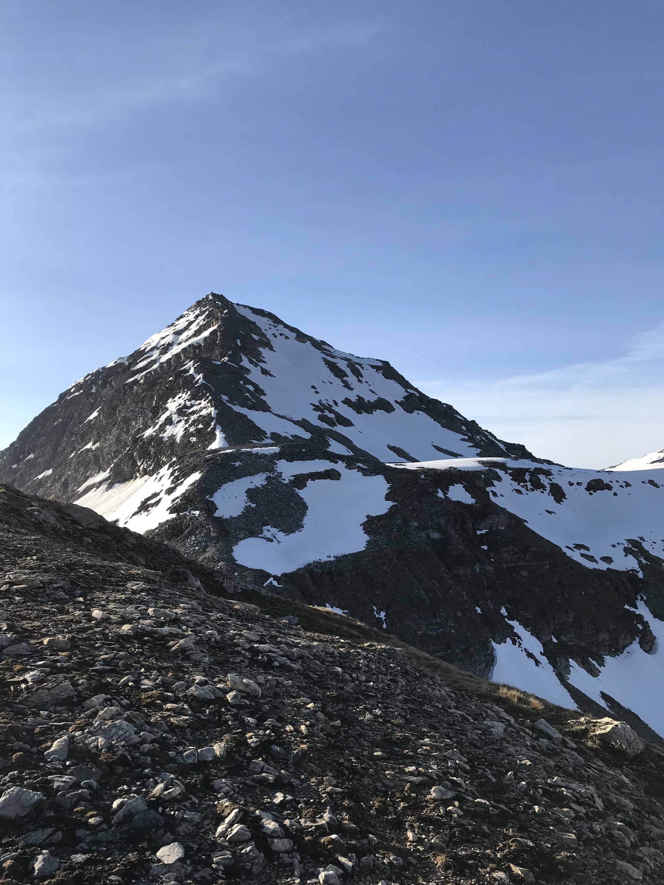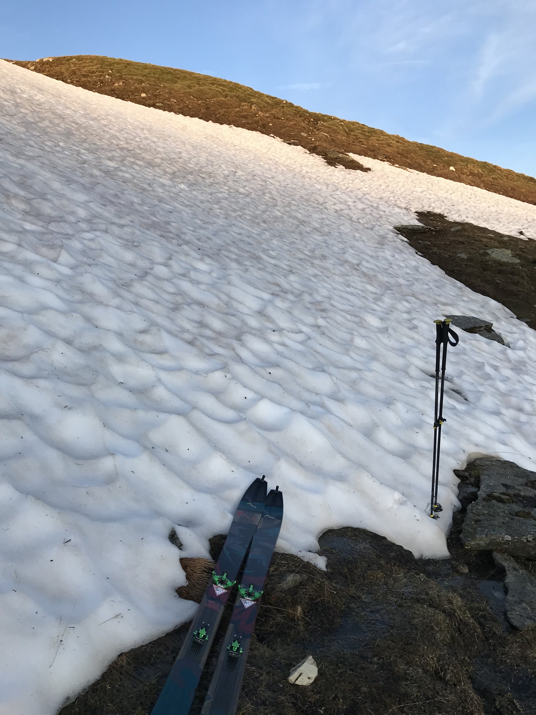 Es war trotzdem toll, an diesem schönen Tag, ganz alleine über das Wyssgrätli aufs Fanellhorn zu steigen. Die wenigen Abfahrten im Wellblech-Sulz waren es wert.