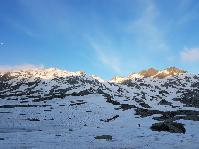 Die andere Seite vom Gotthardpass schon wenig Schnee, Aufstieg zum Monte Prosa nicht mehr lohnend.