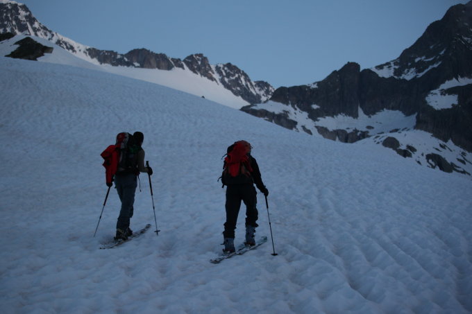 Die ersten 20-30 min müssen die Skis getragen werden. Dann bis auf kurze Tragestelle bei Älpetli durchgehend auf nicht ganz durchgefrorenem Schnee ohne Unterbrüche gut zu gehen bis zum Skidepot. Wir waren wohl die einzig, die den Gipfelanstieg nicht gewagt haben, Fels sah trocken aus und die Spur unterhalb des Gipfels schien gut zu sein. Abfahrt ab 9:30 Uhr bis auf kurzes Stück mit Durchbrechen sehr gut .