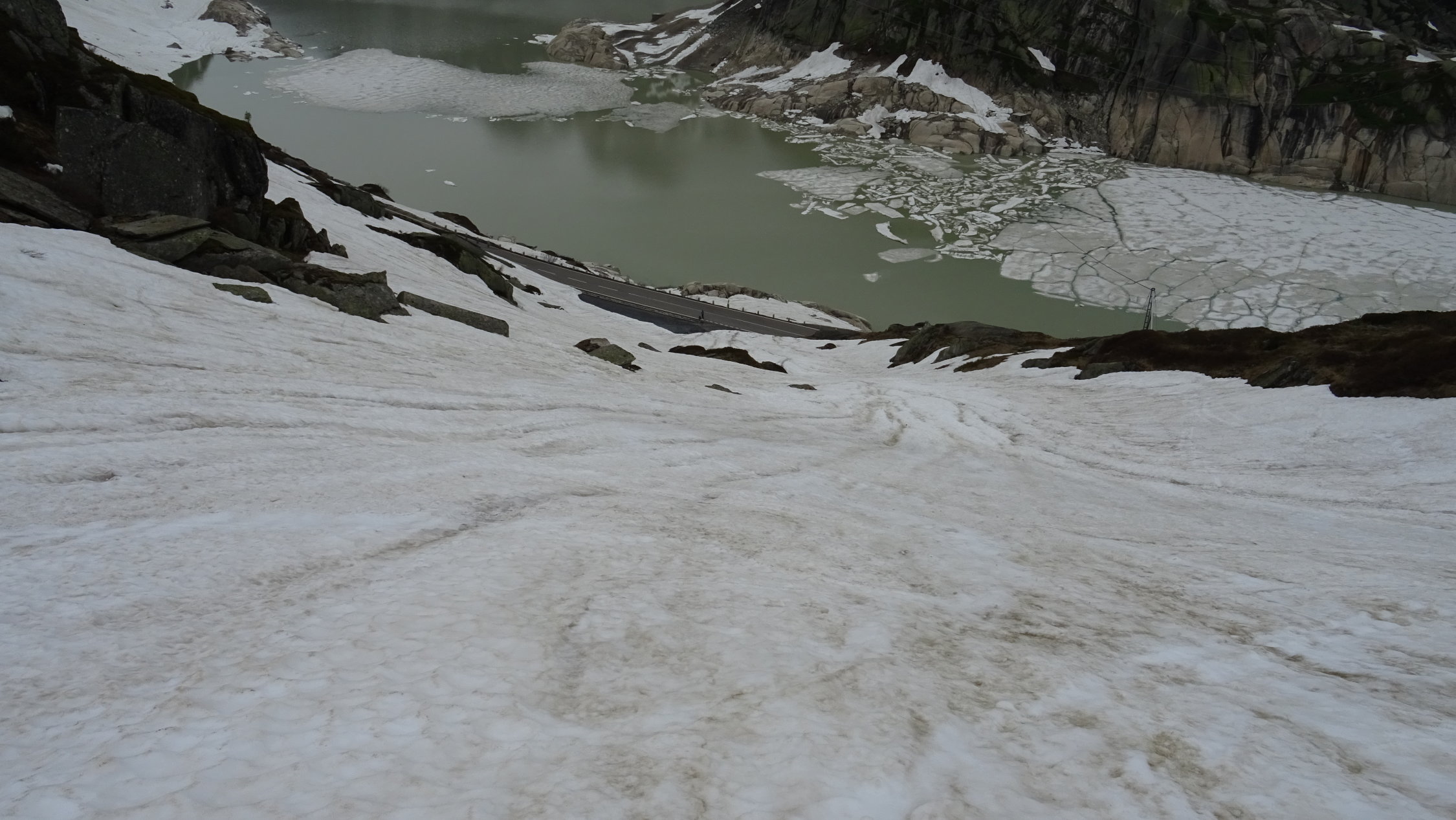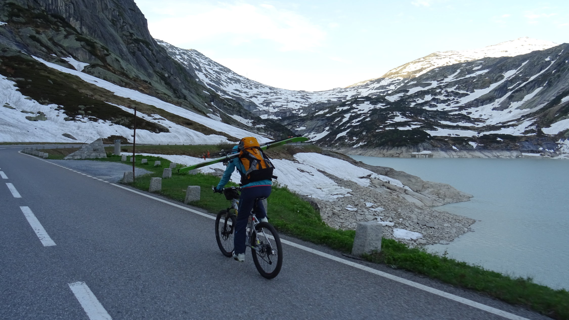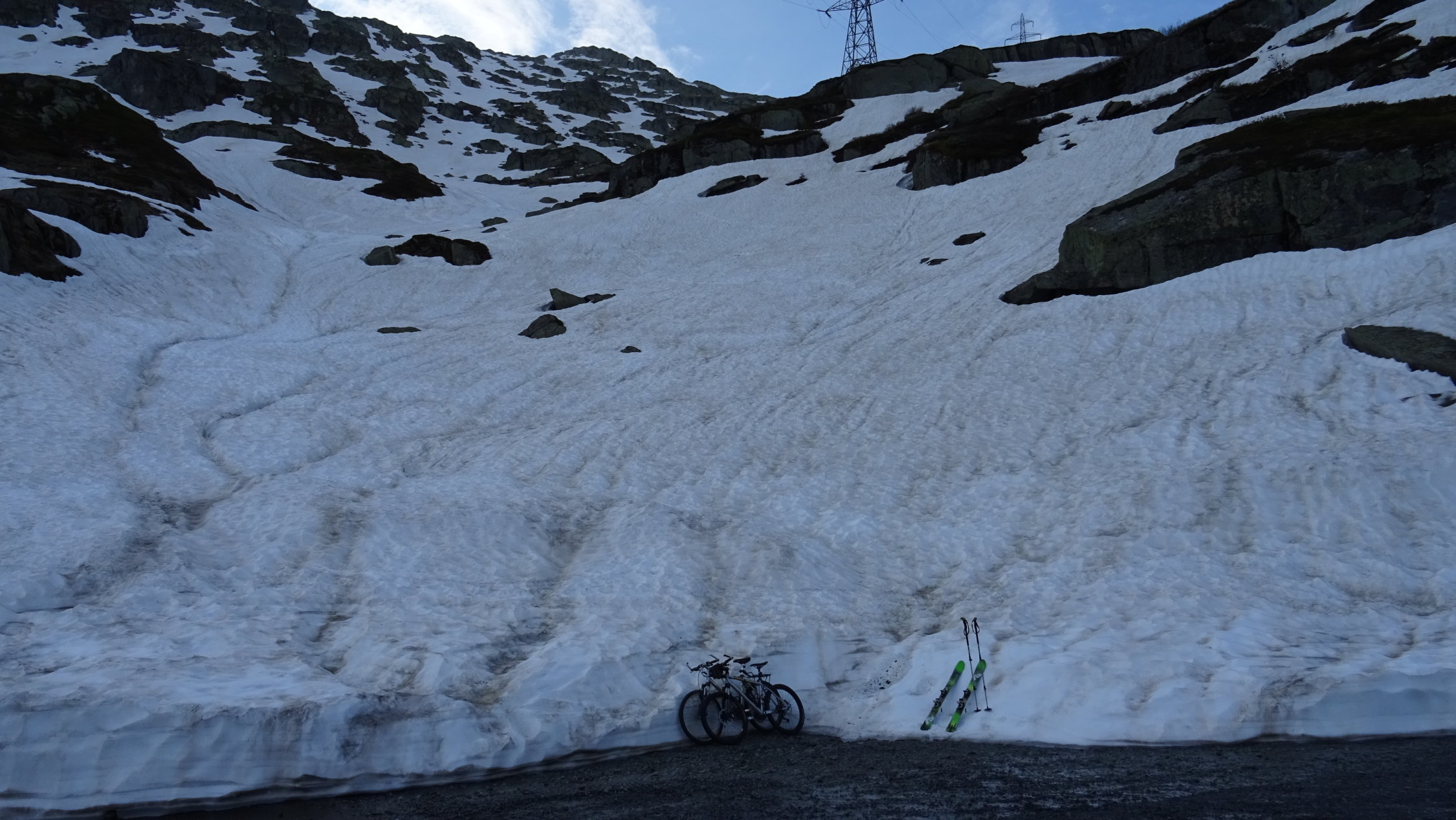 Wir sind heute wieder mit dem Velo vom Räterichbodenstausee aus 4km und 150Hm bis zum Grimselsee hinauf gefahren und haben 300m nach der Staumauer die Ski angeschnallt und haben in den steilen Hängen die Strasse abgekürzt und