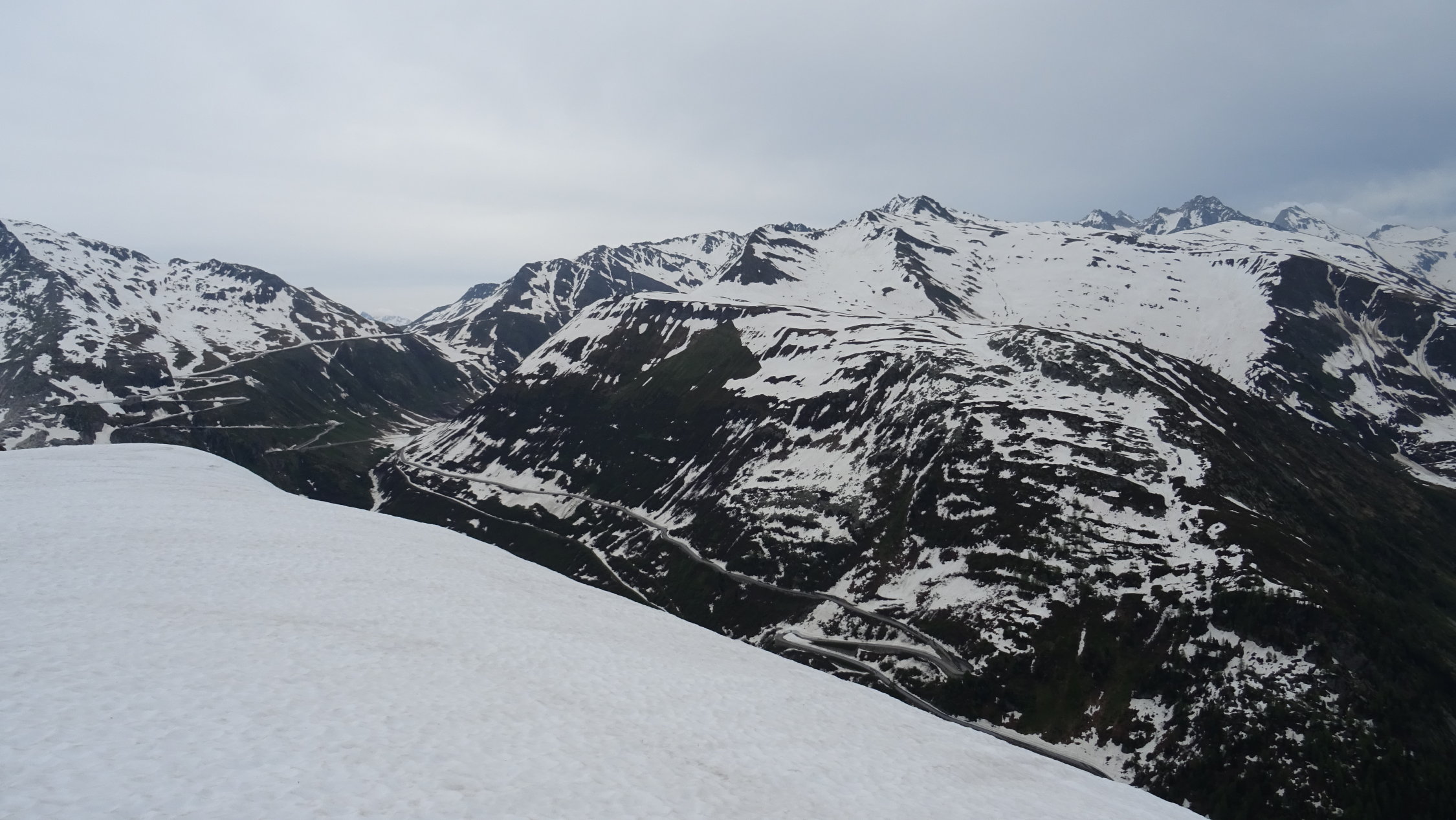 Eigentlich ist die Pssstrasse geräumt und Schneefrei aber leider noch geschlossen (Barriere mit Schloss)