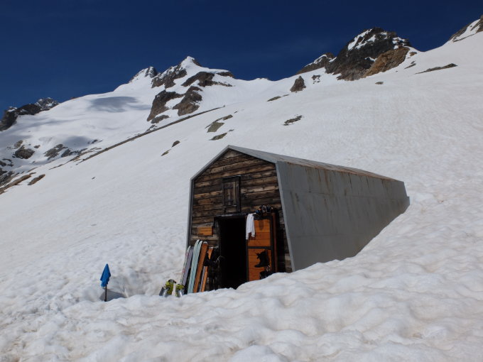 Auf der beschriebener Route Schnee ab 2050m, unterbrochen bei P. 2144m und noch auf kurzen Stellen bei P.2513m. In der Nacht hat es geregnet und etwas geschneit, daher Start erst um 5:50. Gletscher gut eingeschneit, Seil blieb im Rucksack. Der Steilhang auf 3480m war am Morgen (8:15) hart und unangenehm trotz den Harscheisen, daher haben wir die Skis abgeschnallt. Schlussaufstieg auch zu Fuss im trittsicheren Schnee. Grat gut passierbar.