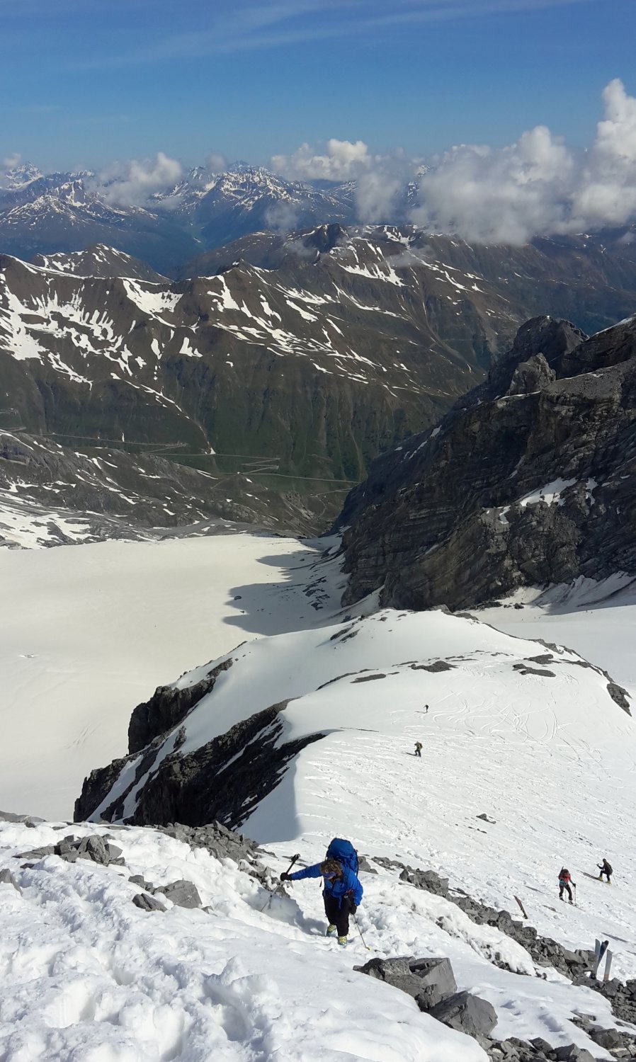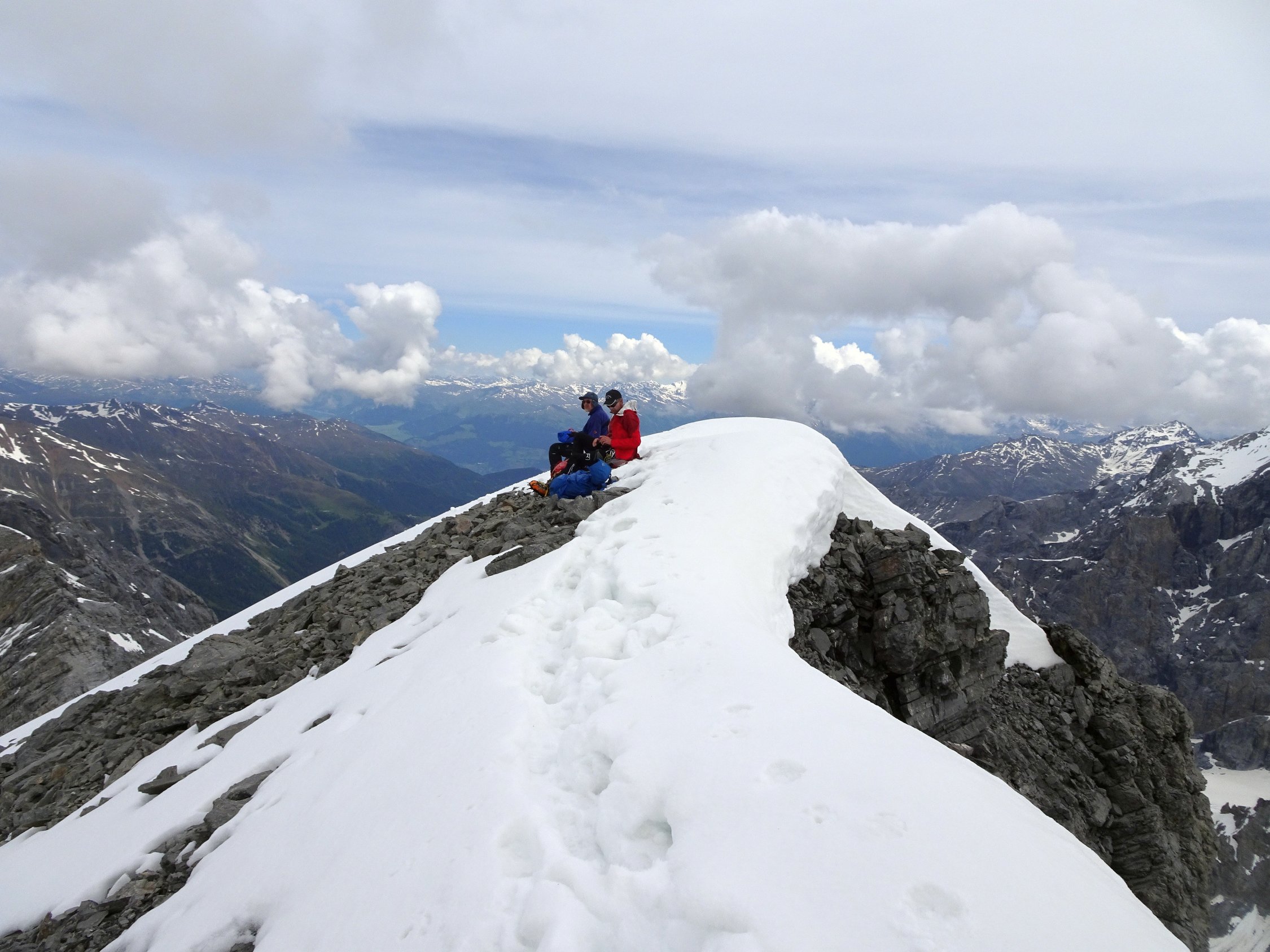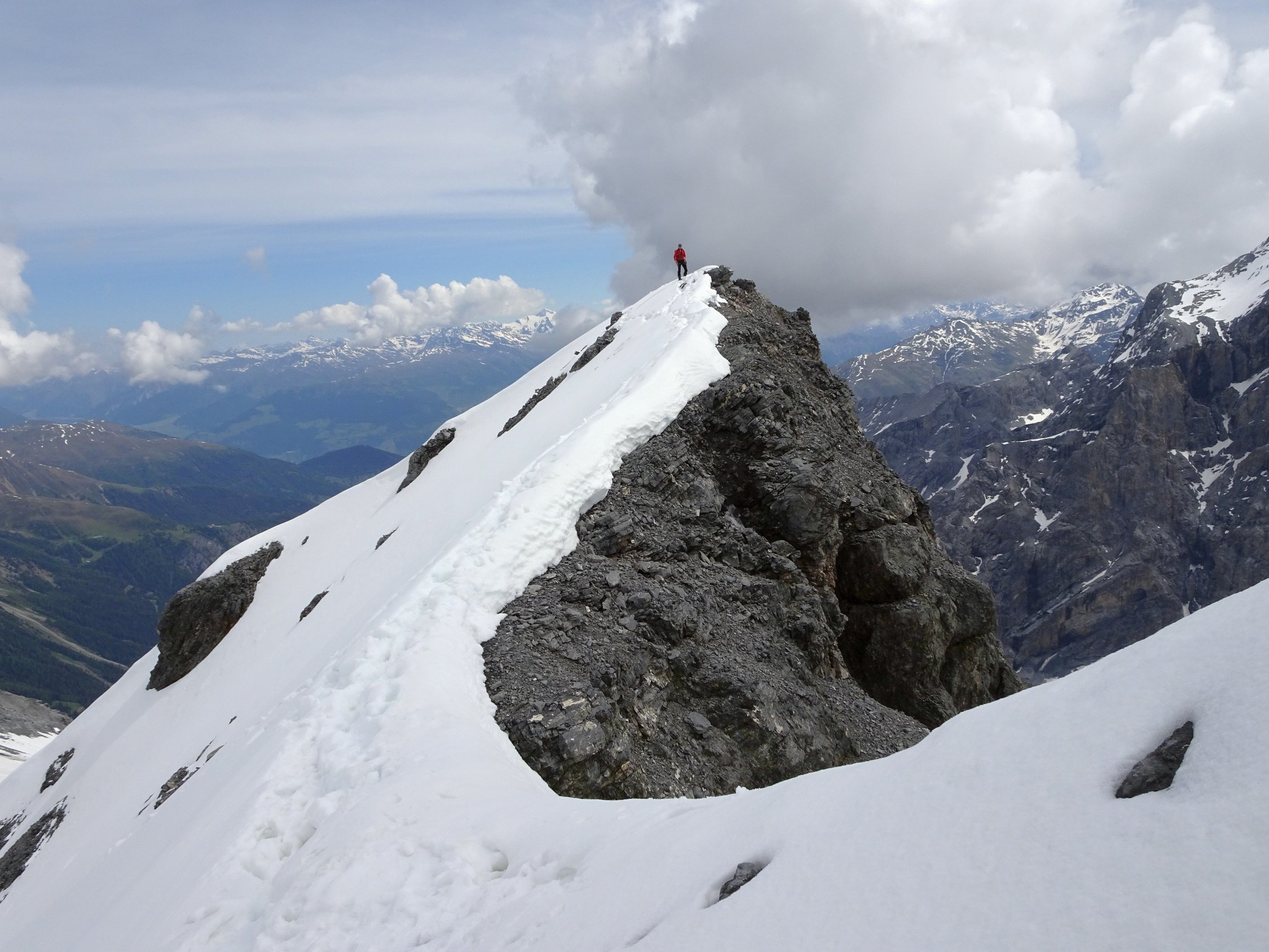 Wetter: an beiden Tagen nach sonnigem Beginn schon morgens Quellwolken, jedoch bis Tourende trocken mit guter Sicht. Ausrüstung: Für die Grataufstiege je nach Verhältnissen Pickel/Steigeisen hilfreich, Gurt und Seil hatten wir am 2. Tag dabei, sollte aber, solange man auf der Route bleibt, nicht notwendig sein. Die wenigen großen Spalten sind gut erkennbar und kleinere gut eingeschneit.