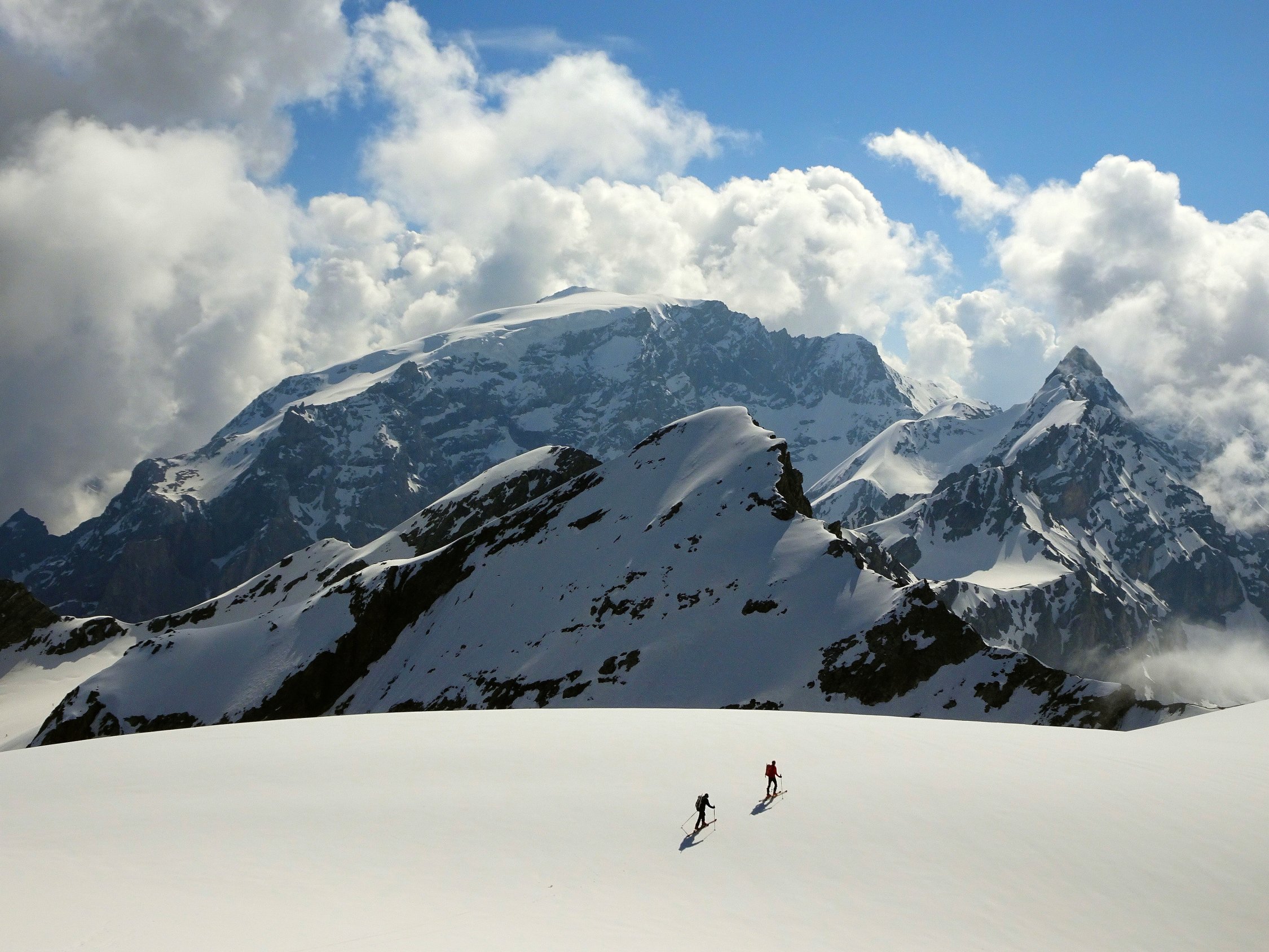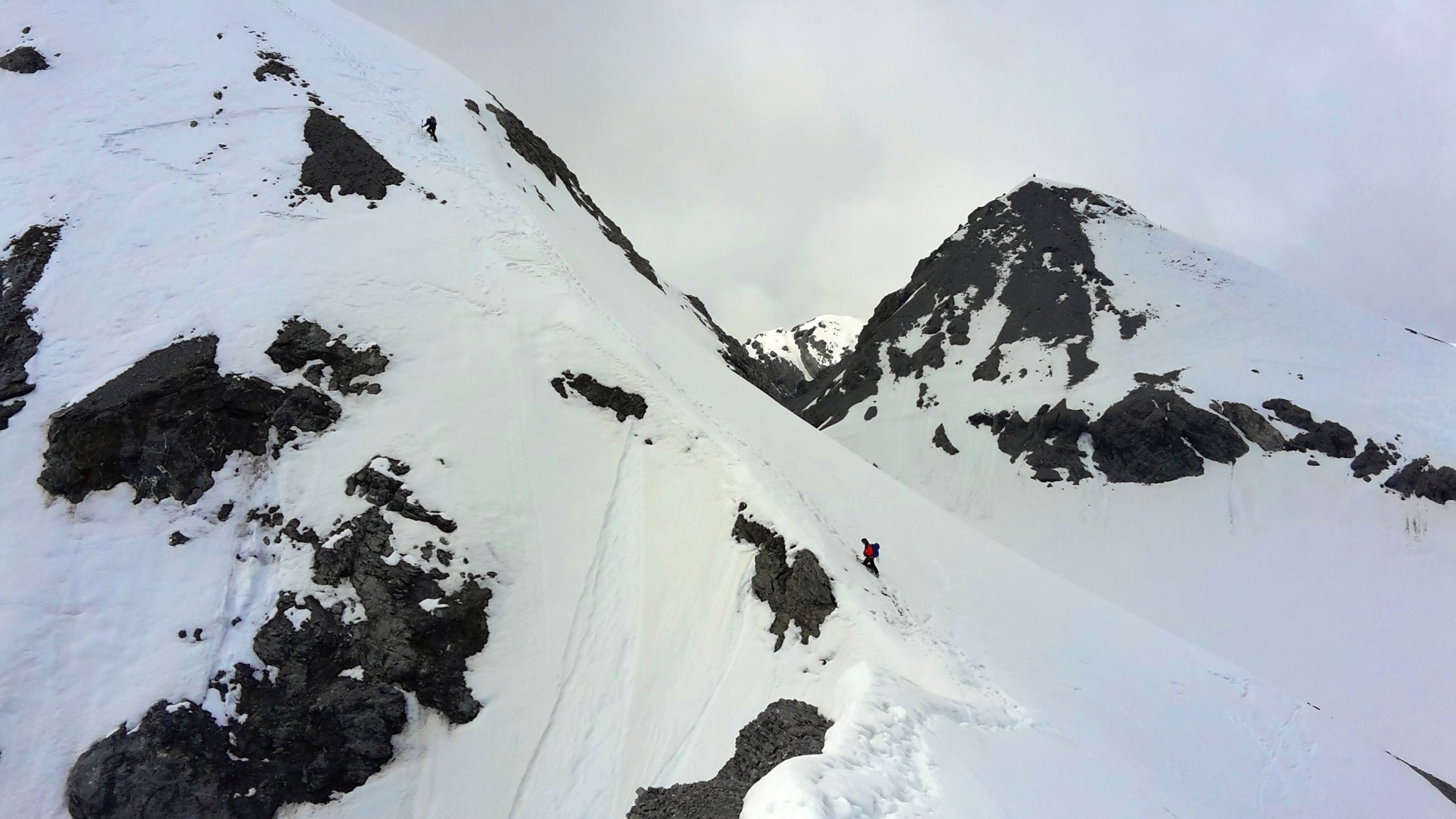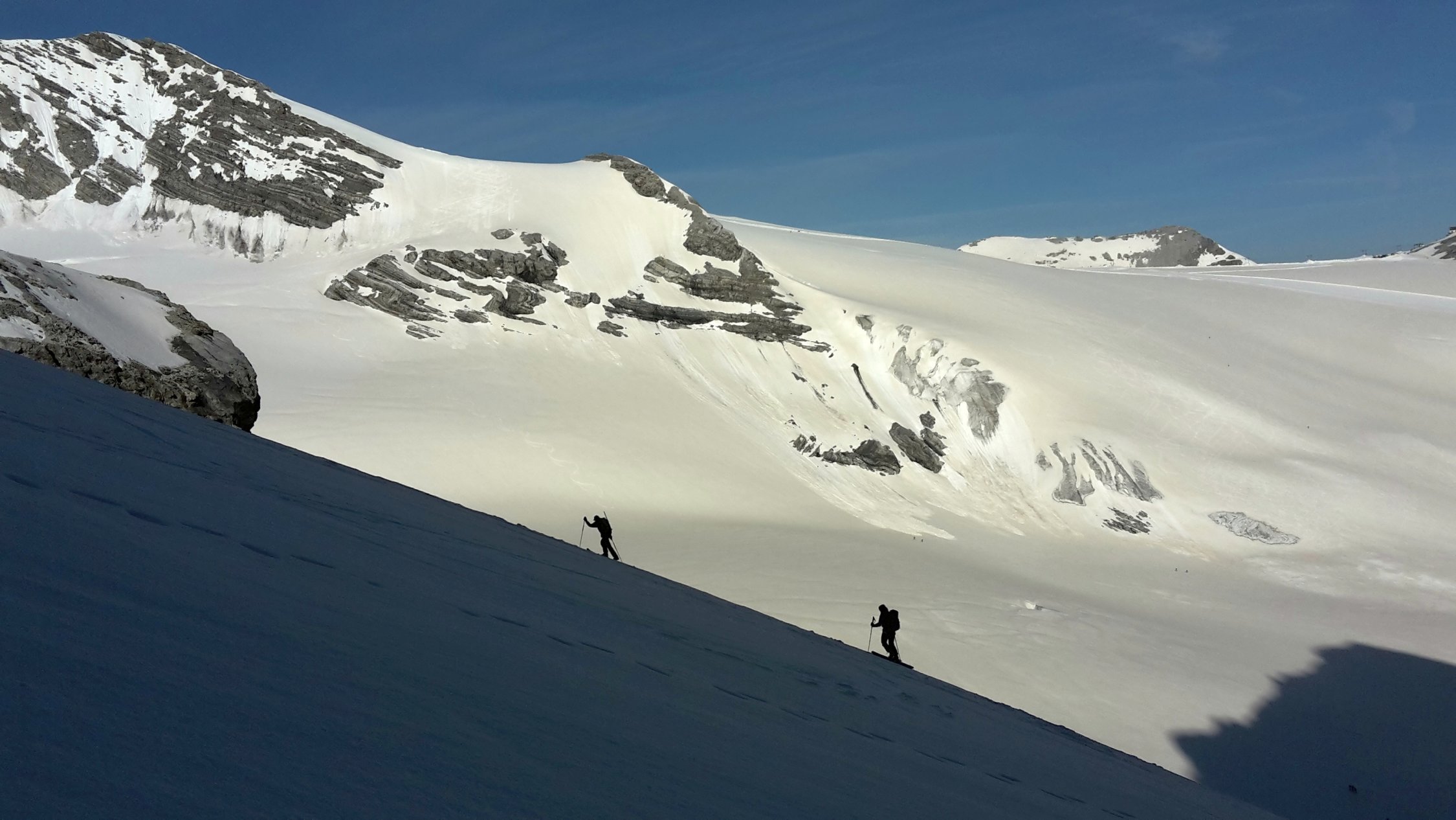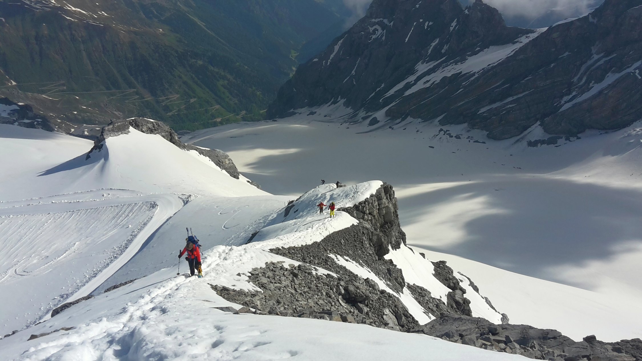 Wetter: an beiden Tagen nach sonnigem Beginn schon morgens Quellwolken, jedoch bis Tourende trocken mit guter Sicht. Ausrüstung: Für die Grataufstiege je nach Verhältnissen Pickel/Steigeisen hilfreich, Gurt und Seil hatten wir am 2. Tag dabei, sollte aber, solange man auf der Route bleibt, nicht notwendig sein. Die wenigen großen Spalten sind gut erkennbar und kleinere gut eingeschneit.