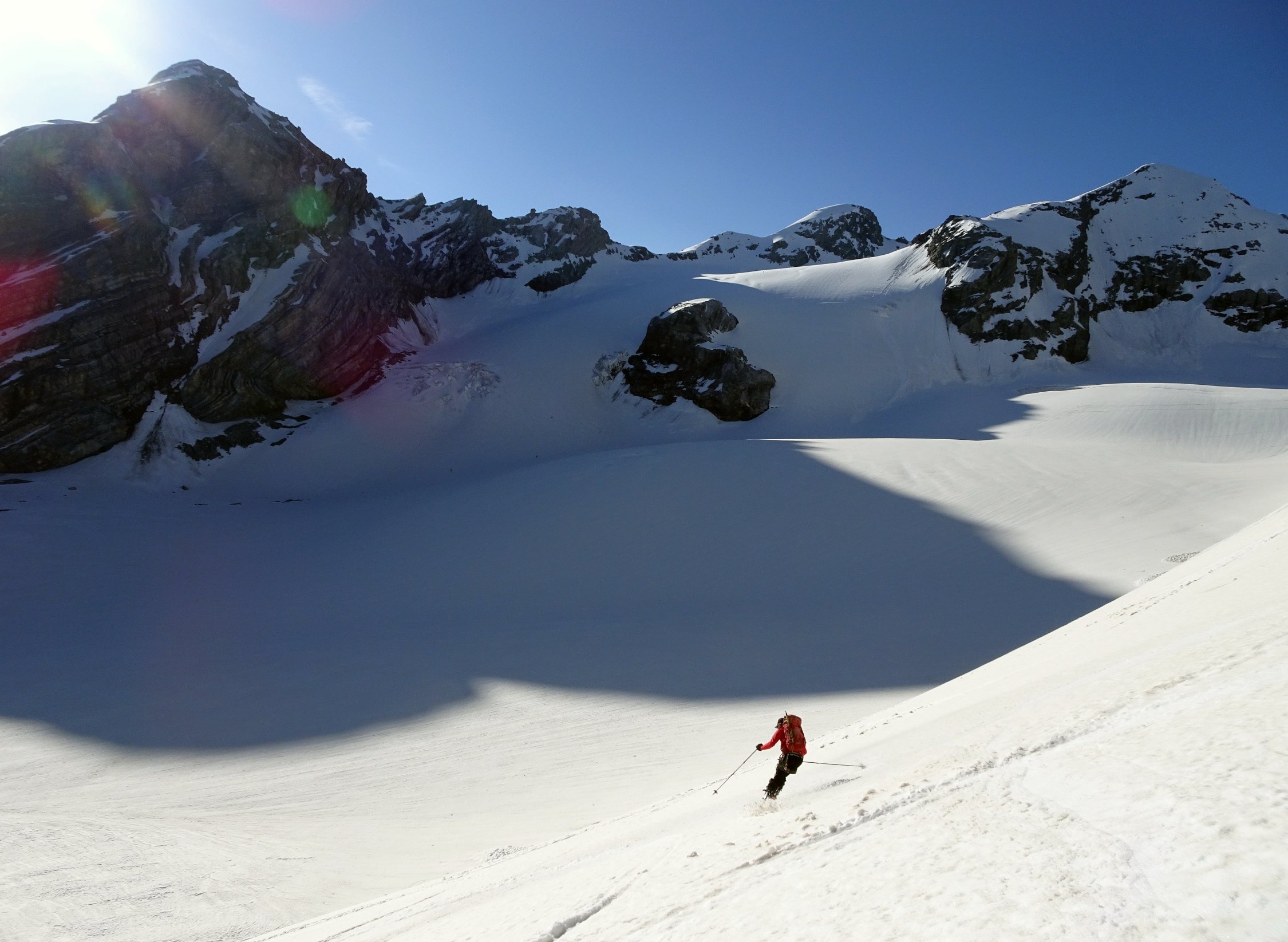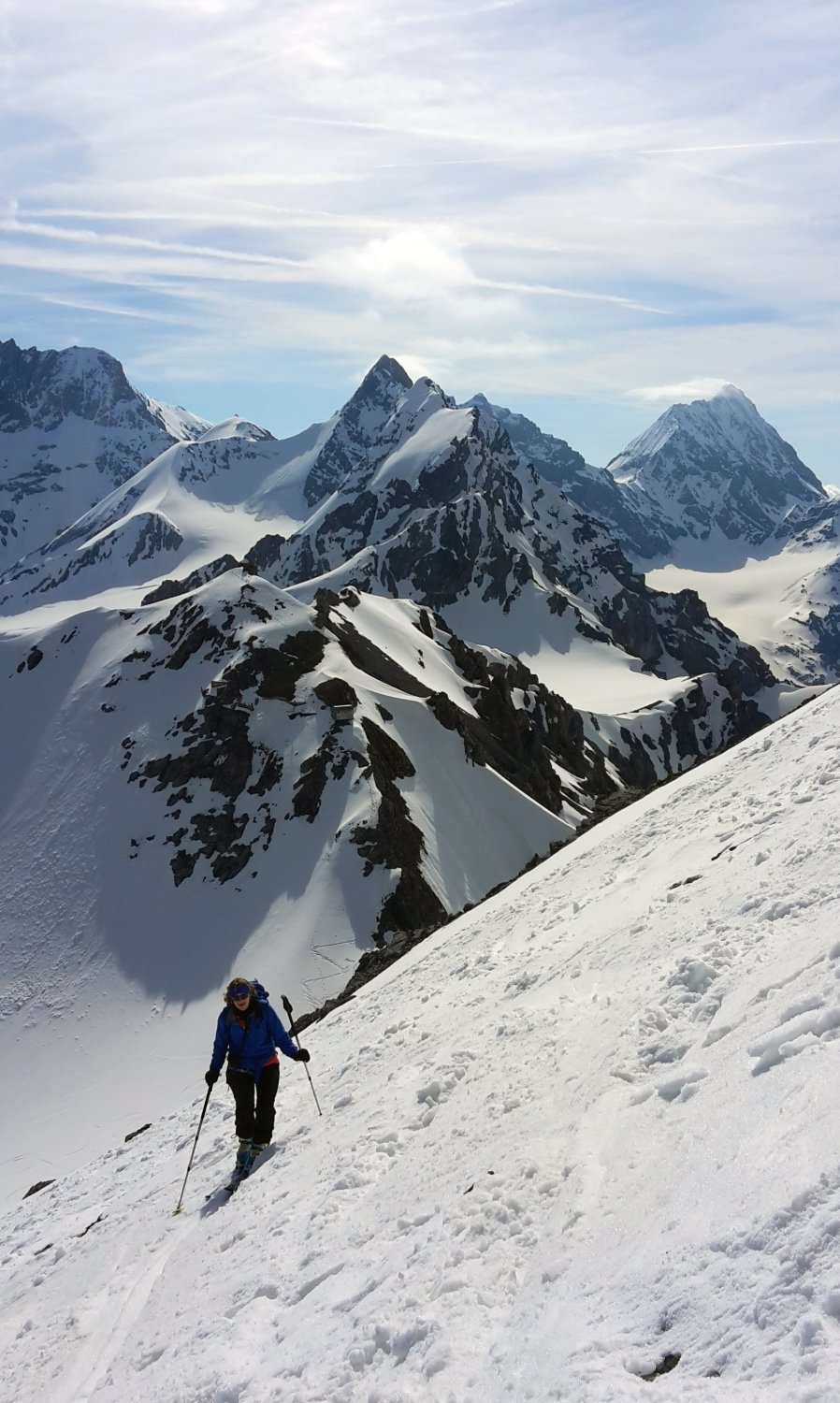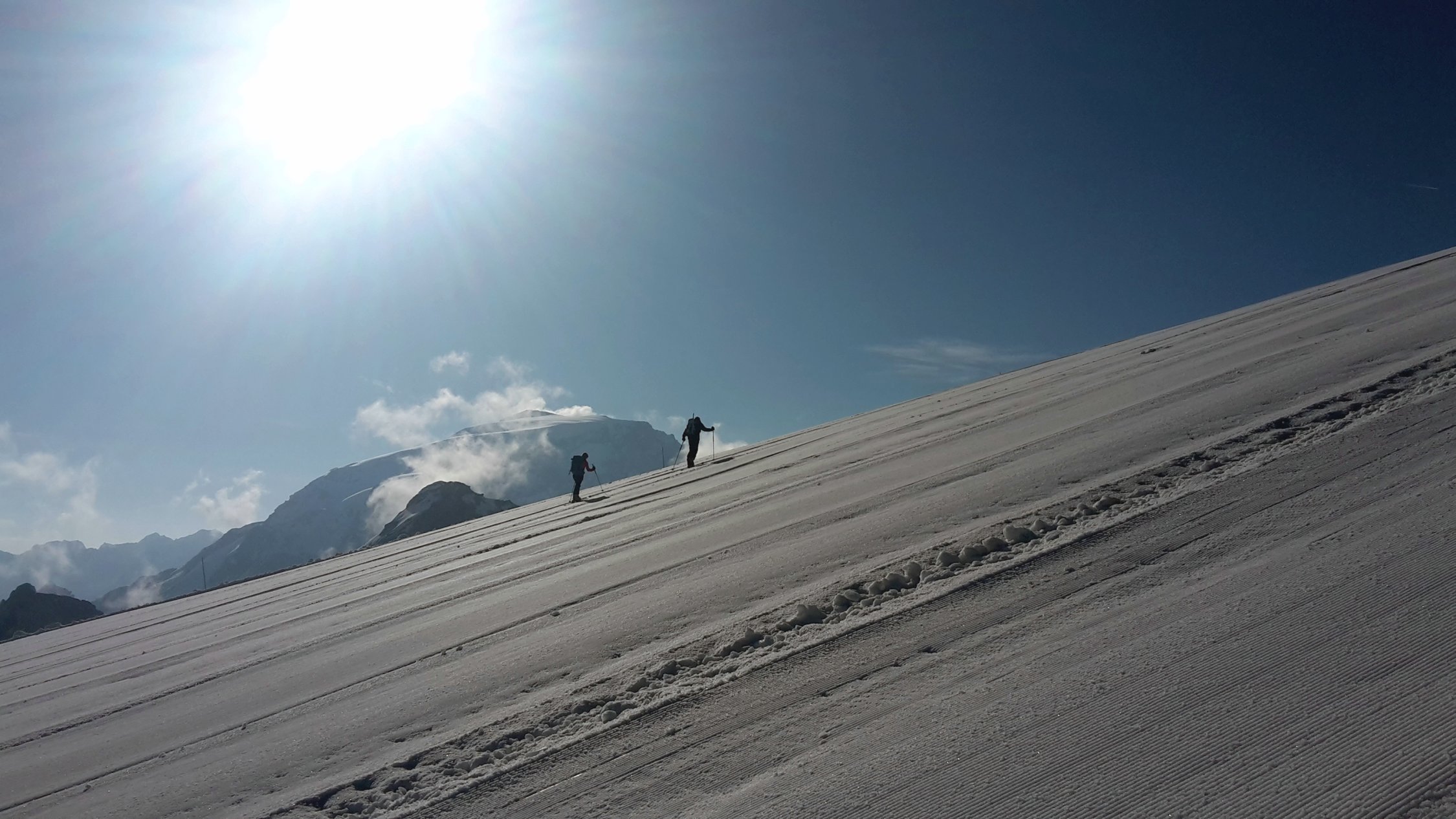 Tuckettspitze u. Madatschspitze (So.): bessere Abstrahlung als tags zuvor und morgens durchgefroren. Harscheisen v. a. für den steilen Aufstieg Richtung Tuckettjoch empfehlenswert. Im Gipfelhang der Tuckettspitze oben viele Steine, erfordert defensive Fahrweise, nach unten hin besser. Nordgrat zur Madatschspitze Trittschnee und gute Spur, Abfahrt über den Madatschferner (gg. Mittag) perfekter Firn. Nach 200 hm Gegenanstieg zum Rif. Livrio auf sulziger Piste zurück zum Joch.