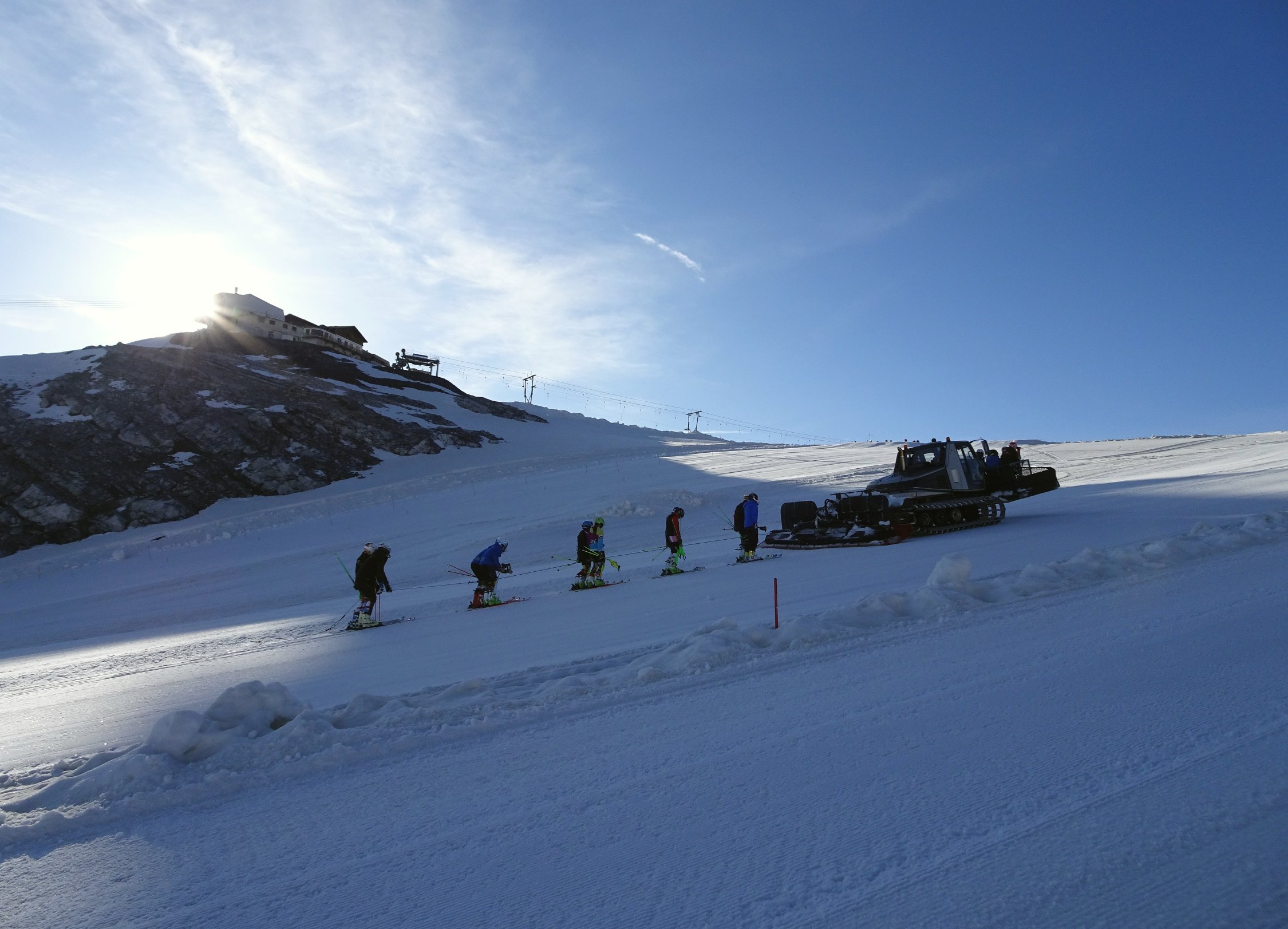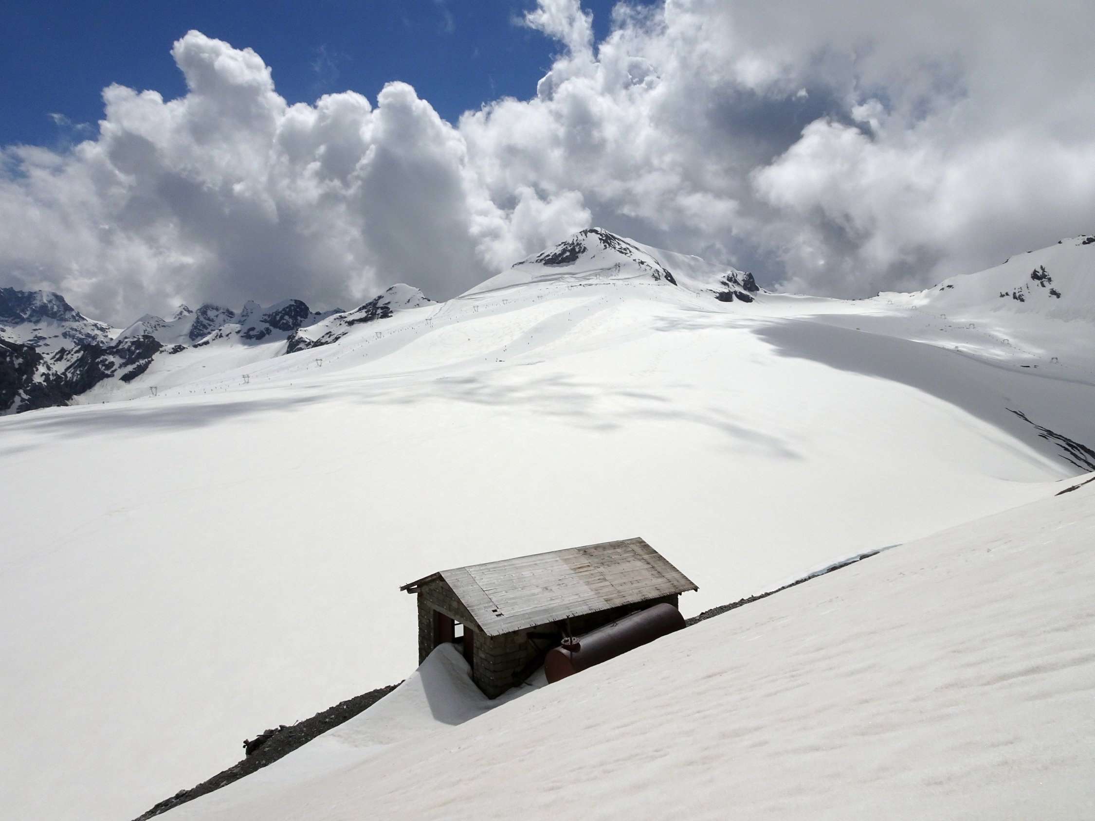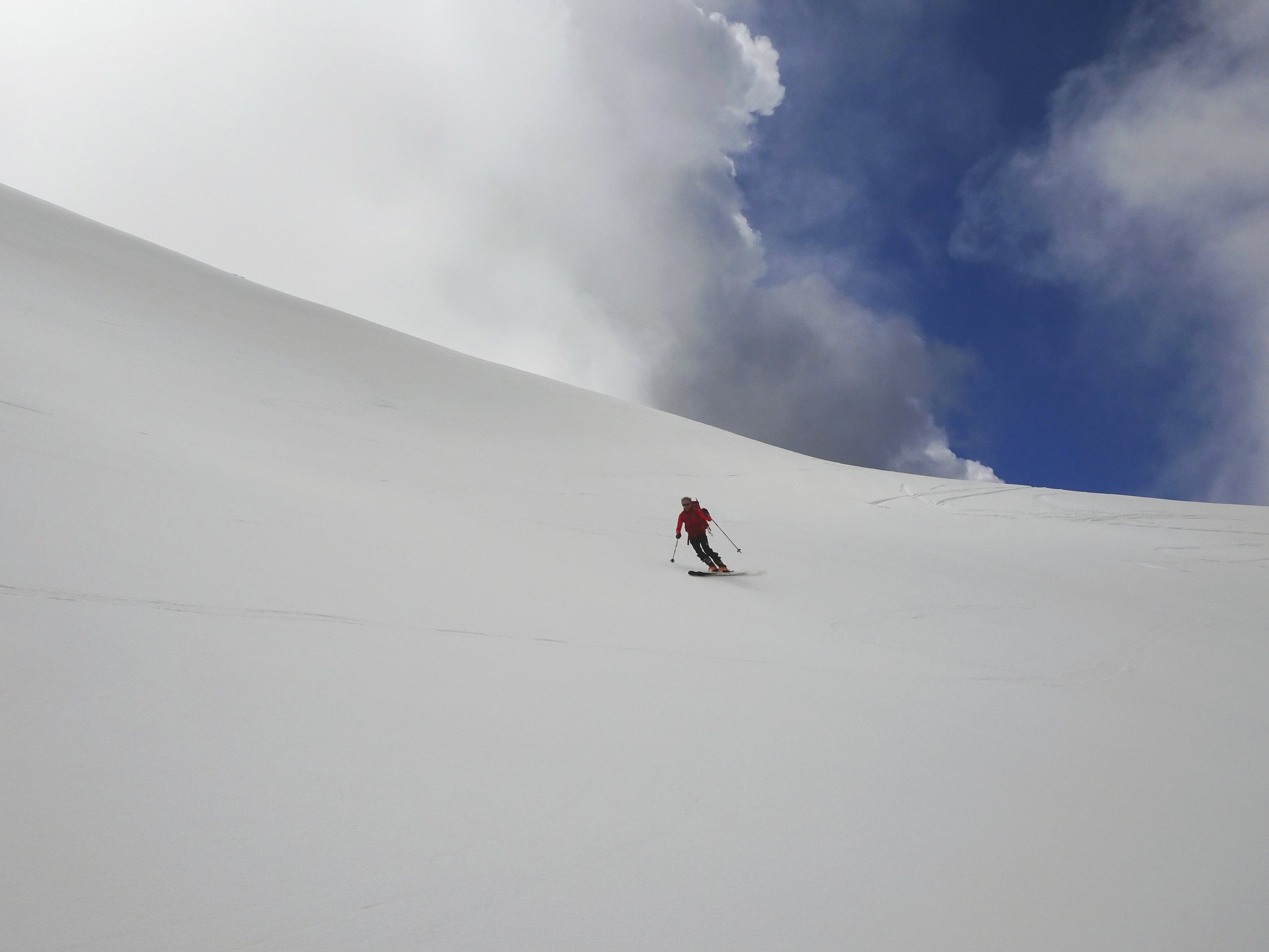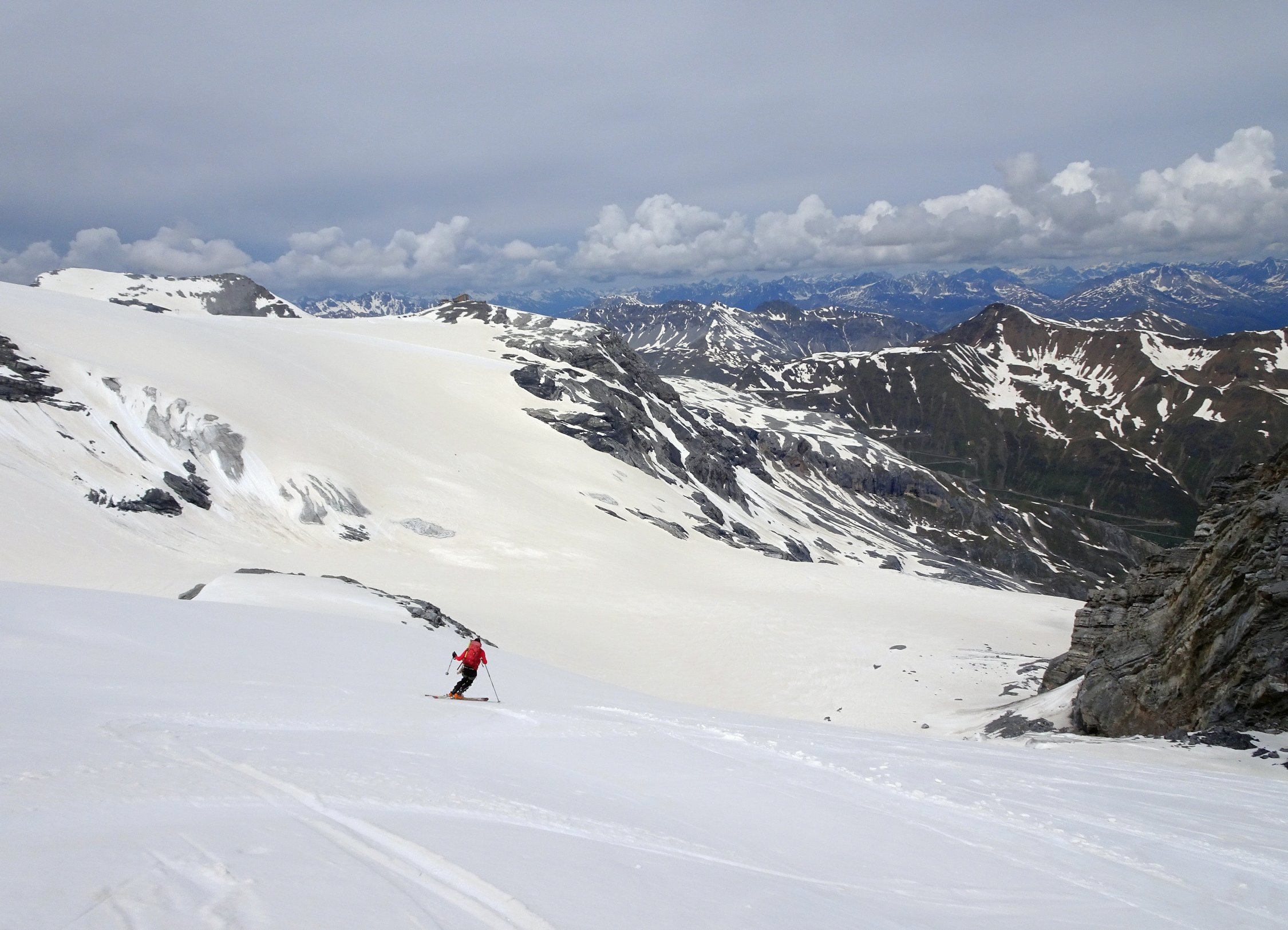 Für die Ausgangshöhe von fast 2.800 m Schneelage am Pass nicht mehr allzu üppig, durch den Pistenzustieg im Sommerskigebiet aber ab Parkplatz bestens machbar. Etwas höher dann auch im Gelände noch genug Schnee (nordseitig).