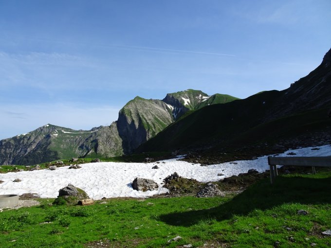 Wege praktisch durchgehend trocken und gut zu begehen. Oberhalb der Wildenfeldhütte teils noch Schneefelder, die aber nicht abschüssig sind und somit nicht stören. Ein grösseres Schneefeld ist noch unterhalb des Himmeleck-Gipfels, der etwas Trittsicherheit verlangt; könnte aber etwas südlich umgangen werden. Aufstieg und Übergang zum Schneck Hauptgipfel in festem, solidem Fels.