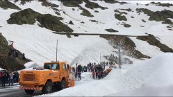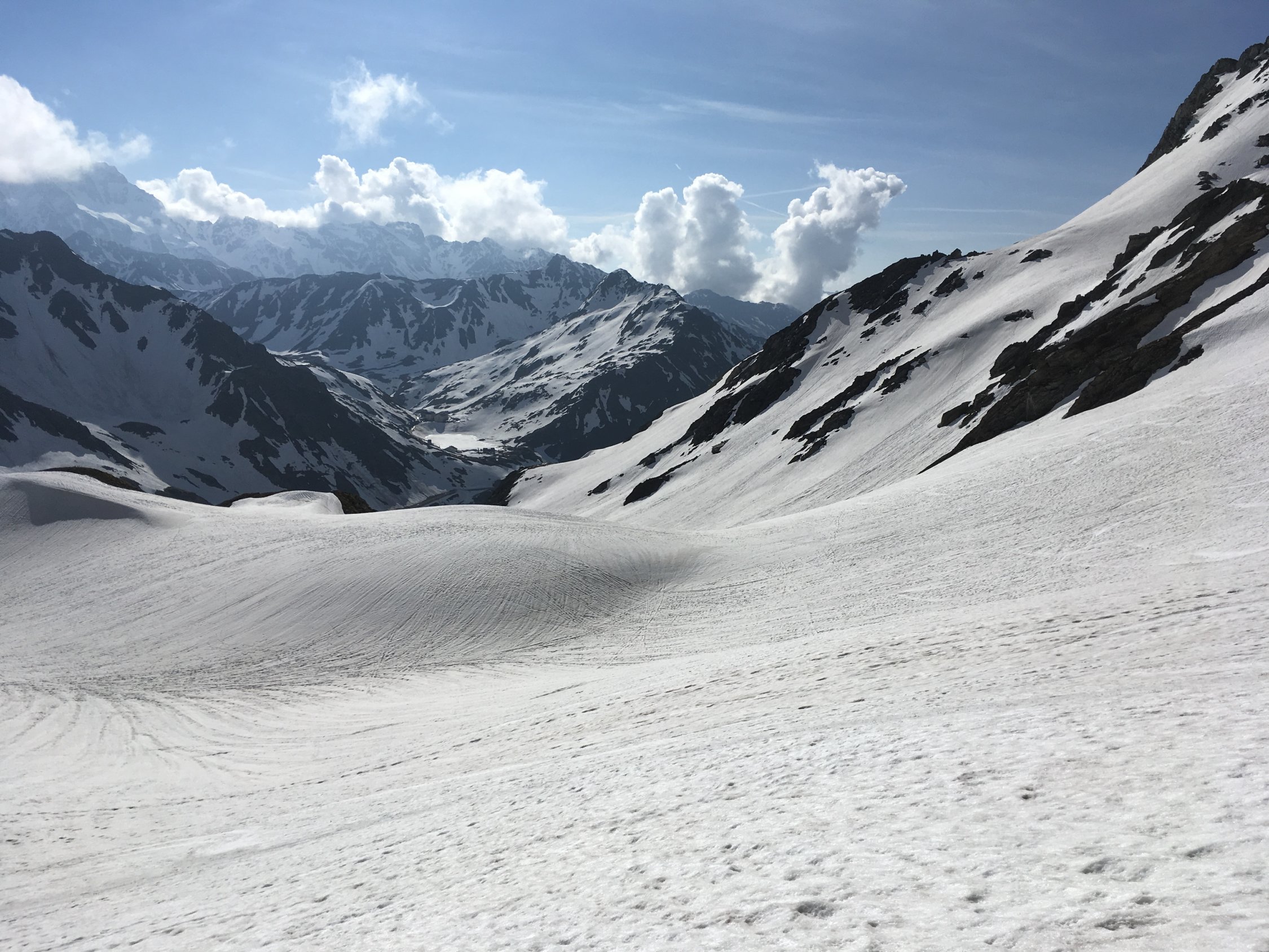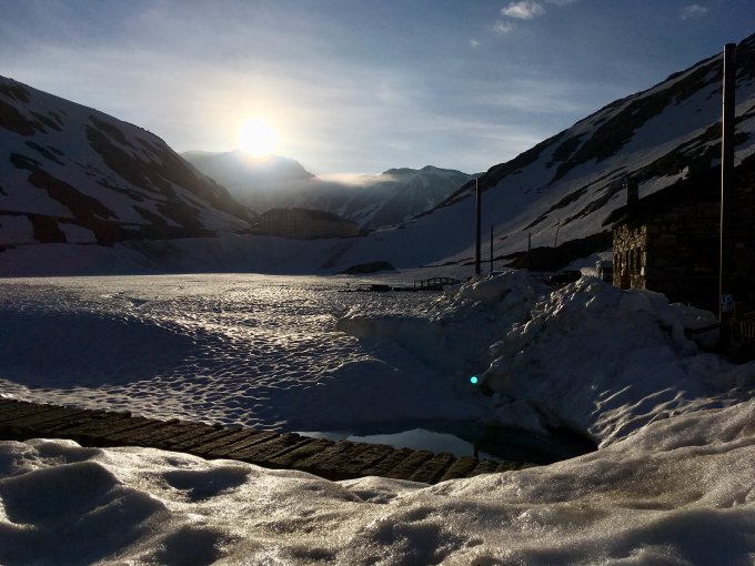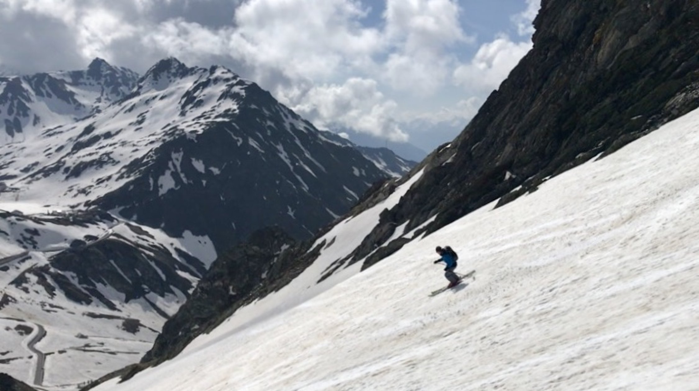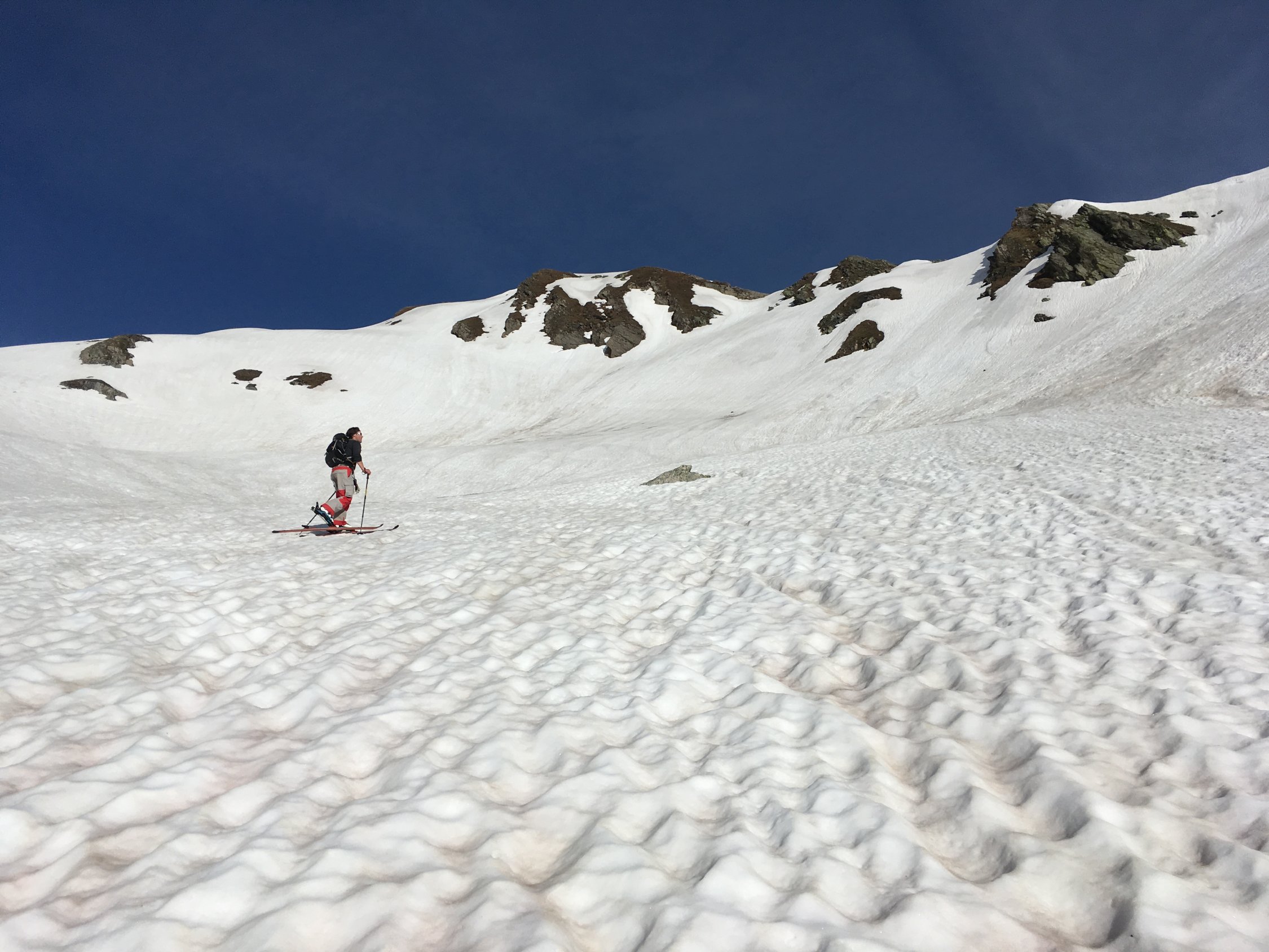 Noch genug Schnee ab der Passstrasse. Bis 2.450 M.ü.m Sommerschnee mit viele Kanälen und Löchern. Danach viel besser und morgens früh gut zum fahren.