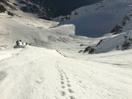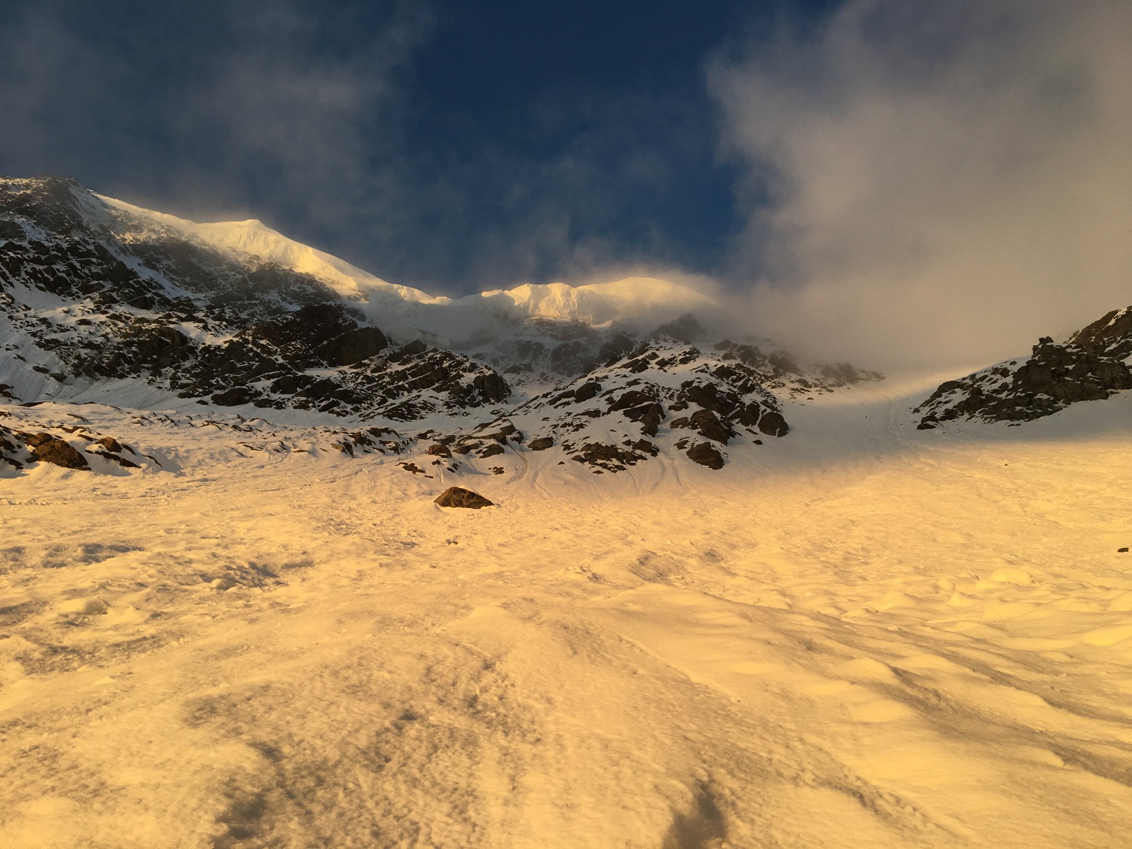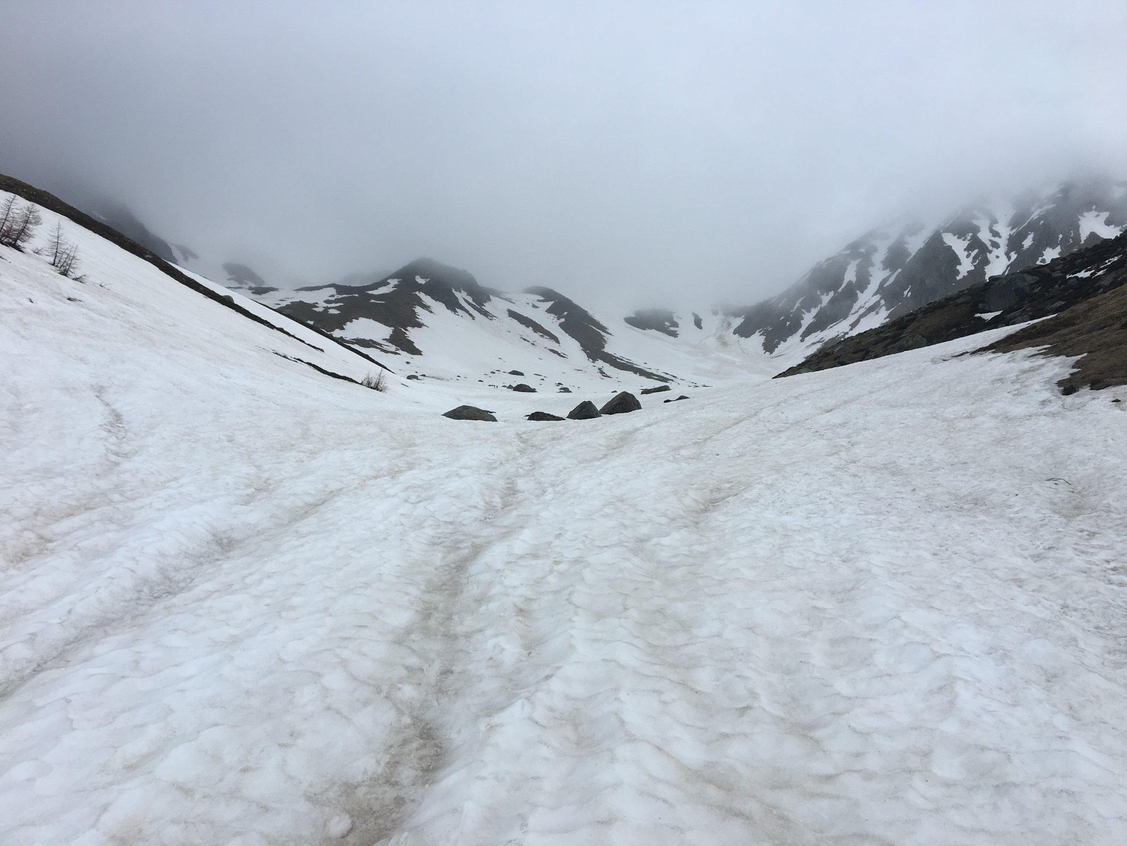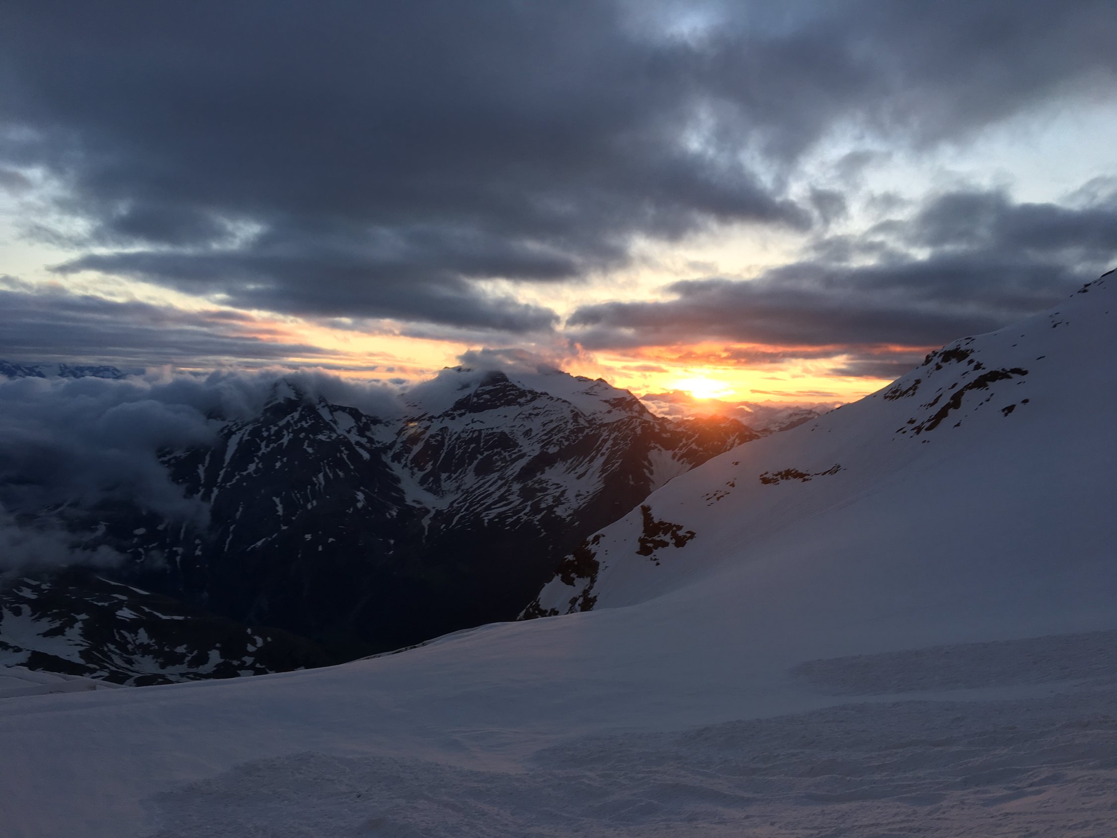 Zustieg zen Biwak am Vorabend, 17:00 Simplon-Egga, 20:30 Biwak. Ab 1900 m durchgängige Schneedecke, immer tragend, aufgrund der Nachmittagstemperaturen aber nass & rutschig, was das Vorankommen recht mühsam machte. Anfangs letzter schwacher Regen, im Zustiegsverlauf immer weiteres Aufklaren. Letzte 100 Hm zum Biwak Ski aufgebunden.