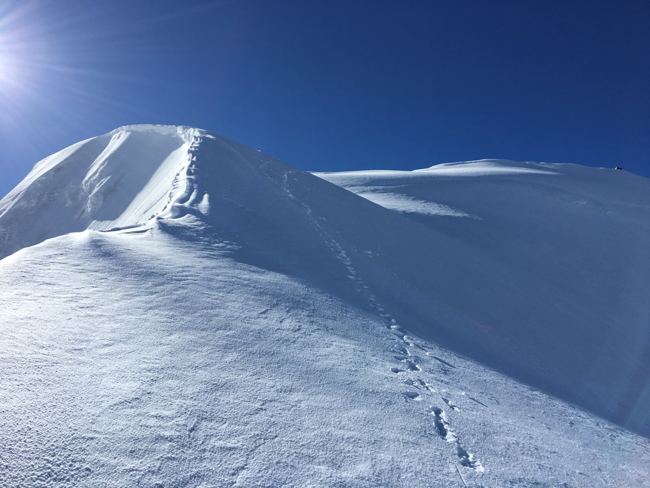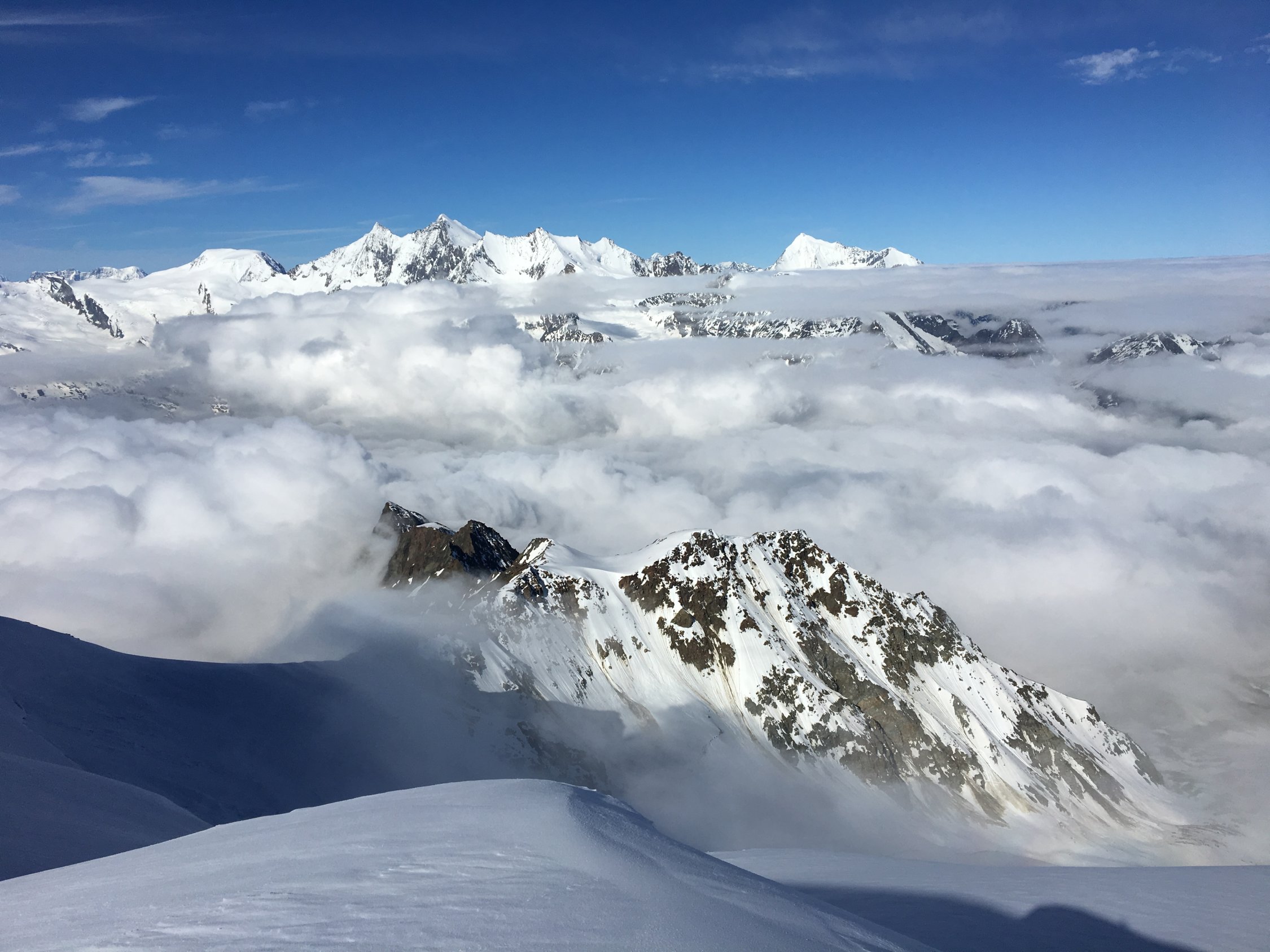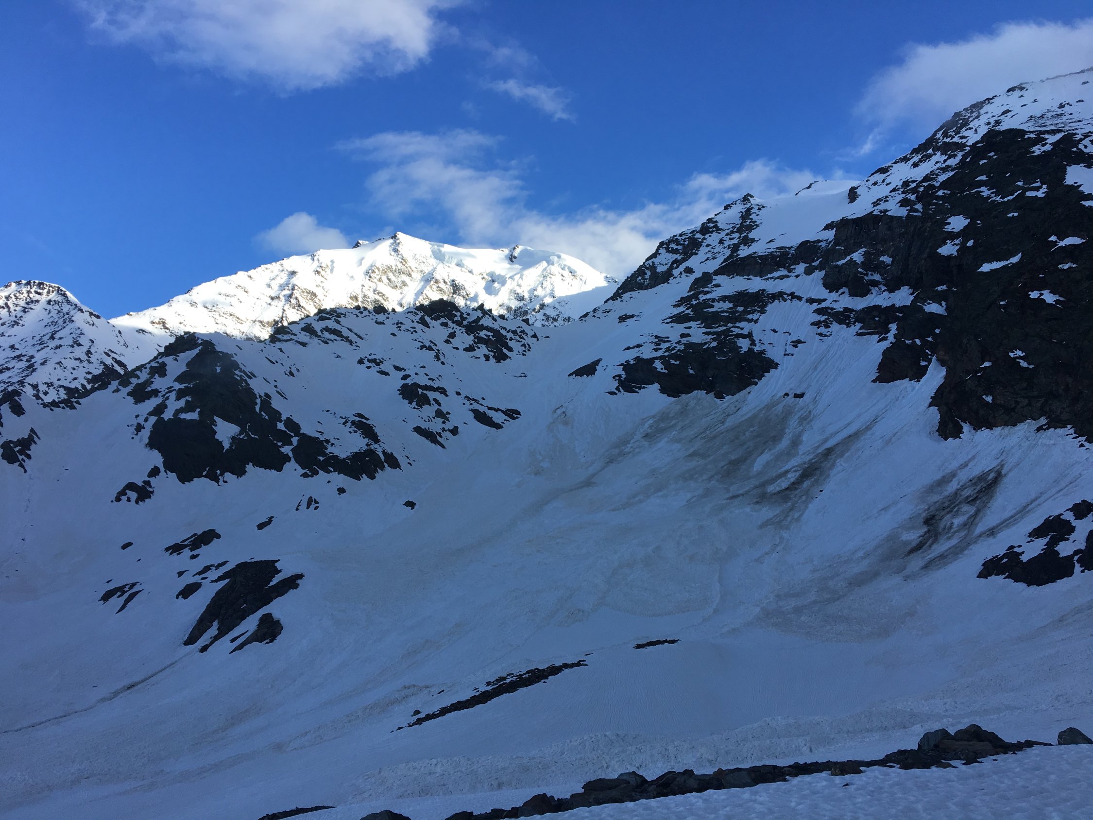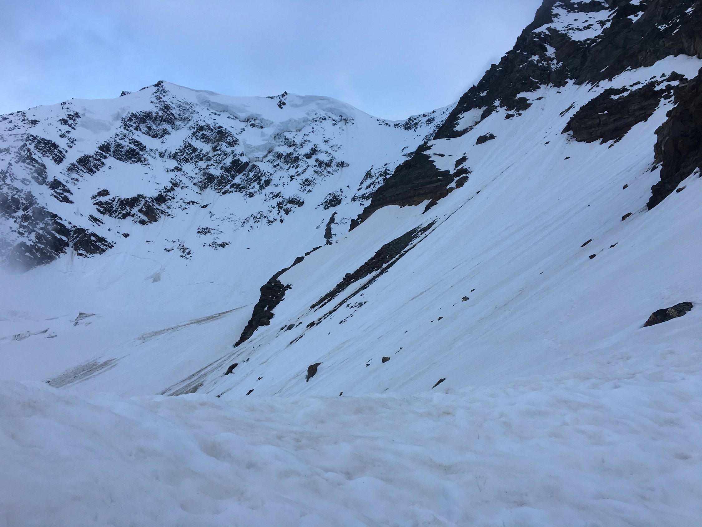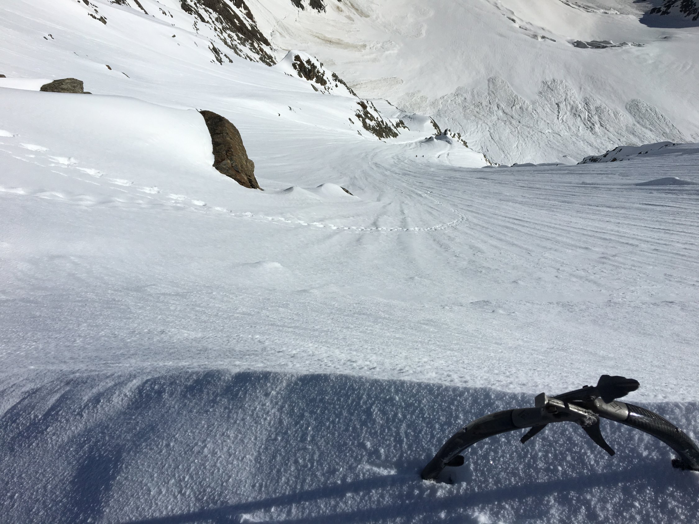 Zen Biwak mit drei Personen gemütlich belegt. Samstag Start 4:30 bei leichten Plusgraden(!). Rossbodengletscher alle Spalten gedeckt, Überquerung Bergschrund etwa in Wandmitte auch als Einzelgänger objektiv vertretbar. Von Beginn an leichter Steinschlag aus der Fletschhorn Flanke, die bröselige Felskante auf ca. 3500 schiesst ordentlich, gelegentlich kam auch etwas faustgrosses. Wand bis dato unverspurt, jedoch durchgehend guter Trittschnee, in den unteren 2/3 mit Lawinenschnee durchsetzt. Ganz selten aber auch mal knietiefes Einsinken. Oberes 1/3 bis Ausstieg perfekter trittschnee. Ausstieg rechts der Felsen, wie am Vorabend rekognostiziert, problemlos an den Wächten vorbei. Verbleibende Meter zum Gipfel tragender Firn. Sicht gelegentlich durch durchziehende Wolken eingeschränkt. Geplante Abfahrt nach Kreuzboden aufgrund Dummheit verpasst (ich war bereits zu tief, als ich den Fehler bemerkte) zur Strafe dann via Gruebuggletscher auf Saas Balen. Im Detail: Bruchharsch auf Sumpfschnee, zwischen 3300 und 3000 m etwas tiefer Sulz, ab 2650 m dann vorbei mit fahren und Tragen bis ins Tal...
