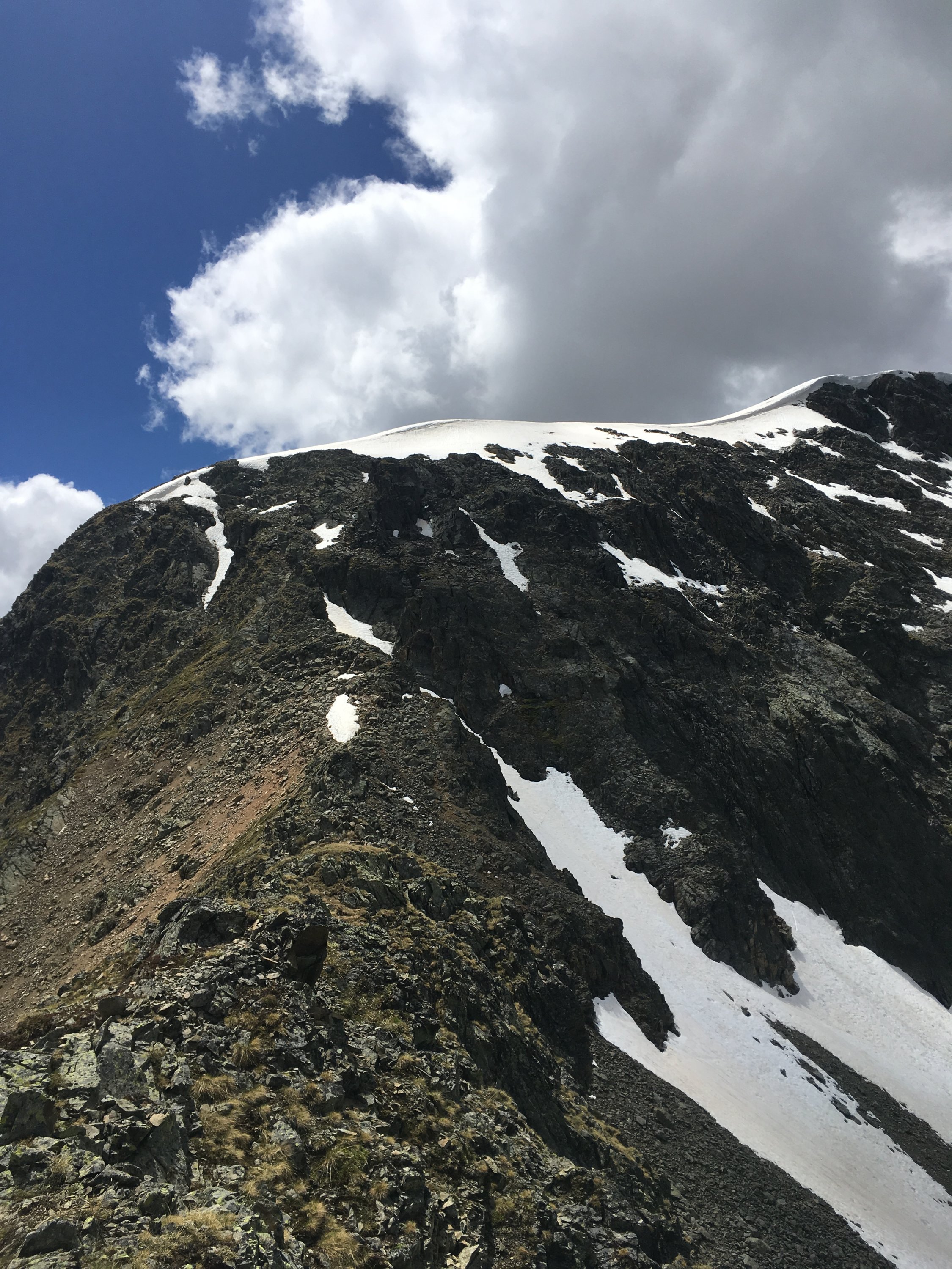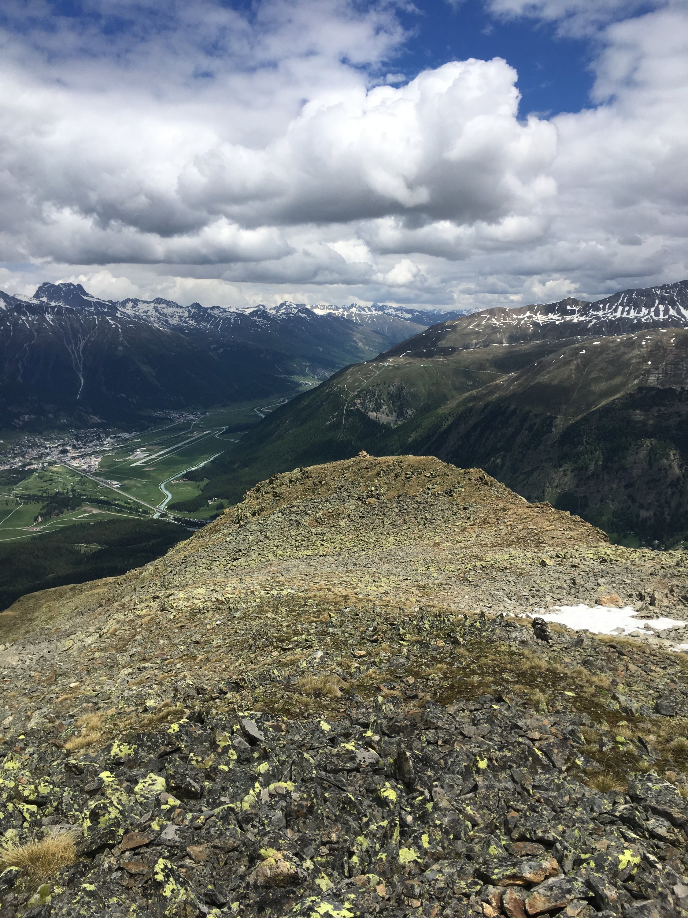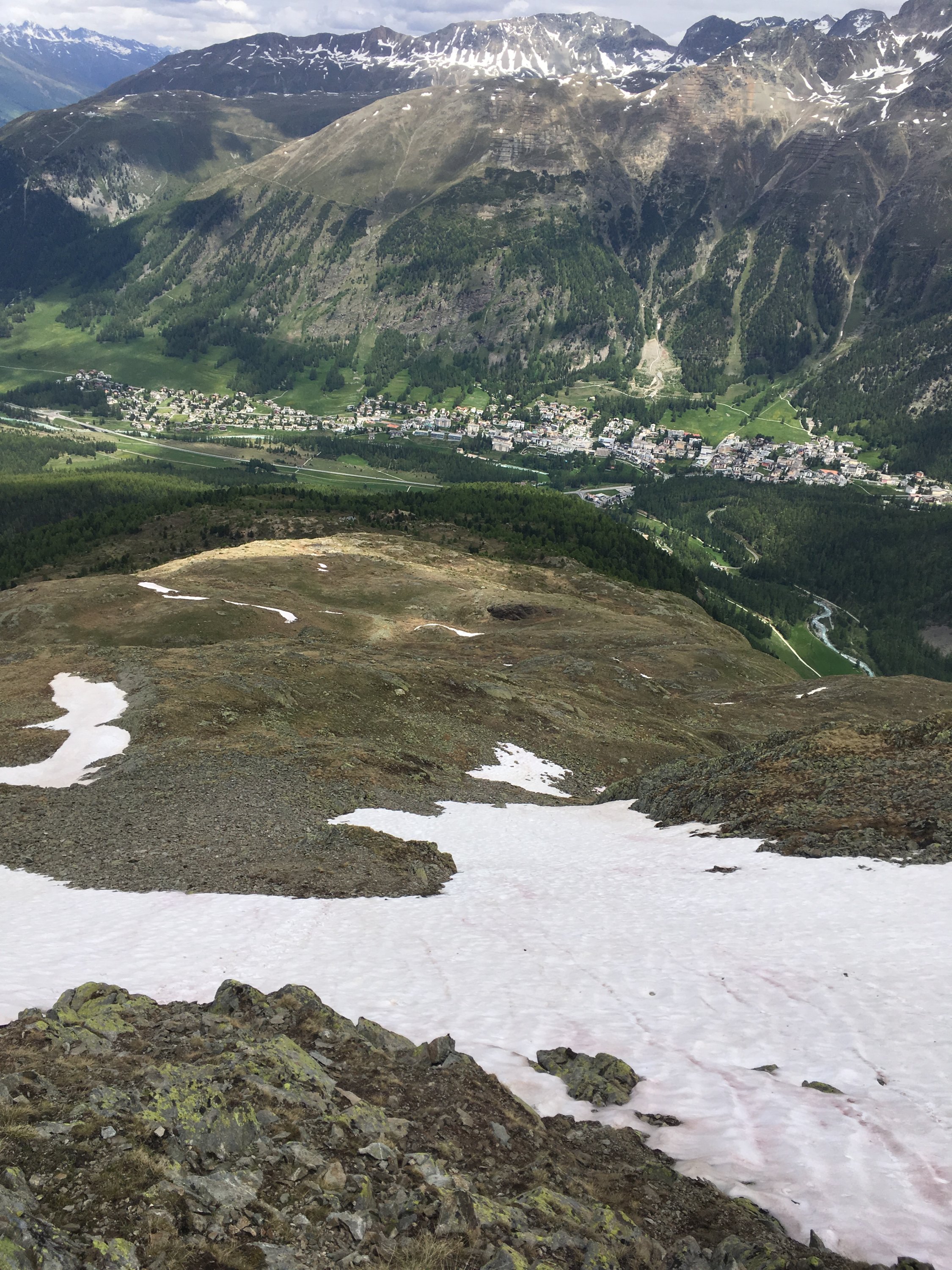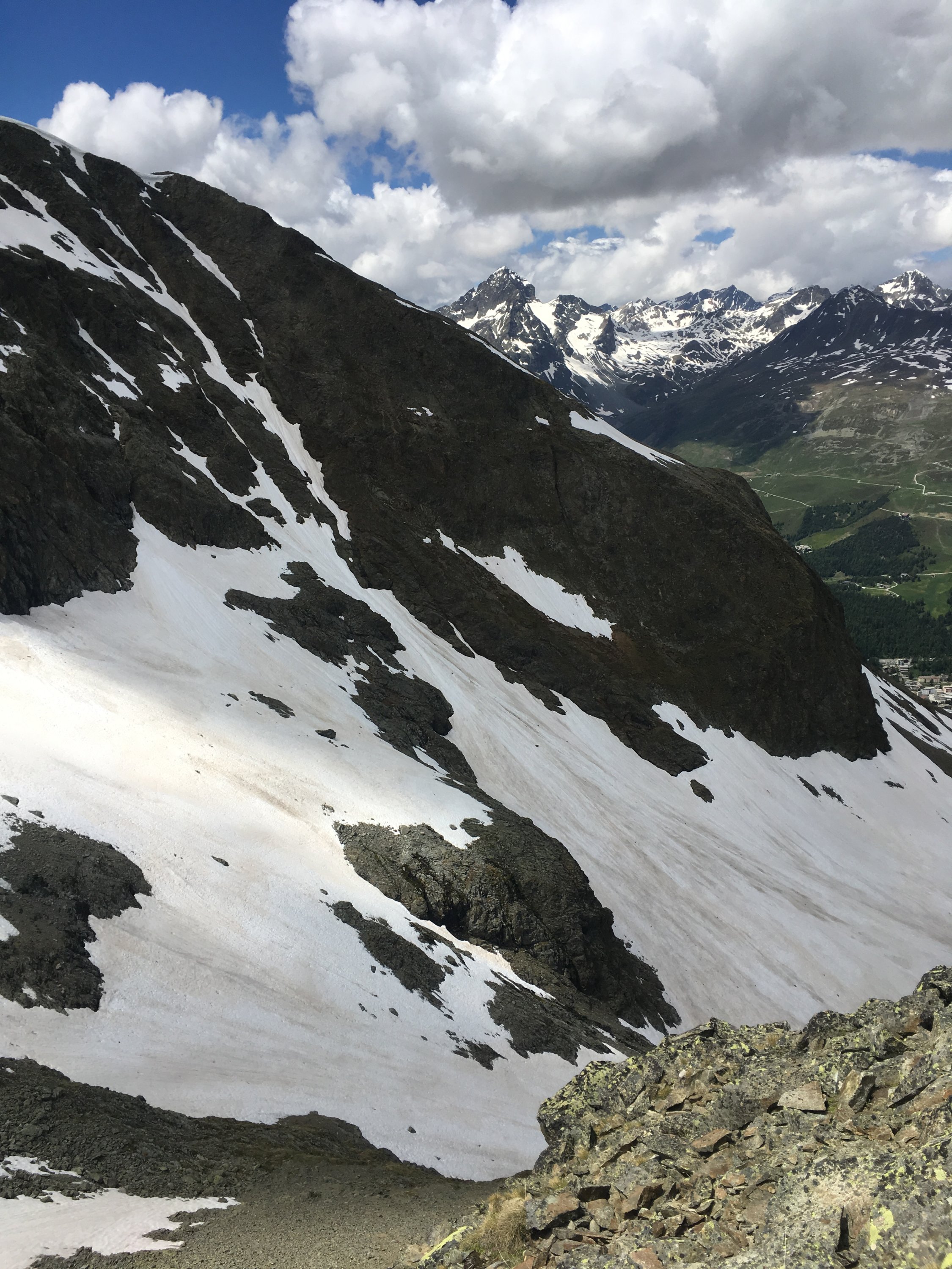 Start um 8 Uhr in Pontresina Bahnhof, 11 Grad, windstill. Ich bin die Direktroute über den Nord-Nordosthang auf den Gipfel gelangt. Sehr gute Bedingungen, nur ein Schneefeld am Bergfuss, aber weich und ohne Probleme. Der steile Nordhang/Nordosthang bietet einige Varianten, Schwierigkeit T5 und einige leichte Kletterstellen (I-II). Ich bin ab P. 2563 zuerst direkt steil südwärts hinauf und nachher Traverse Richtung Westen bis auf die Schulter des Piz Staz. Felsen meist fest und es hat immer Tritte in der grasdurchwachsenen Steilflanke. Teilweise etwas ausgesetzt. Ab Schulter ohne Schwierigkeiten auf den Gipfel.
