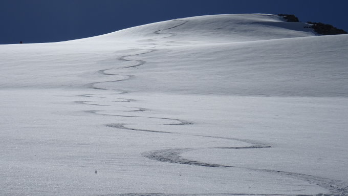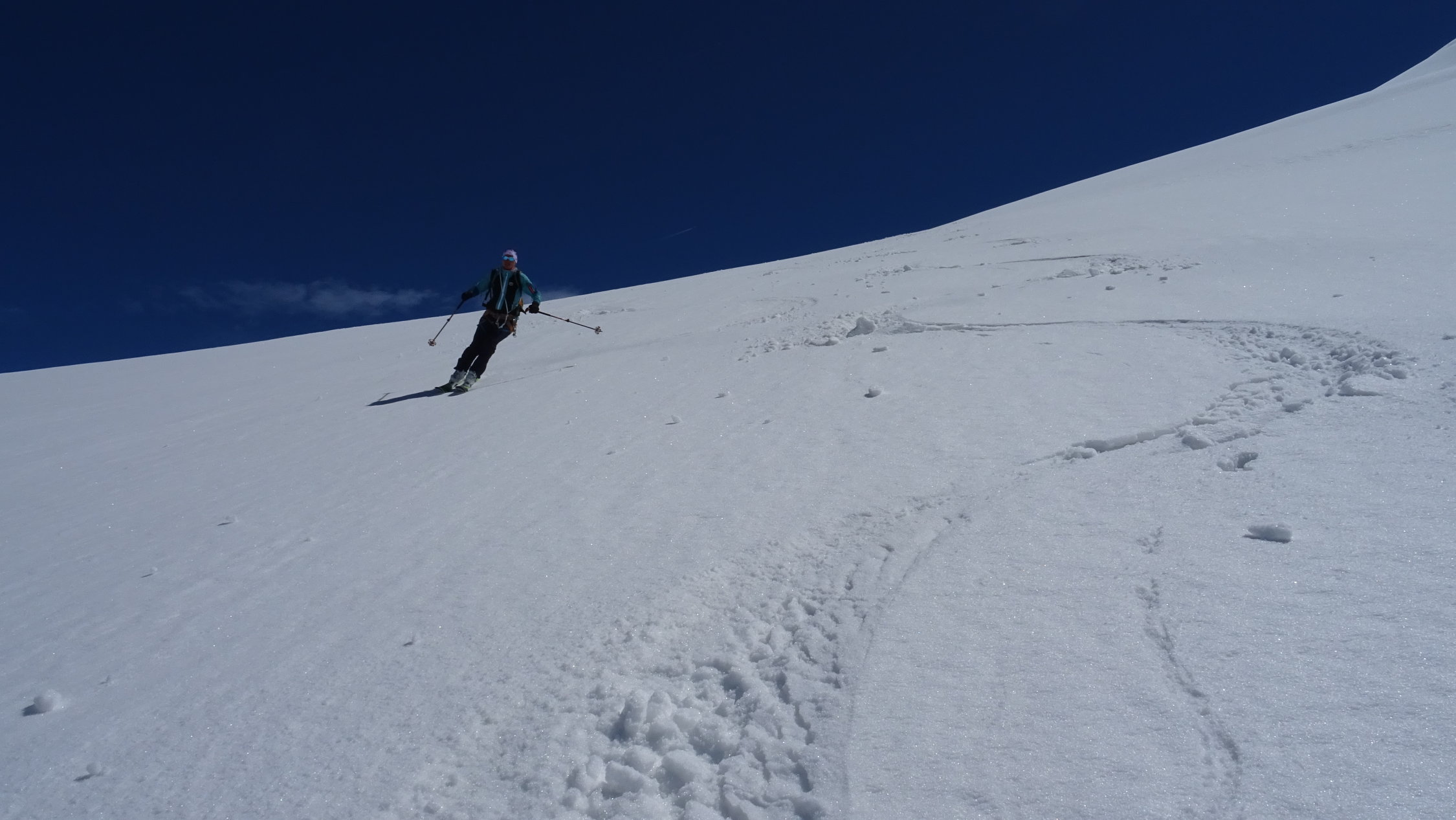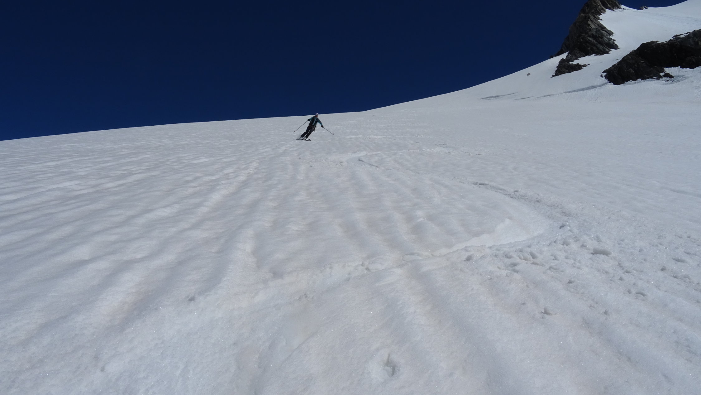 Abfahrt:Oberhalb 3300m guter Firn der knapp nicht einbricht,darunter schöner Sommersulz